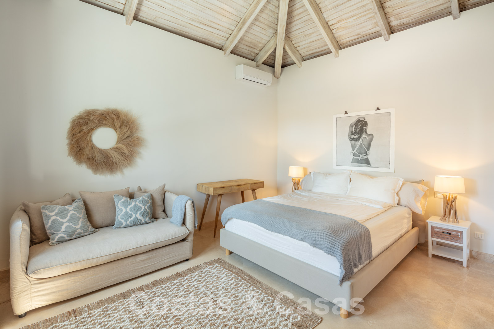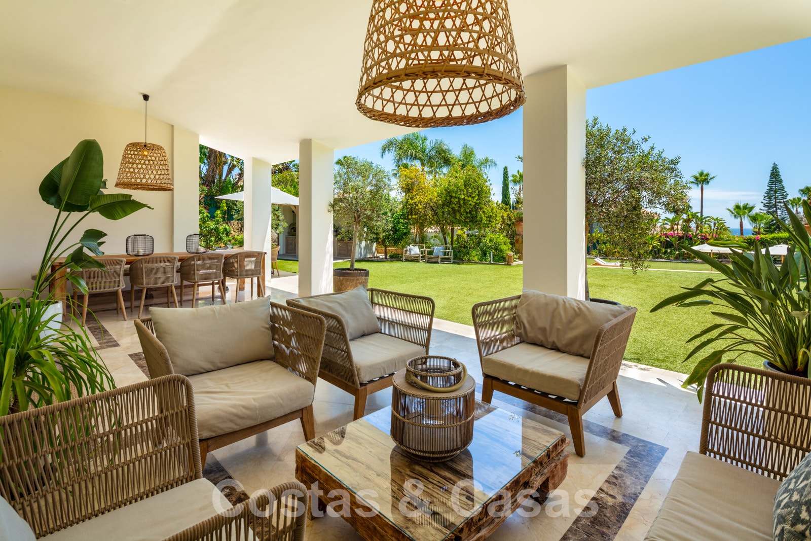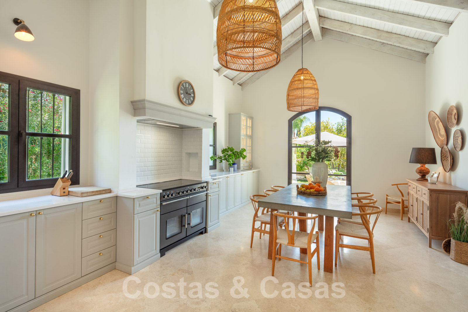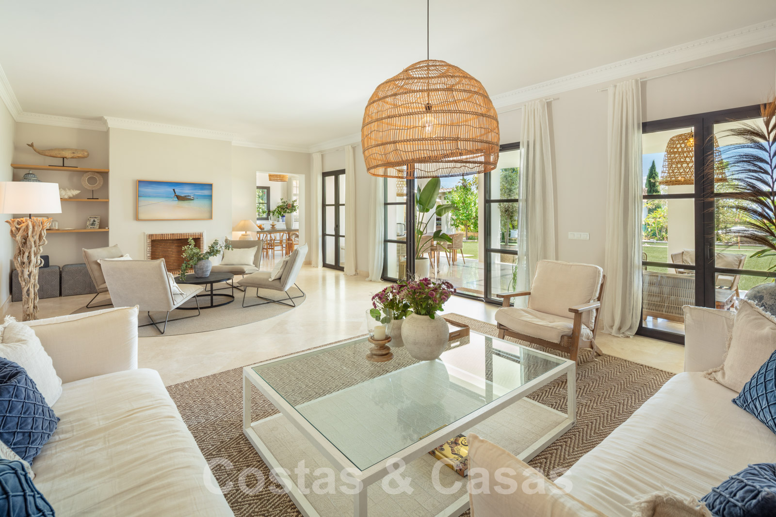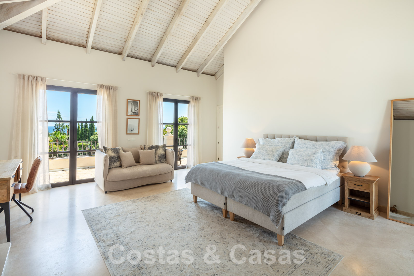 Villa individuelle de style méditerranéen. Finitions de haute qualité. Une palette de couleurs neutres et apaisantes avec des meubles élégants est combinée avec des intérieurs boho-chic. Plusieurs pièces sont dotées de hauts plafonds voûtés blancs, ce qui les rend très lumineuses et aérées. L'espace de vie ouvert est meublé de deux salons, dont l'un est situé près de la cheminée. Une cuisine rustique et fonctionnelle avec une table à manger se trouve à côté. 5 chambres à coucher avec 5 salles de bains attenantes. La suite principale est dotée d'un haut plafond à poutres apparentes, d'une cheminée traditionnelle et d'un accès à une terrasse privée avec la Méditerranée à l'horizon. Garage intérieur pour 2 voitures.