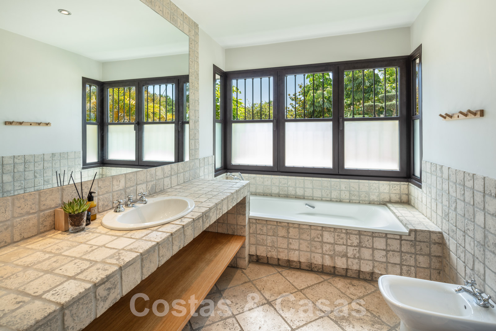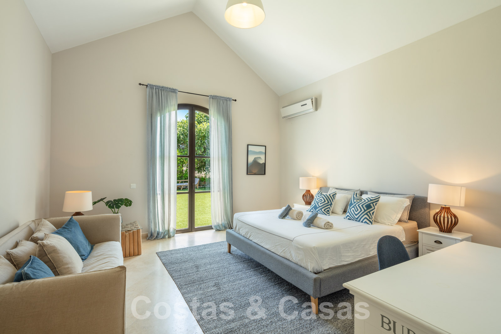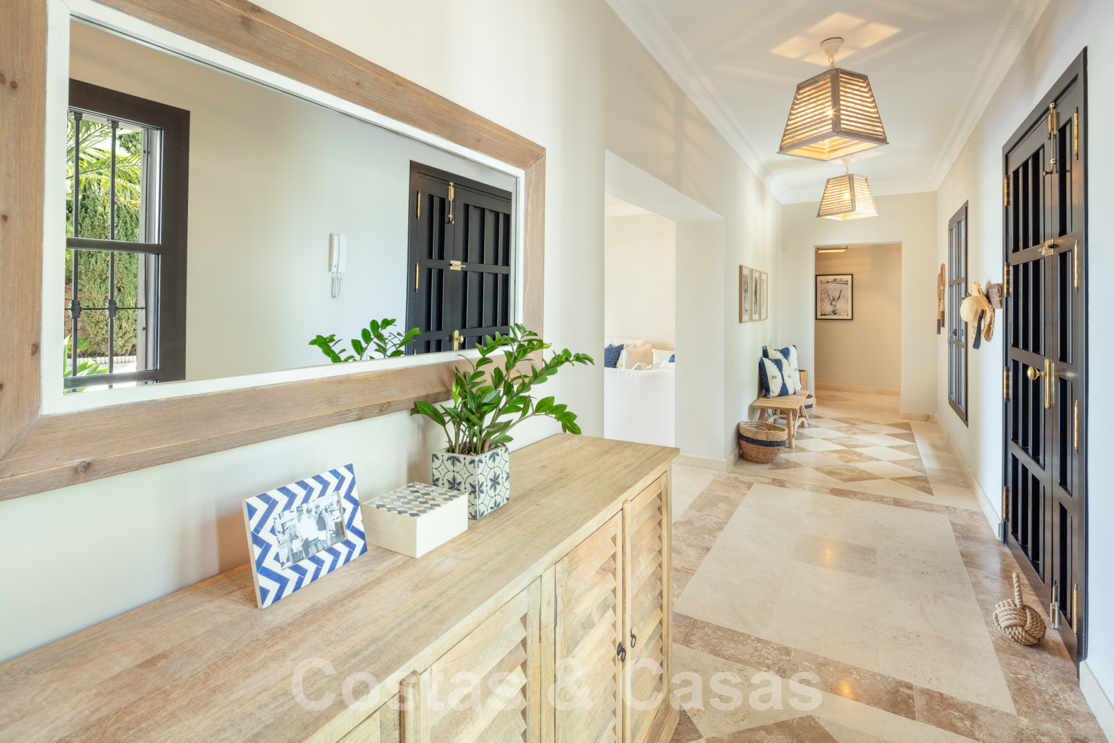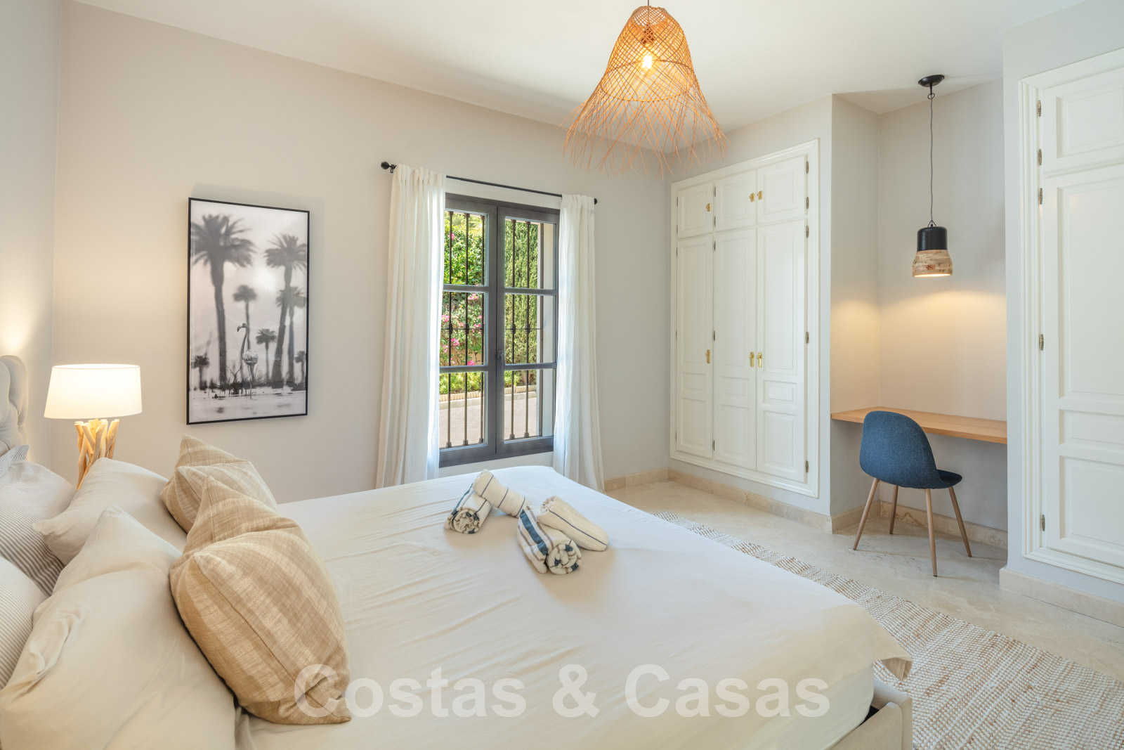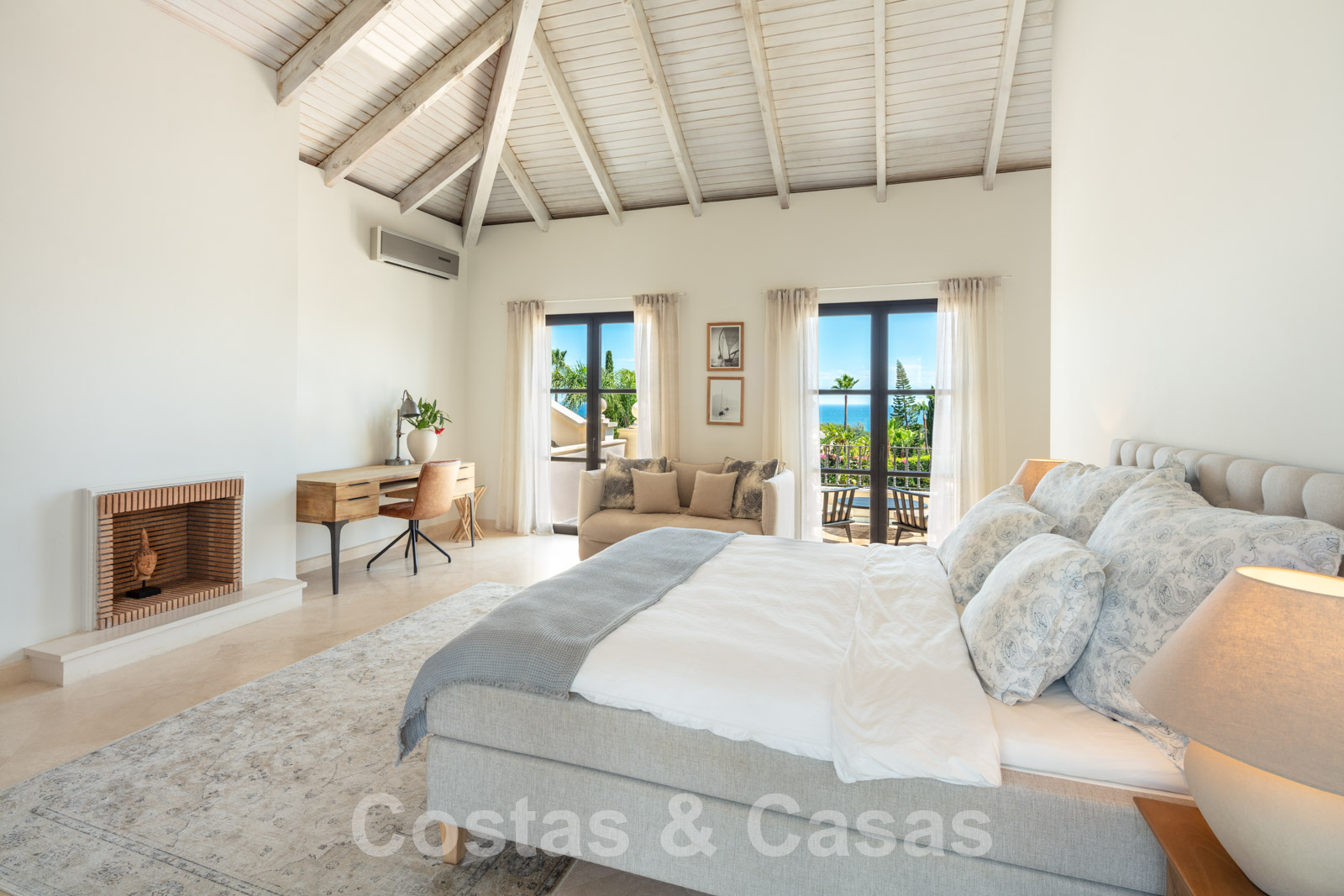 Sols en marbre de couleur crème. Climatisation. Cheminée. Armoires encastrées.