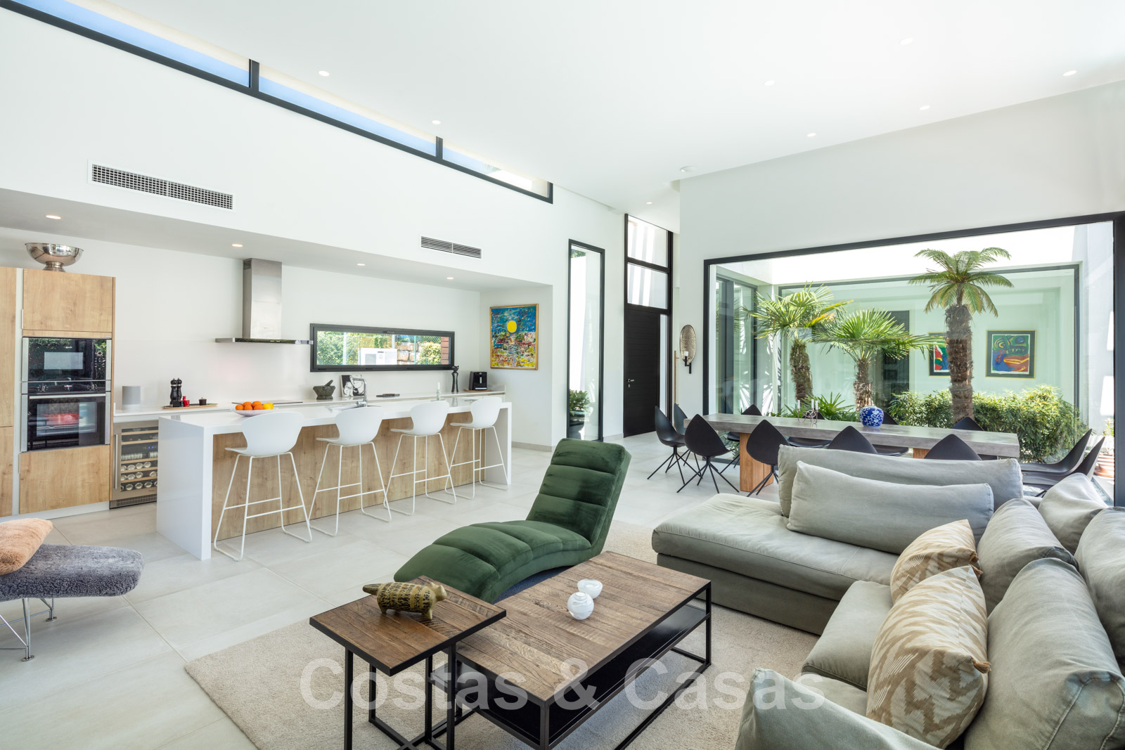 Un patio entièrement entouré de fenêtres offre un éclairage naturel.