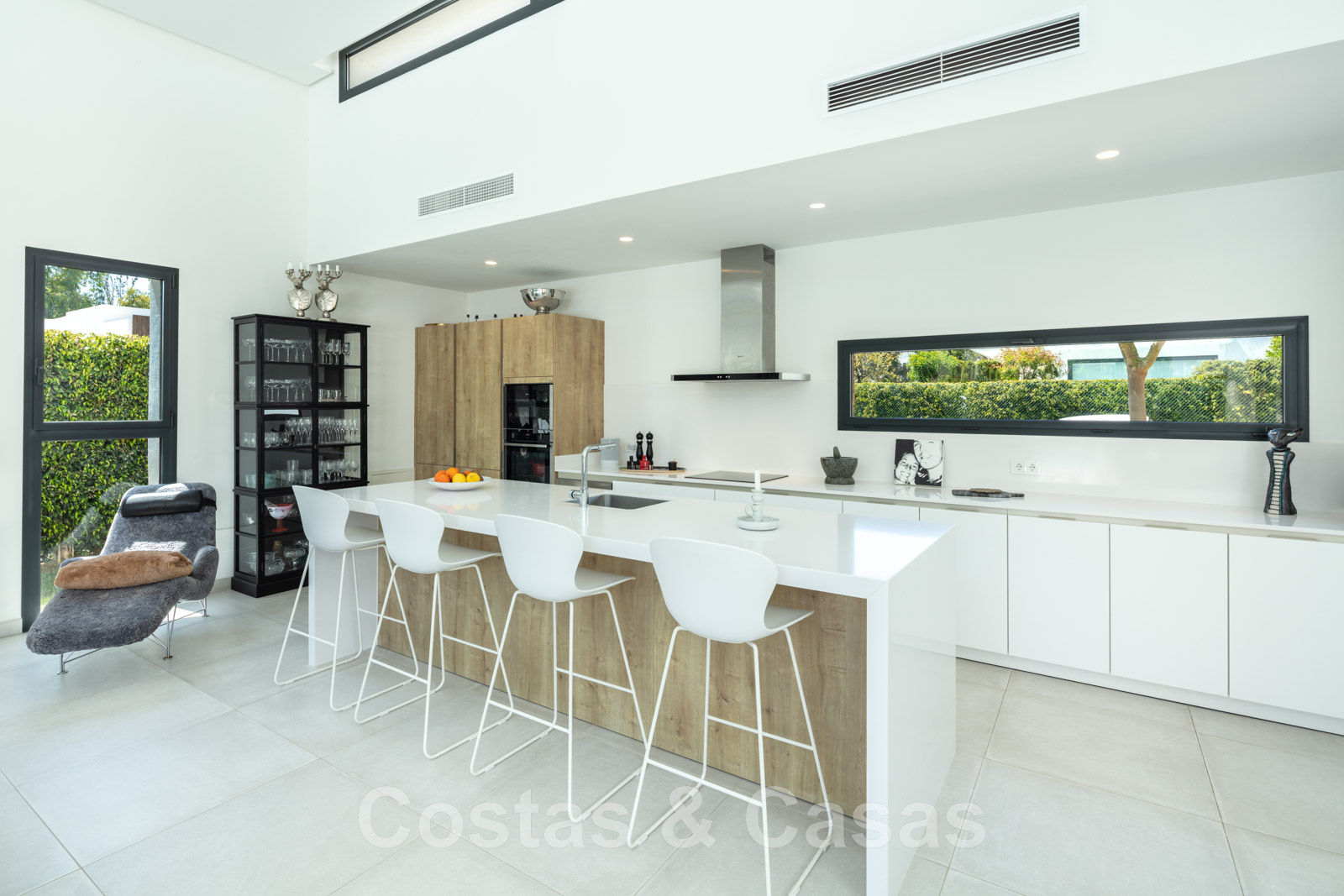 Cuisine entièrement équipée avec des appareils NEFF, un refroidisseur de vin et un îlot avec des sièges.