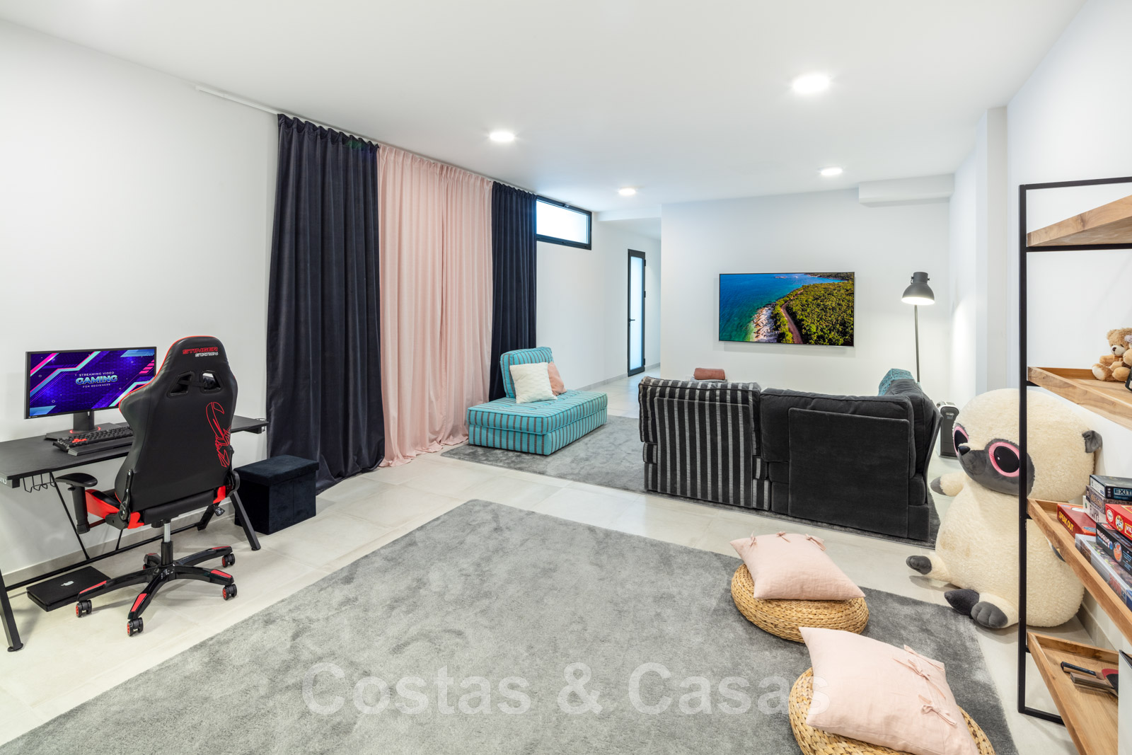 Grande pièce de 53 m² pouvant être utilisée comme salle de détente, salle de jeux ou home cinéma avec chillout.