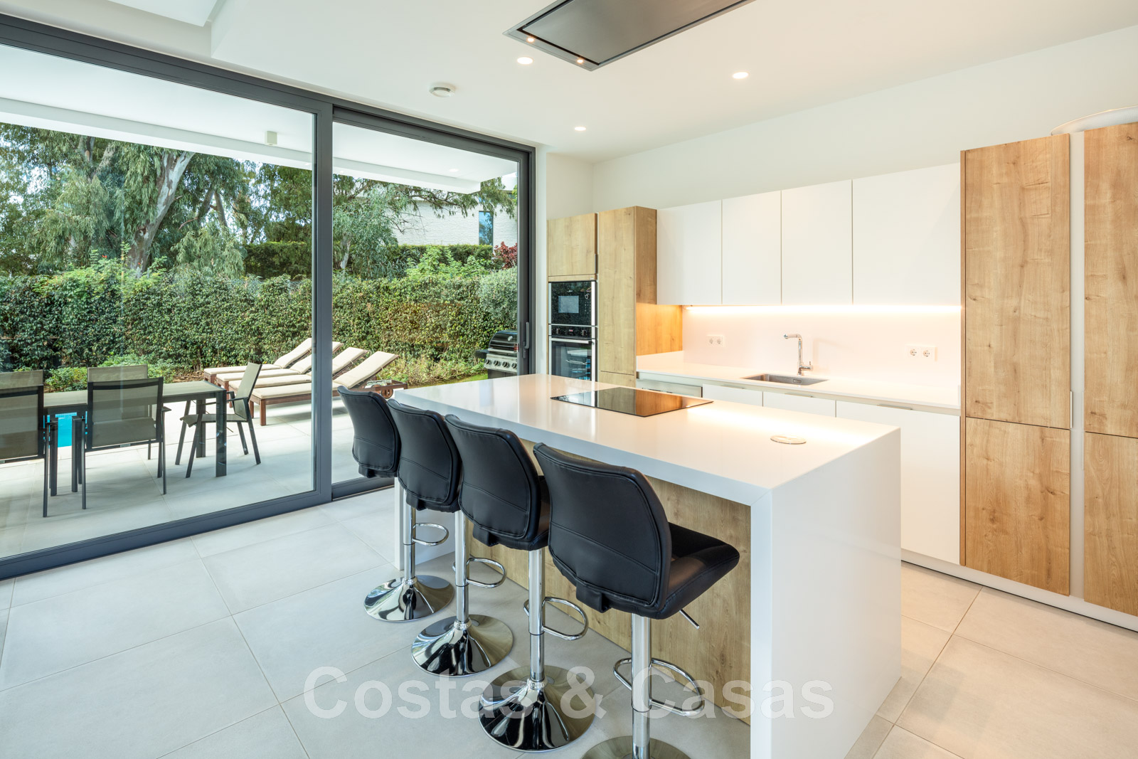 Terrasse couverte adjacente avec coin barbecue avec table à manger et chillout.