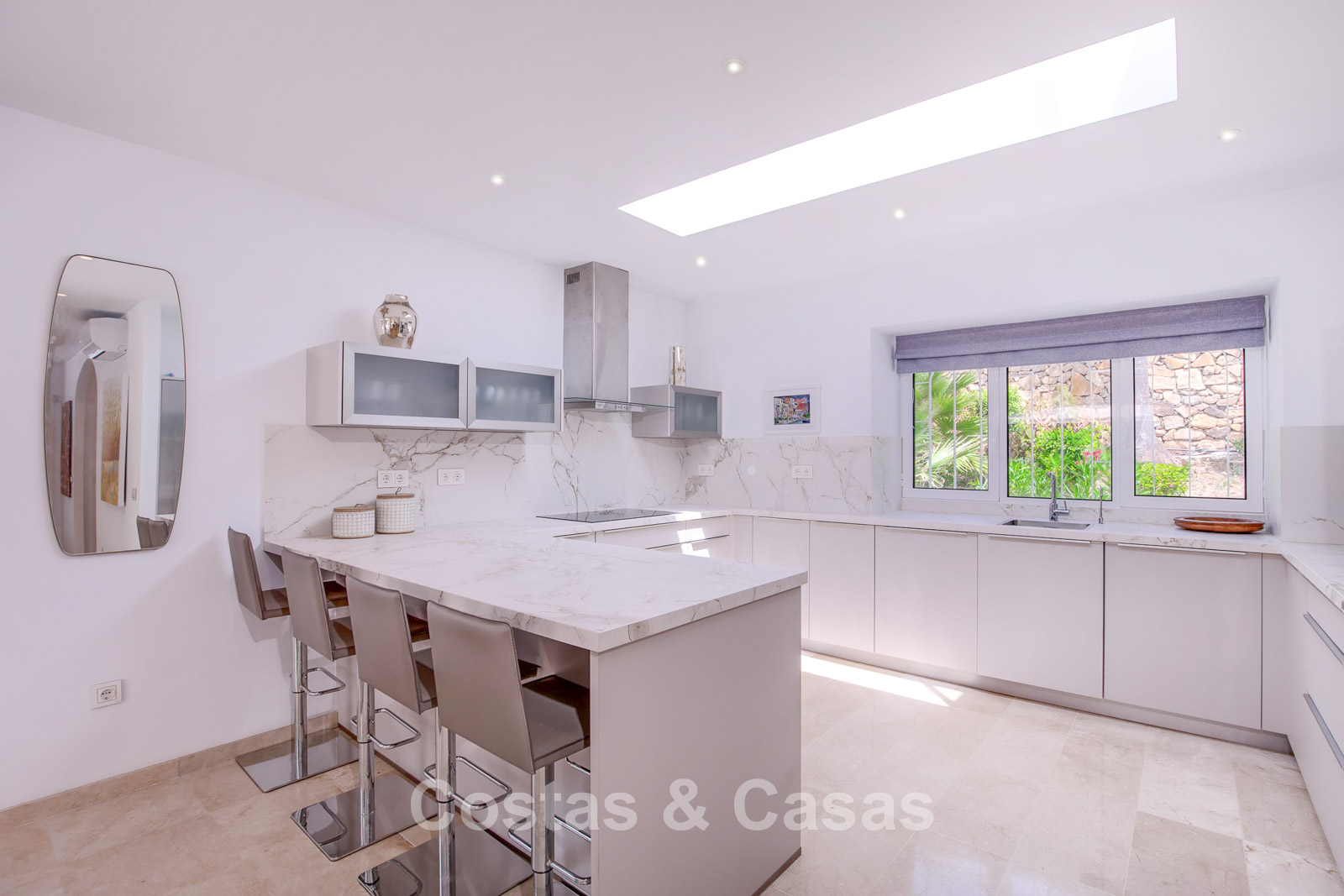 Une cuisine moderne et ouverte, entièrement équipée d'appareils électroménagers de qualité et d'un bar à petit-déjeuner.