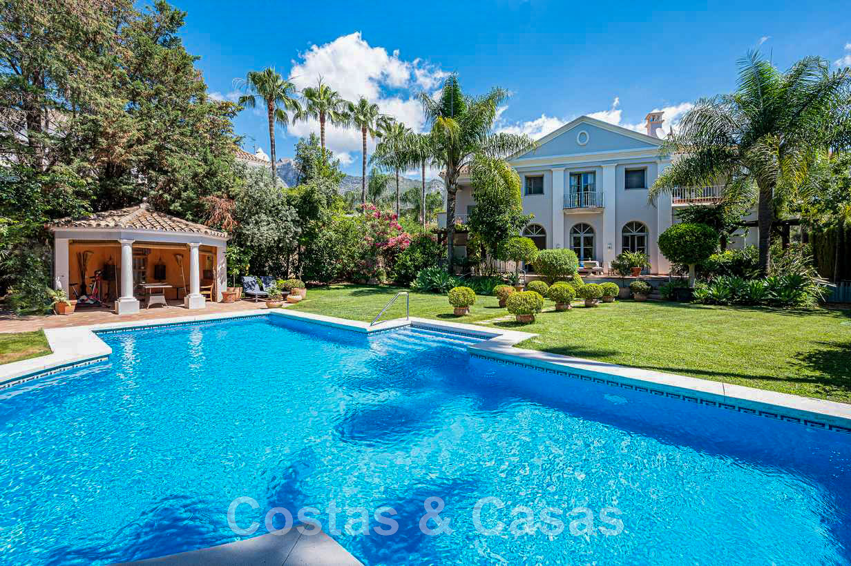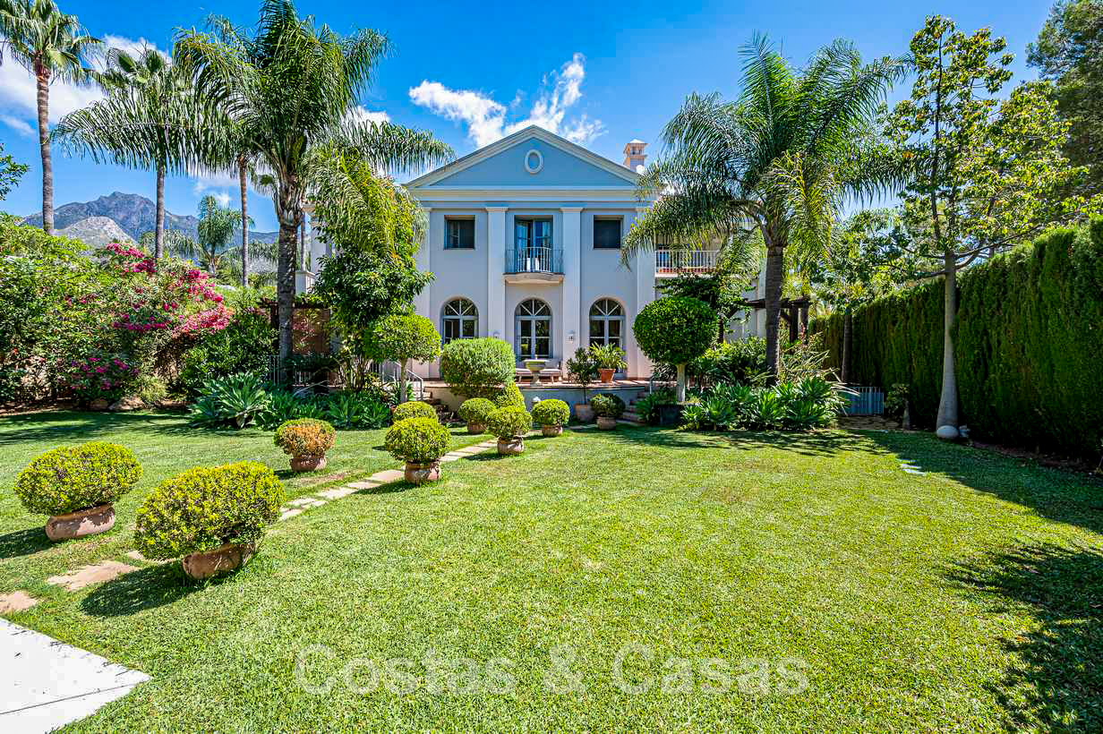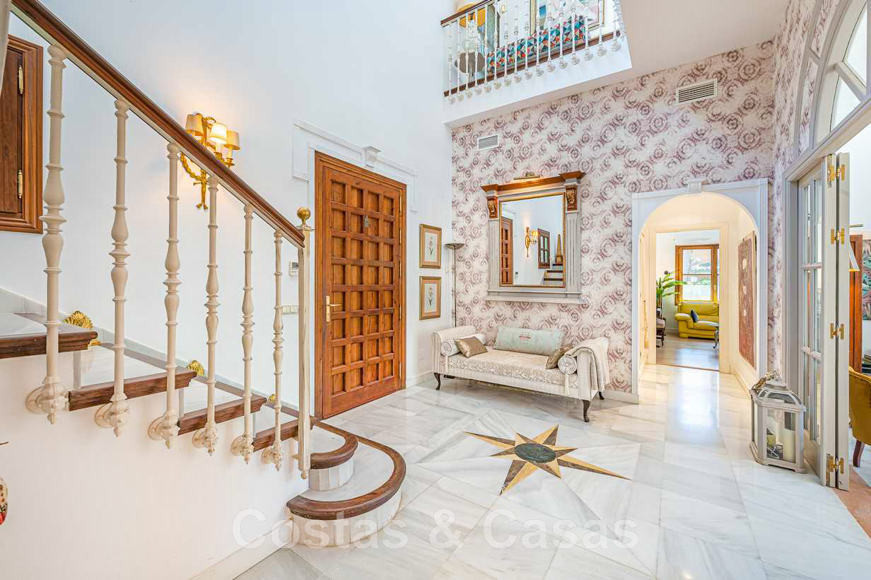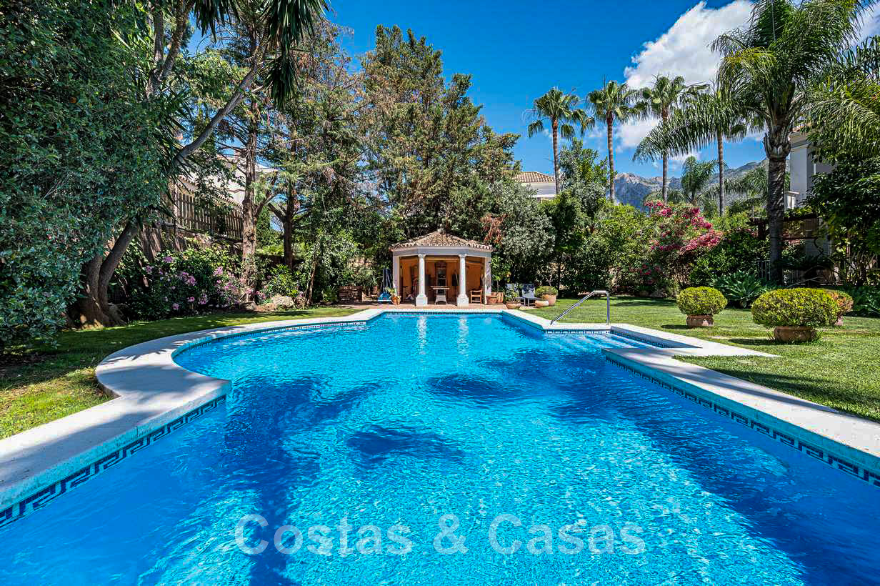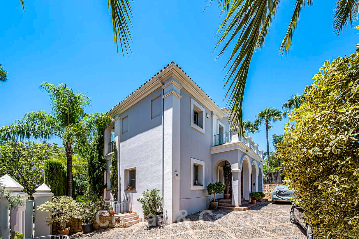 Villa familiale romantique de style classique à vendre, dans l'un des quartiers résidentiels les plus exclusifs et protégés de la Golden Mile de Marbella