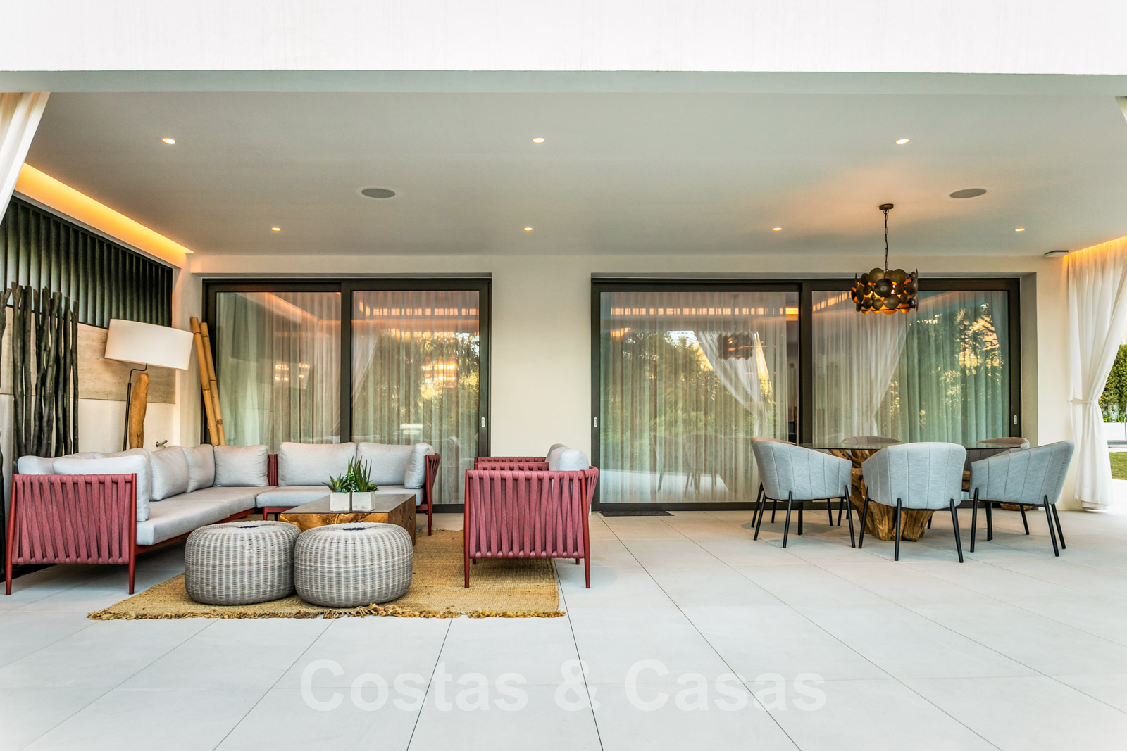 Spacieuse terrasse couverte, joliment meublée avec salon et table à manger.