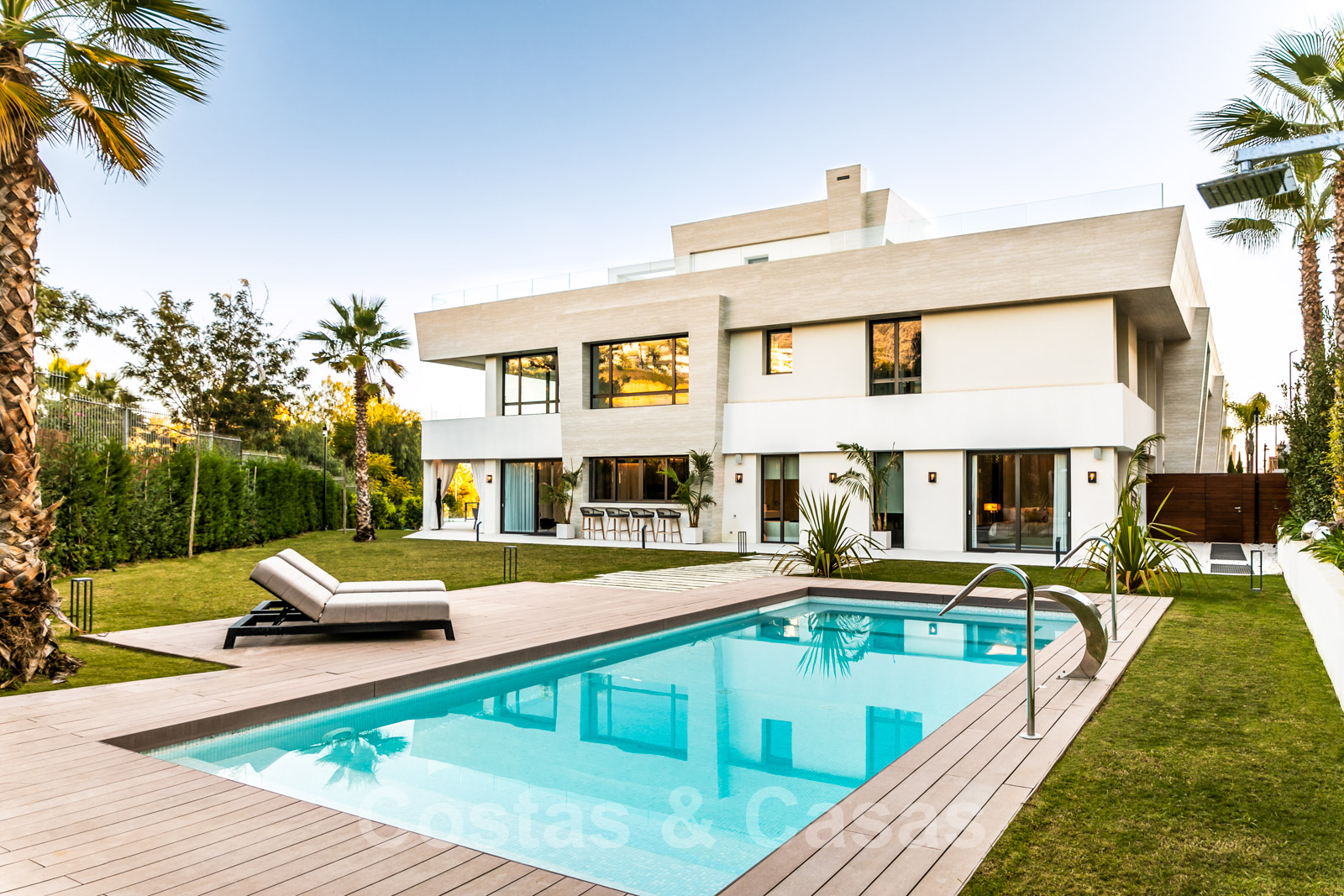 Le complexe résidentiel dispose d'un jardin commun entretenu avec plusieurs piscines entourées d'une terrasse et de chaises longues.