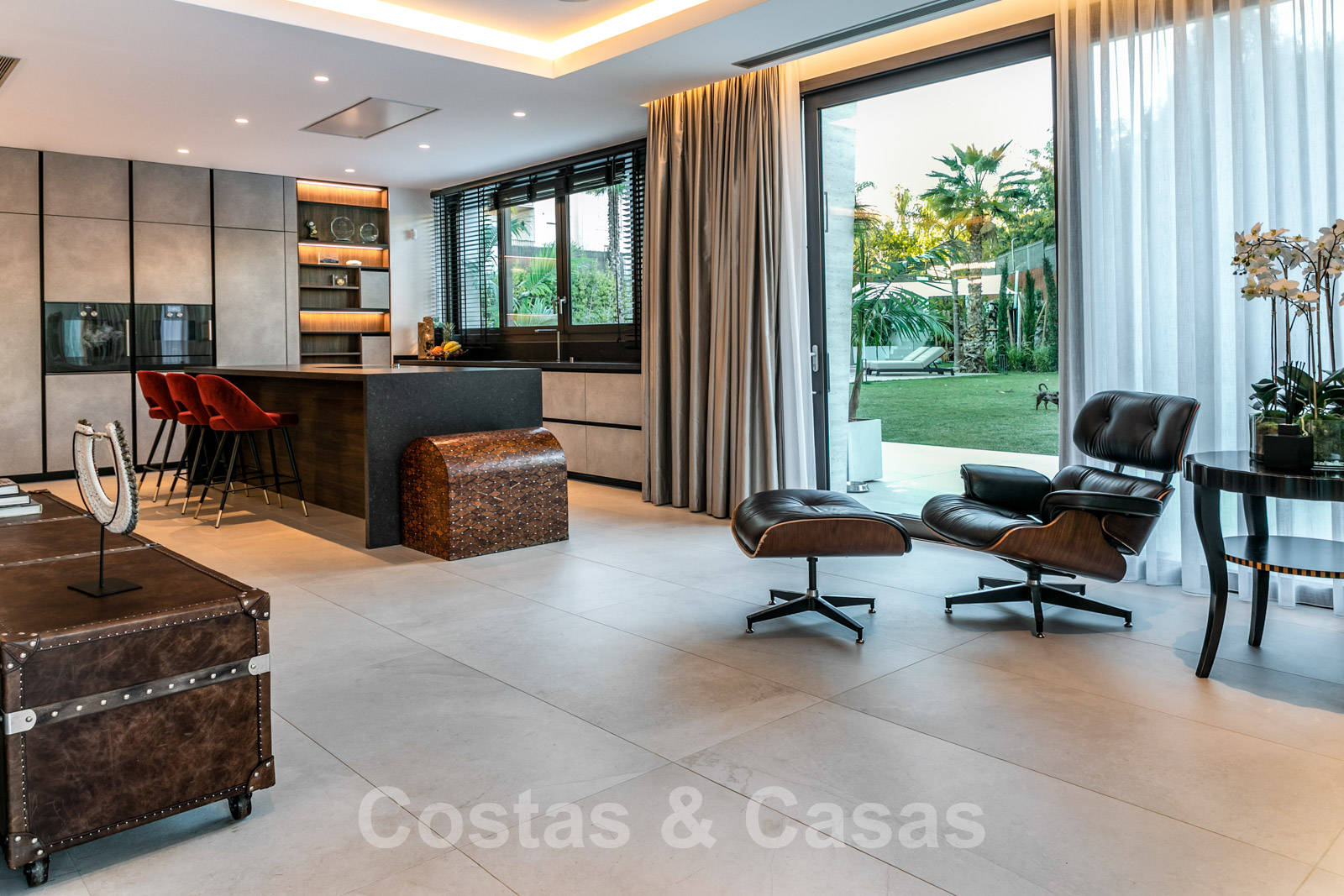 Cuisine ouverte de qualité, entièrement équipée d'appareils Gaggenau et d'un îlot de cuisson.