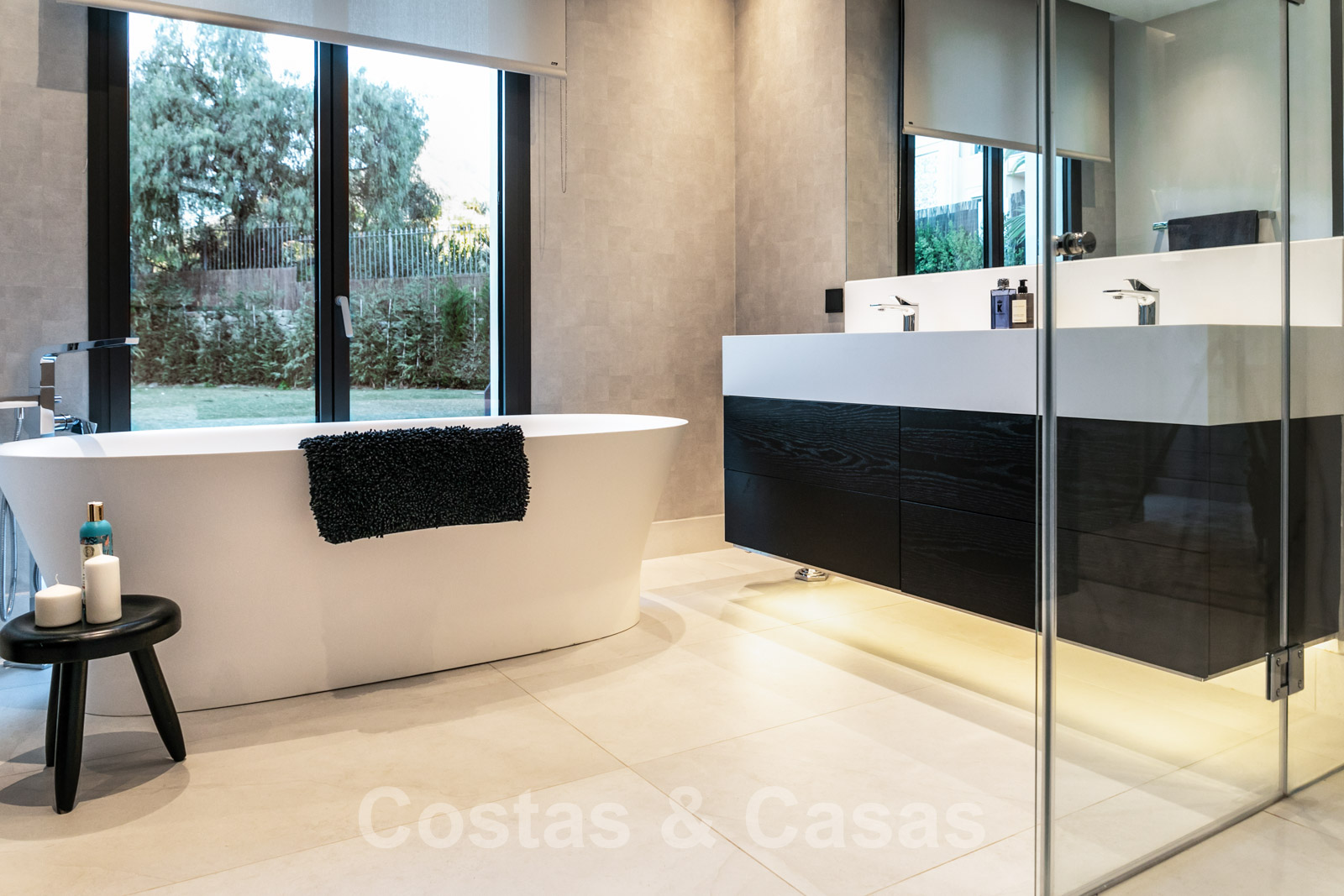 Belle chambre principale en-suite avec dressing, salle de bain équipée d'une baignoire, double lavabo et douche à effet pluie et également un accès direct à la terrasse latérale.