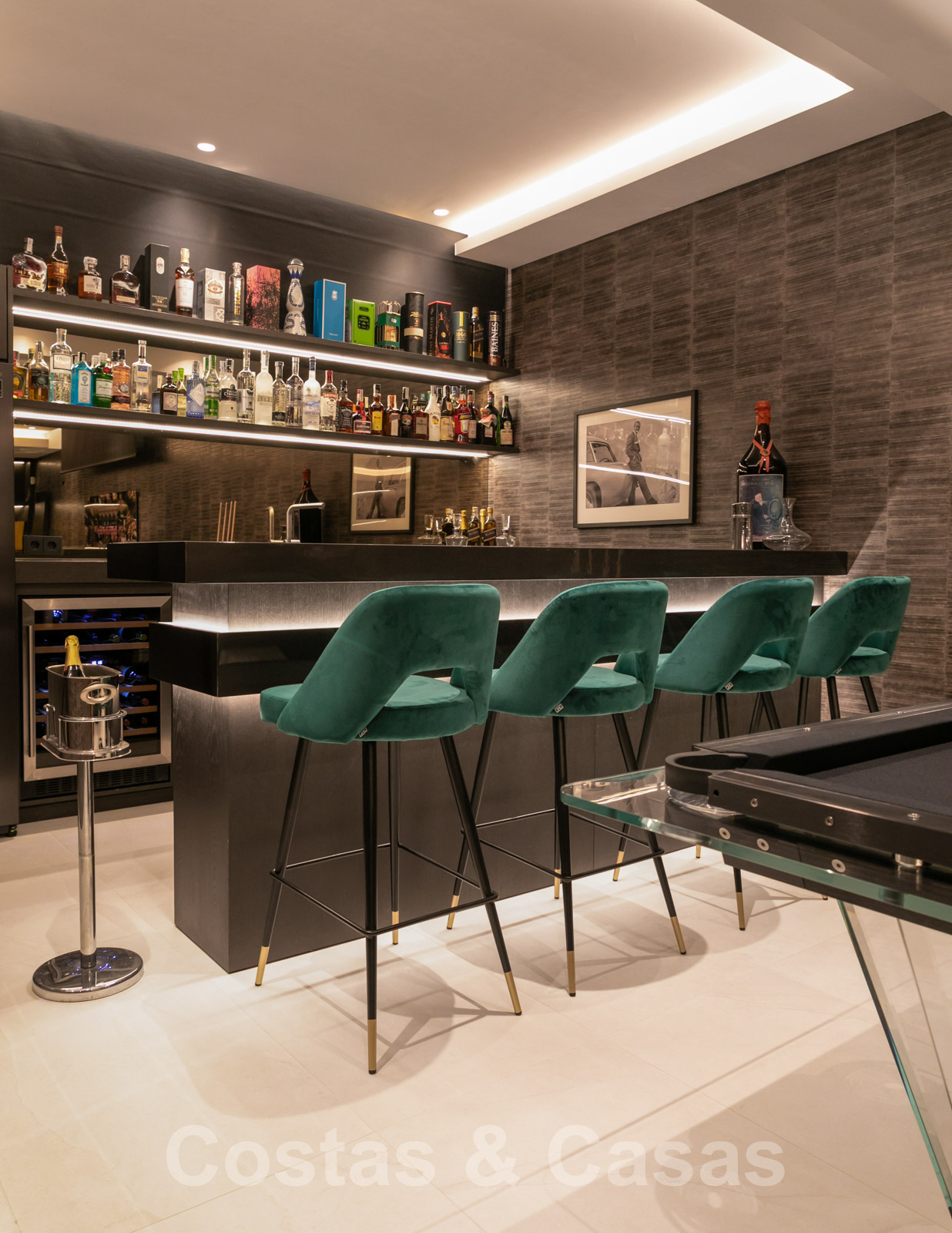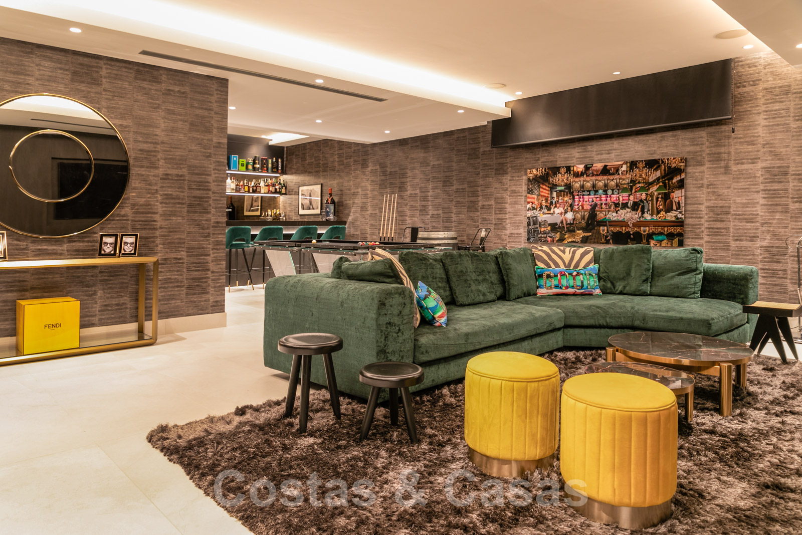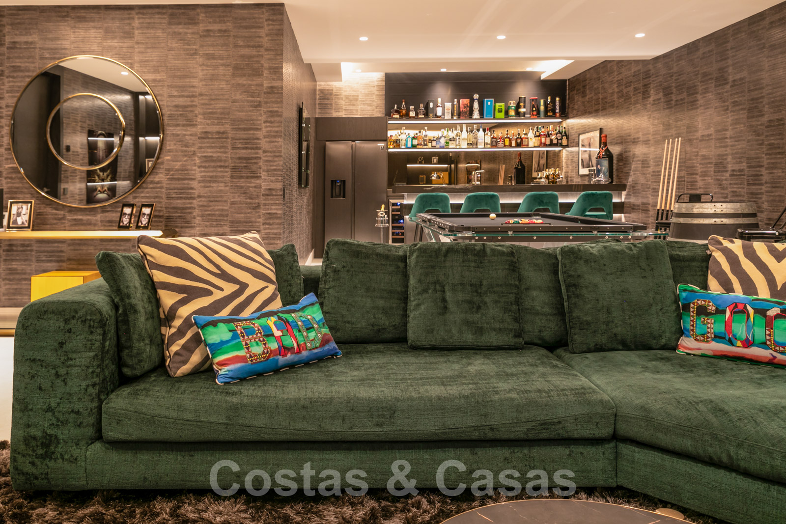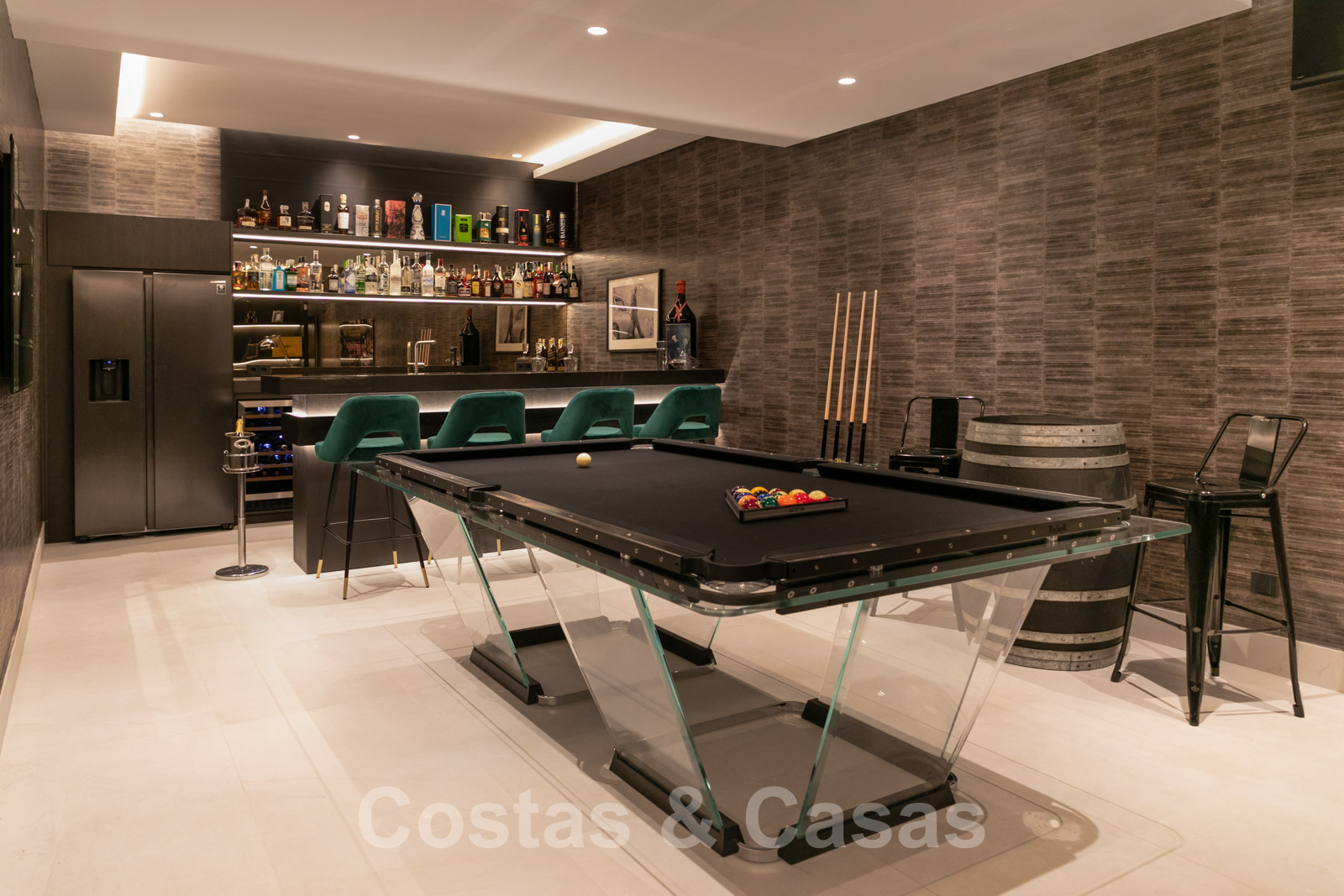 A l'étage inférieur une "mancave" avec une table de billard vintage, un bar et un salon TV.