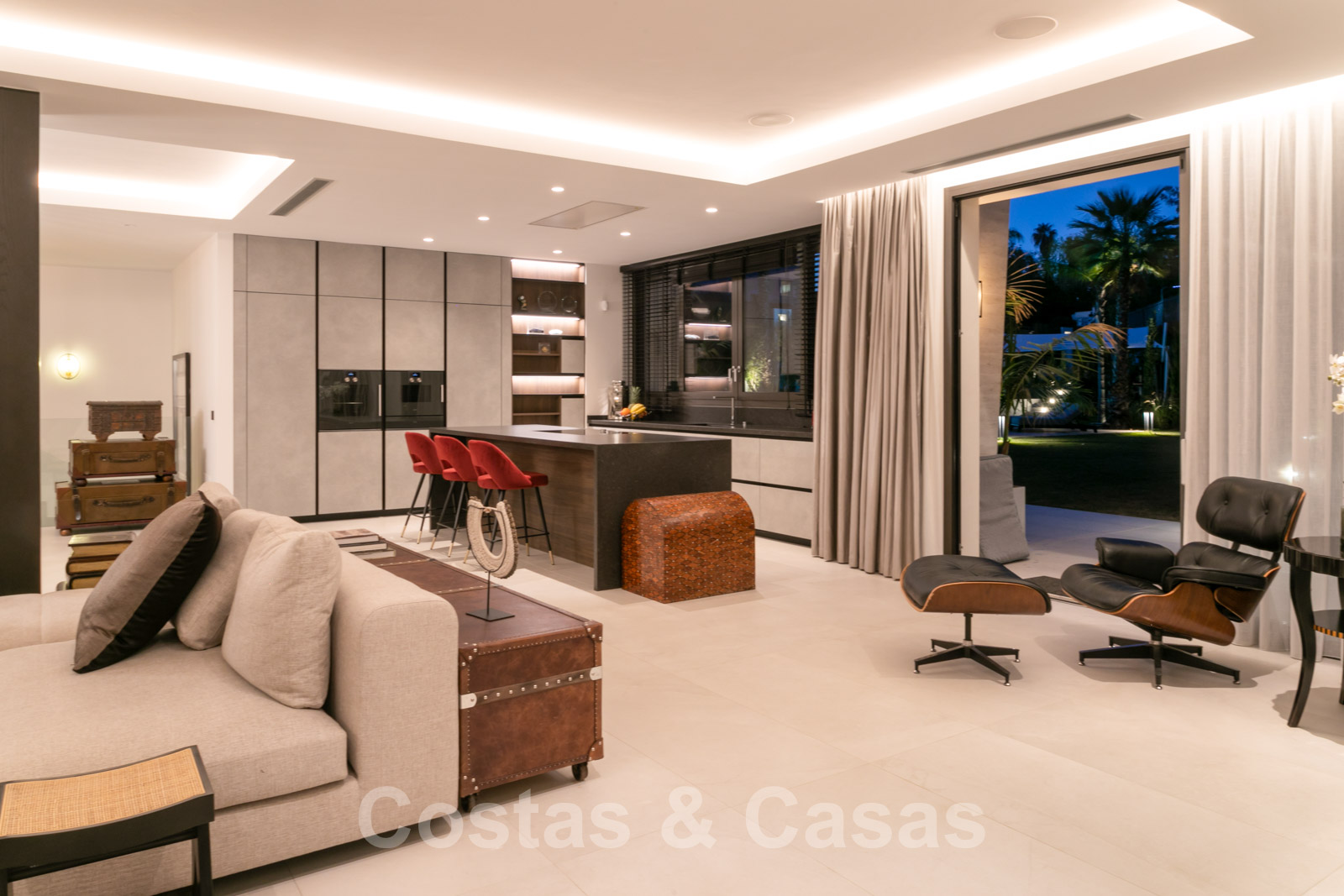 Espace de vie ouvert avec un salon intégré décoré d'une cheminée moderne et de finitions en marbre.