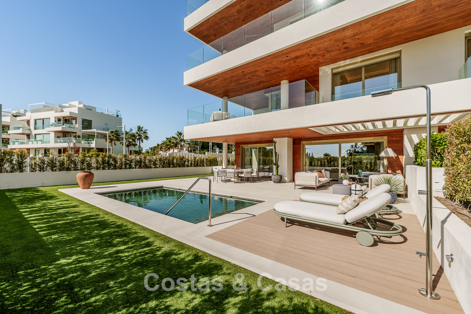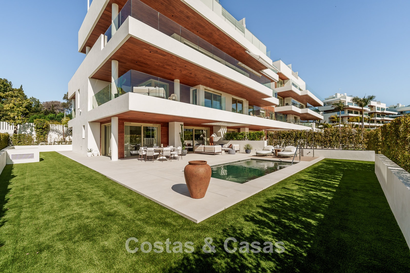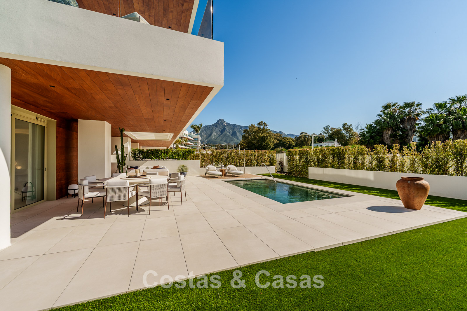 Appartement ultra-luxueux de 3 étages, situé au rez-de-chaussée. Situé dans un complexe de 28 appartements et penthouses. Design contemporain et élégant, avec un intérieur exceptionnel et des matériaux de haute qualité et des équipements haut de gamme. Orientation sud-est. Vue sur les environs et le sommet de la Concha. Jardin privé clos avec piscine chauffée. Terrasses spacieuses, idéales pour profiter du microclimat agréable toute l'année. De hautes baies vitrées coulissantes avec châssis encastrés offrent un accès direct aux espaces extérieurs. Séjour ouvert avec salon et salle à manger intégrée. Cuisine entièrement équipée avec îlot central et bar. 4 chambres, 4 salles de bains et une toilette séparée pour les visiteurs. Sols carrelés en grès cérame grand format. 3 places de parking privées et un grand débarras sont inclus.