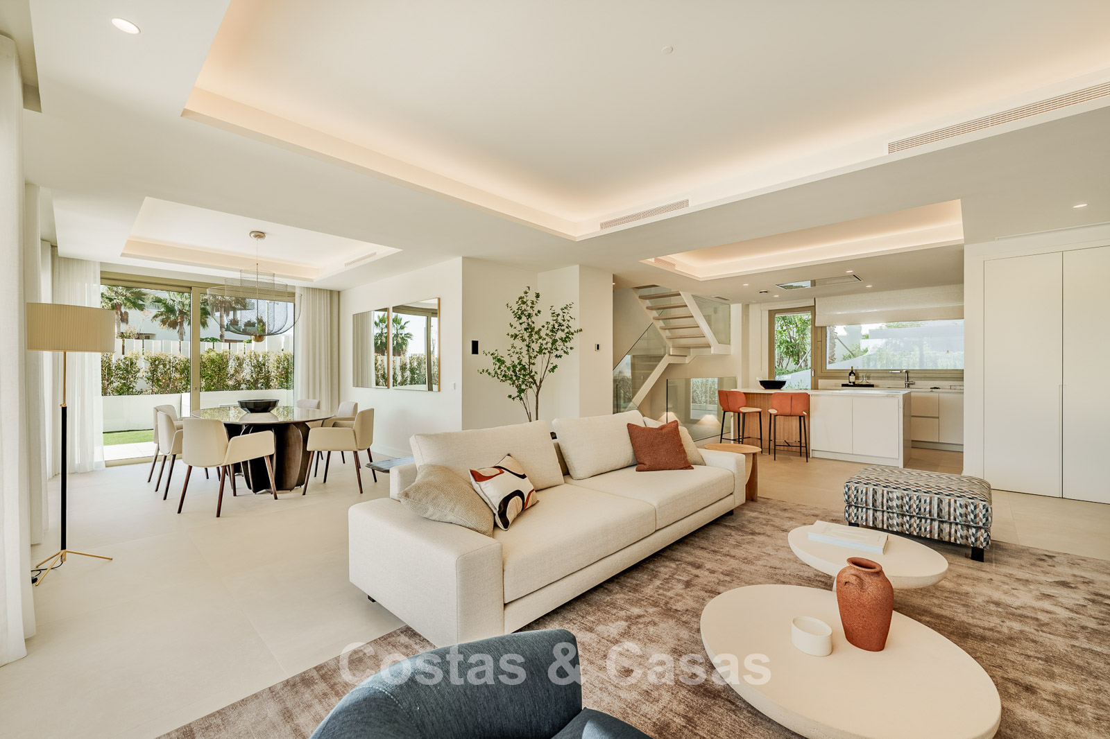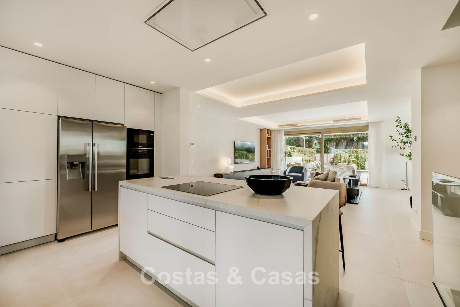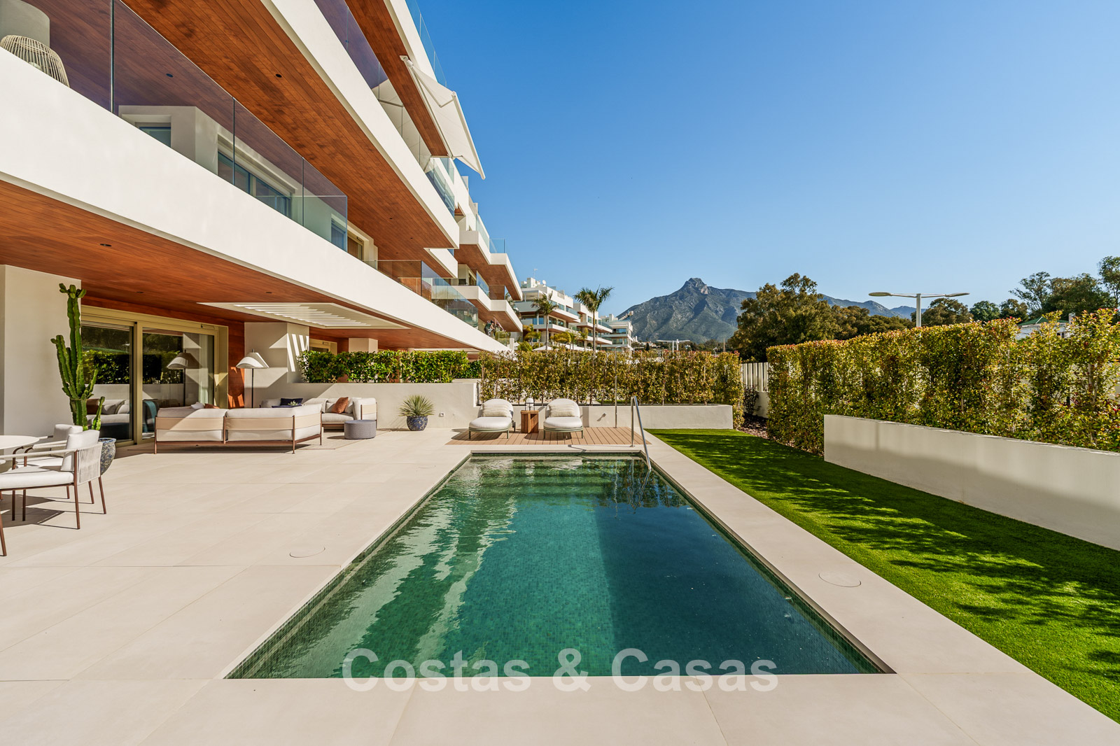 Appartement ultra-luxueux de 3 étages, situé au rez-de-chaussée. Situé dans un complexe de 28 appartements et penthouses. Design contemporain et élégant, avec un intérieur exceptionnel et des matériaux de haute qualité et des équipements haut de gamme. Orientation sud-est. Vue sur les environs et le sommet de la Concha. Jardin privé clos avec piscine chauffée. Terrasses spacieuses, idéales pour profiter du microclimat agréable toute l'année. De hautes baies vitrées coulissantes avec châssis encastrés offrent un accès direct aux espaces extérieurs. Séjour ouvert avec salon et salle à manger intégrée. Cuisine entièrement équipée avec îlot central et bar. 4 chambres, 4 salles de bains et une toilette séparée pour les visiteurs. Sols carrelés en grès cérame grand format. 3 places de parking privées et un grand débarras sont inclus.