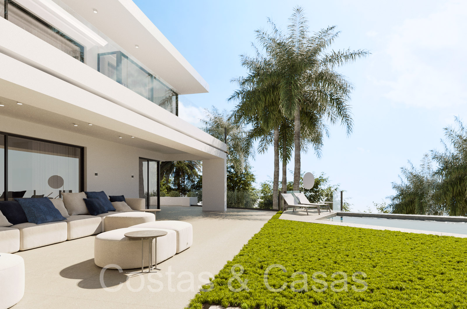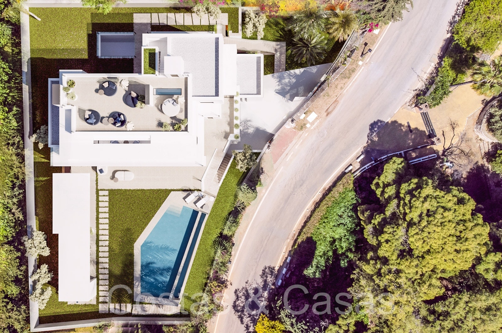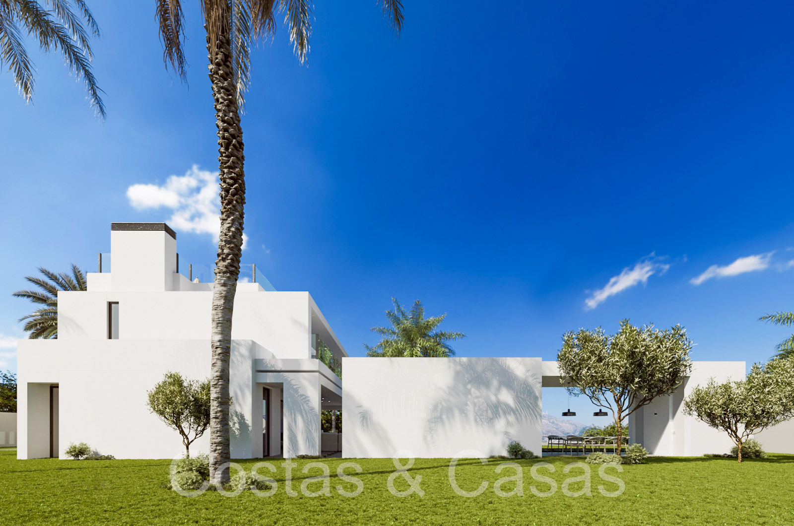 Située sur un terrain spacieux et protégé. Jardin paysager bien entretenu avec verdure tropicale et pelouse. Piscine à débordement avec une terrasse ensoleillée adjacente. Cuisine extérieure avec barbecue, coin repas en plein air. Les terrasses ensoleillées et ombragées offrent la possibilité de profiter de l'agréable climat méditerranéen. Un grand solarium offre un espace supplémentaire pour les lounges. Vue sur les environs, vue mer panoramique depuis le solarium.