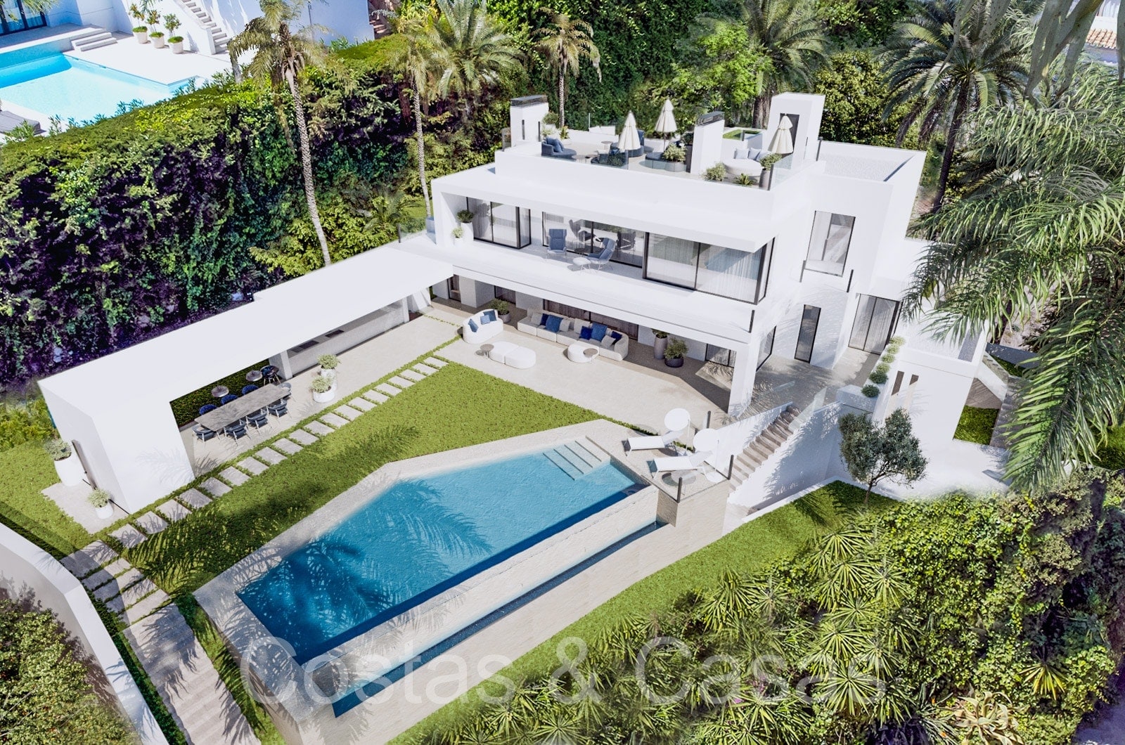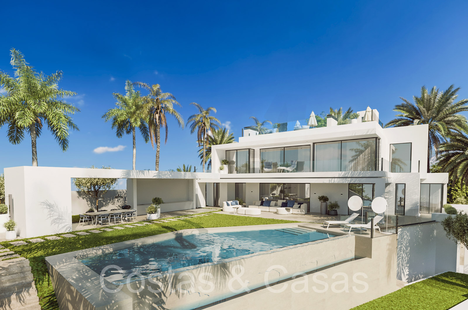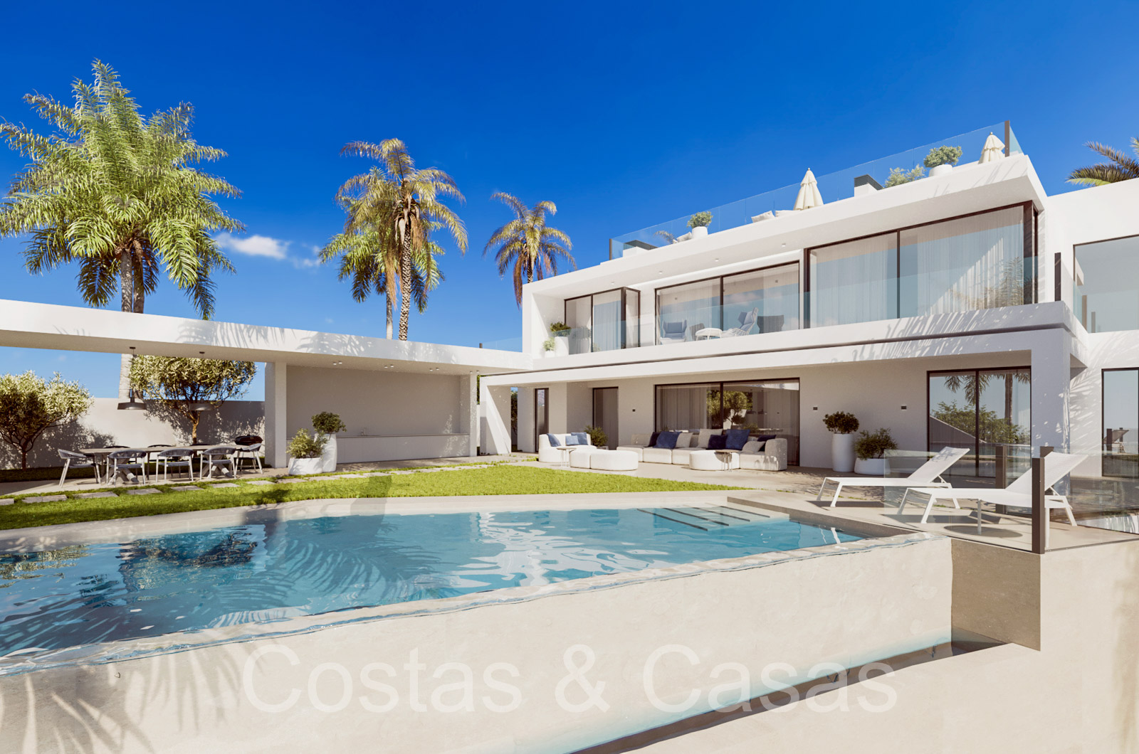 Autres caractéristiques: Ascenseur à tous les étages. Armoires intégrées. Balustrades en verre. Douche extérieure. Cheminée. Éclairage LED.
