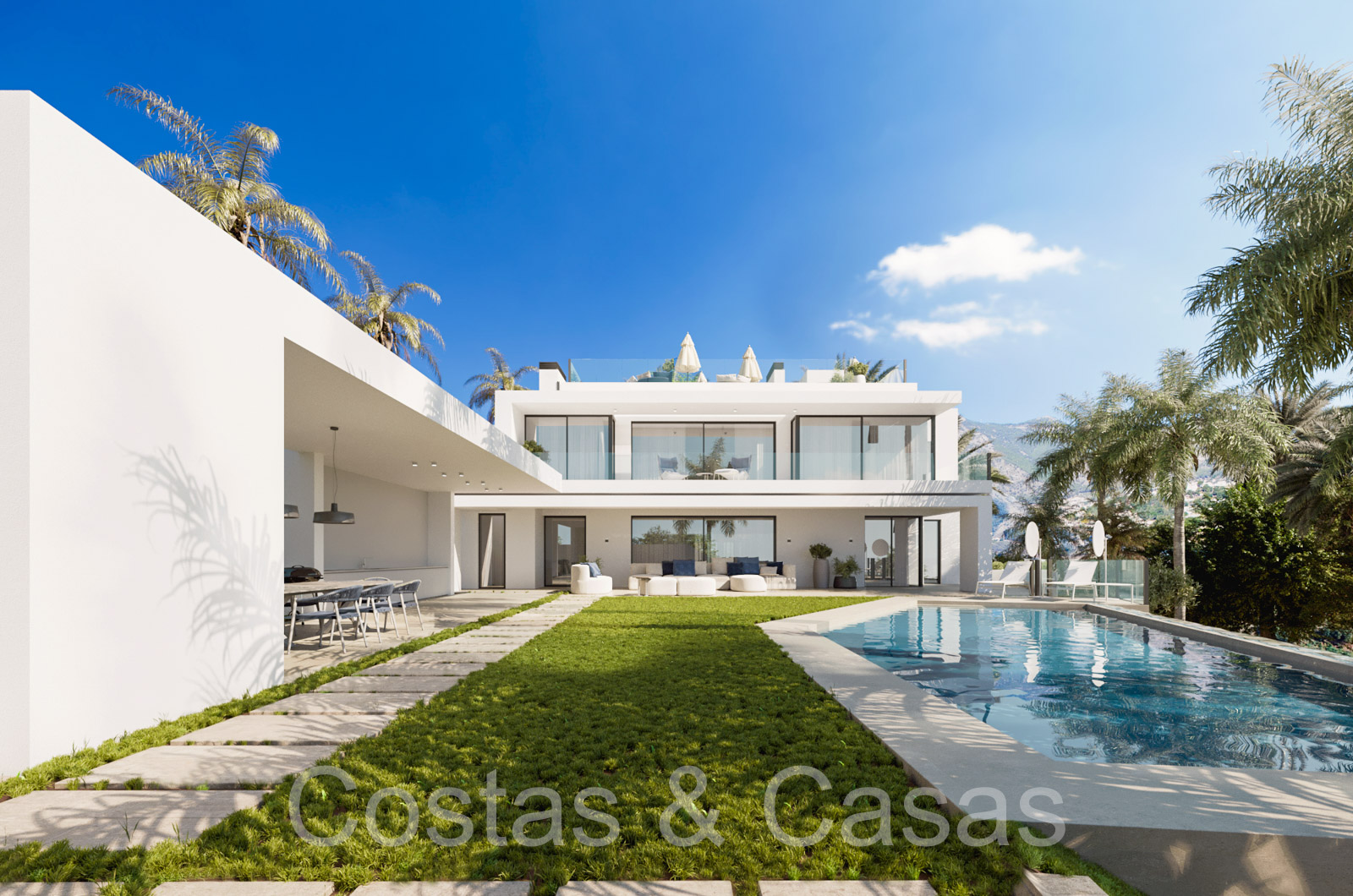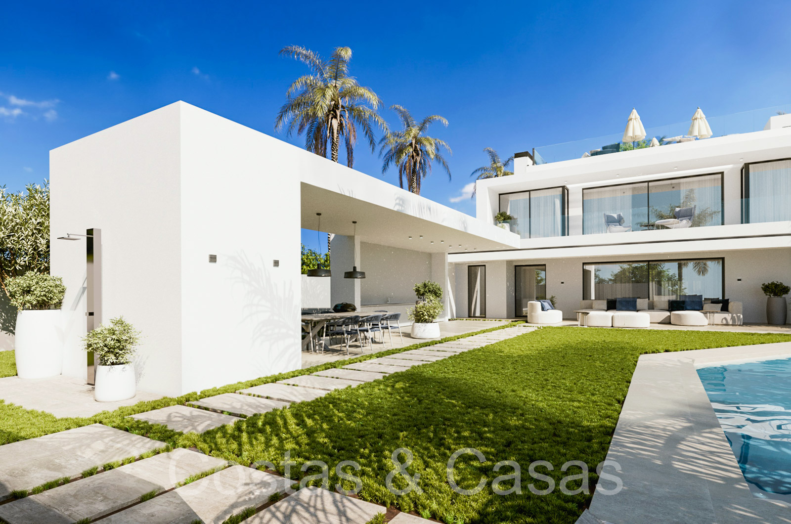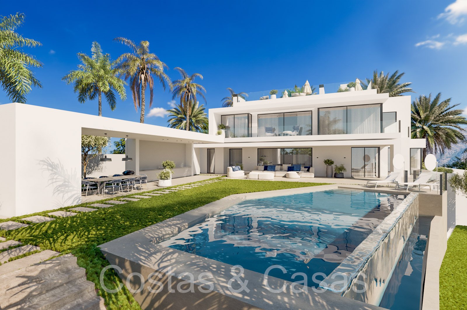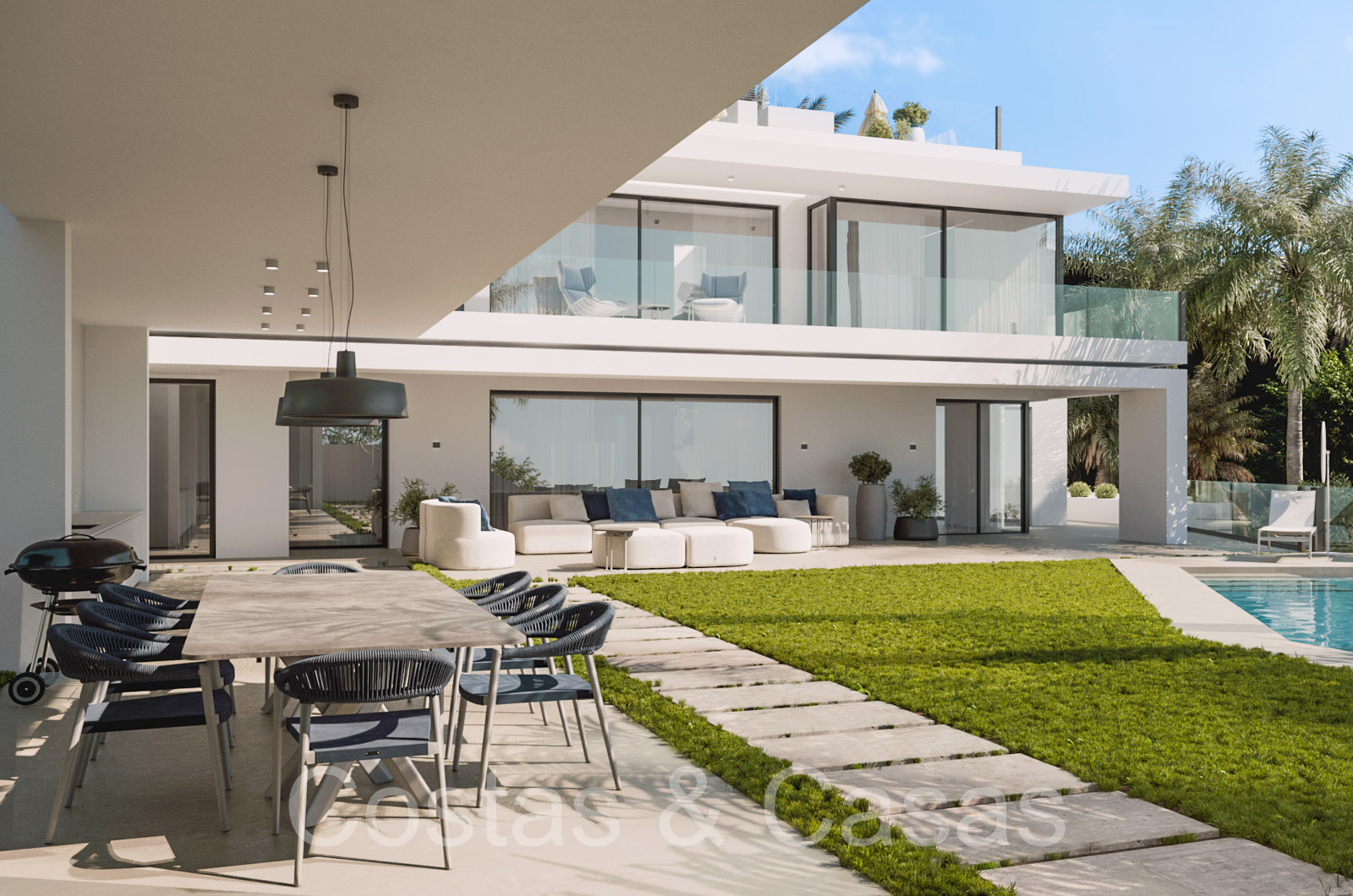 Autres caractéristiques: Ascenseur à tous les étages. Armoires intégrées. Balustrades en verre. Douche extérieure. Cheminée. Éclairage LED.
