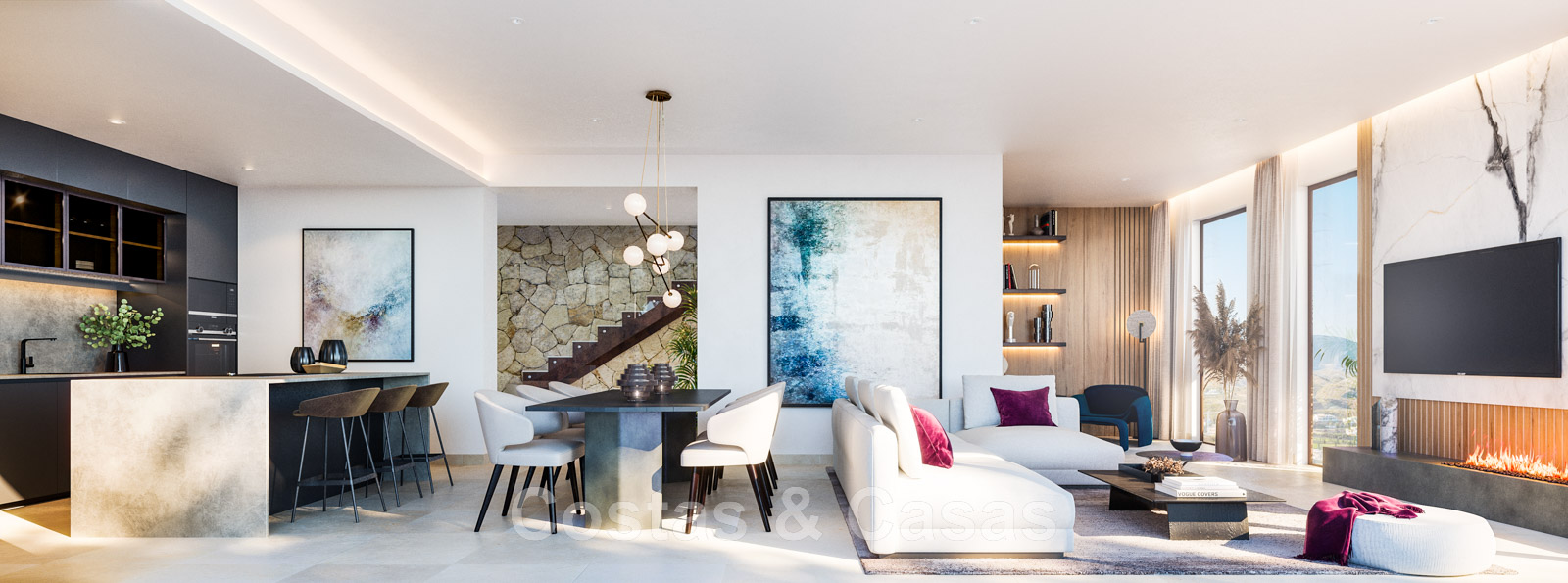 Cuisine design entièrement équipée avec un îlot et des coins salon.