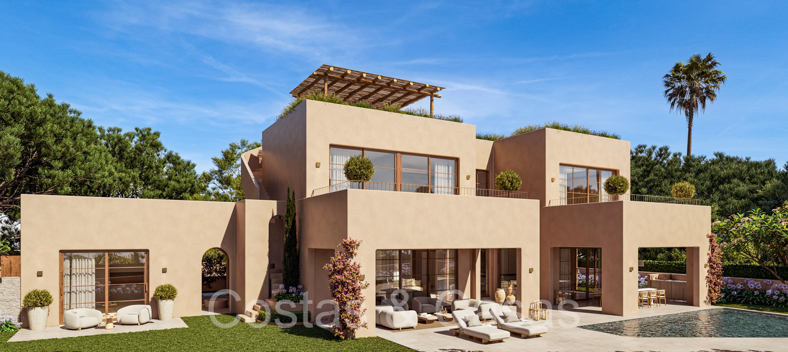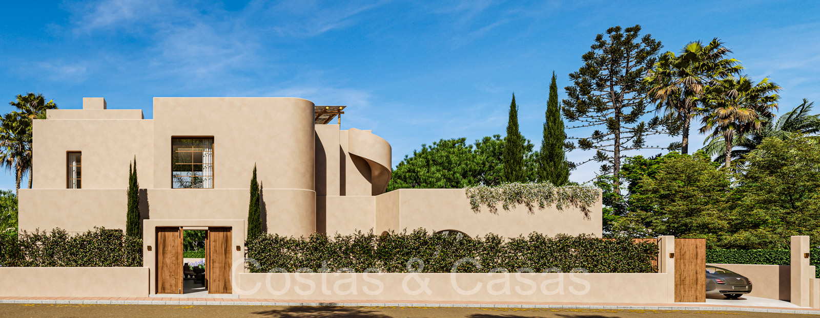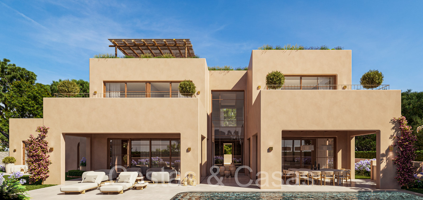 Le terrain est accompagné d'un projet sur mesure par un architecte de renom. La villa présente une architecture unique avec un design bohème chic. La façade en béton de couleur sable, complétée par des accents en bois sur les fenêtres et les portails, crée une apparence harmonieuse et luxueuse. Attention raffinée aux détails et commodités privées. Hall d'entrée avec vestiaire et toilette invités. Grand séjour ouvert avec un coin salon et salle à manger. La cuisine sera entièrement équipée avec des appareils électroménagers haut de gamme, un îlot de cuisson et un coin repas intégré. Attenant une buanderie. Les espaces de vie sont parfaitement reliés aux terrasses couvertes et au jardin. Un total de 5 chambres et 5 salles de bains. La suite parentale à l'étage dispose d'un dressing et d'une terrasse privée. Une salle d'animation avec un bar et un billard et une télévision et un salon. Salle de sport entièrement équipée. Espace supplémentaire pour les activités de yoga/pilates. Installations spa avec sauna, jacuzzi et salle de massage. Débarras. Buanderie, locaux techniques. Abri privé pour 3 voitures.