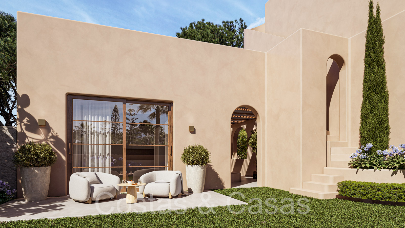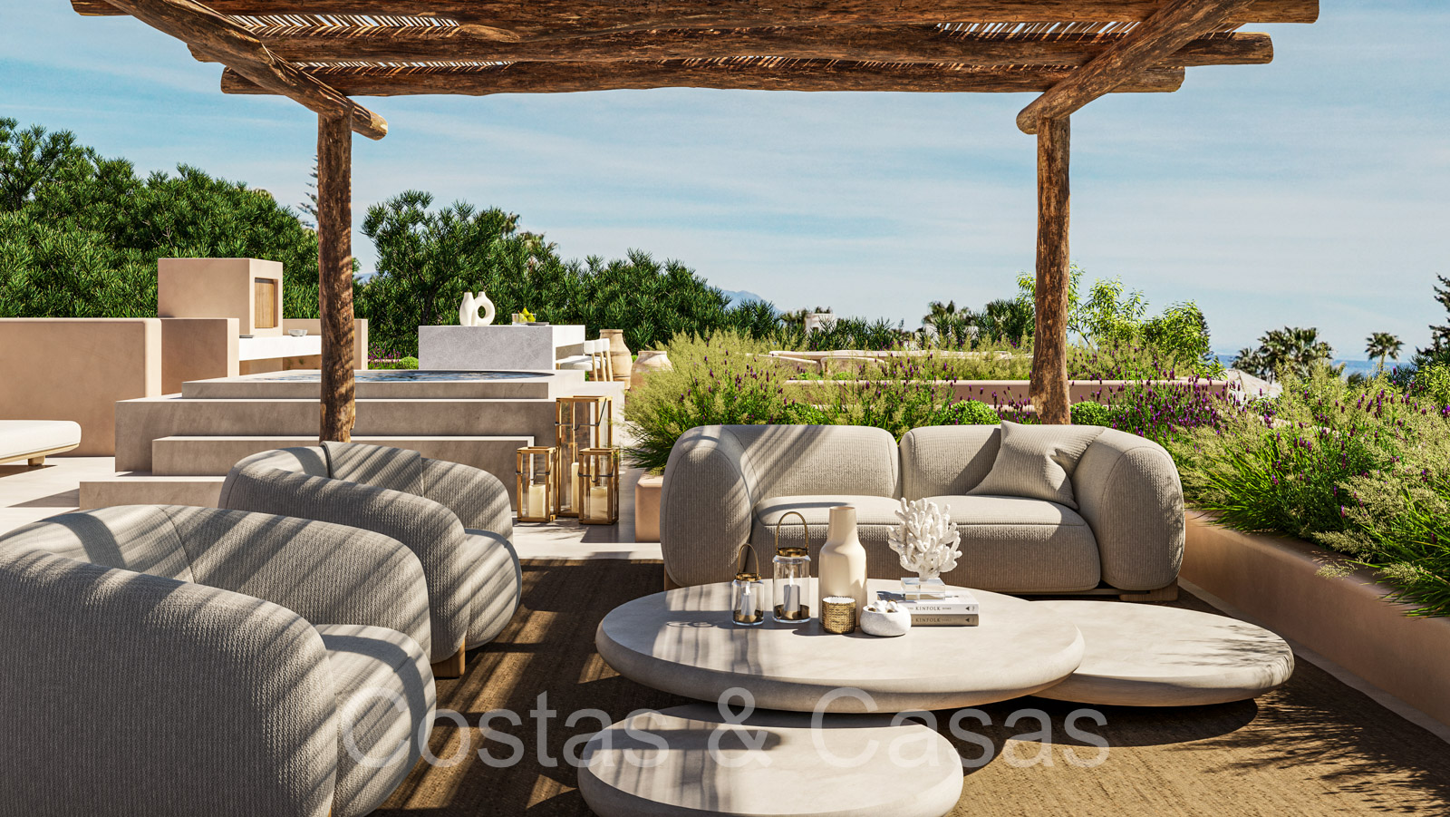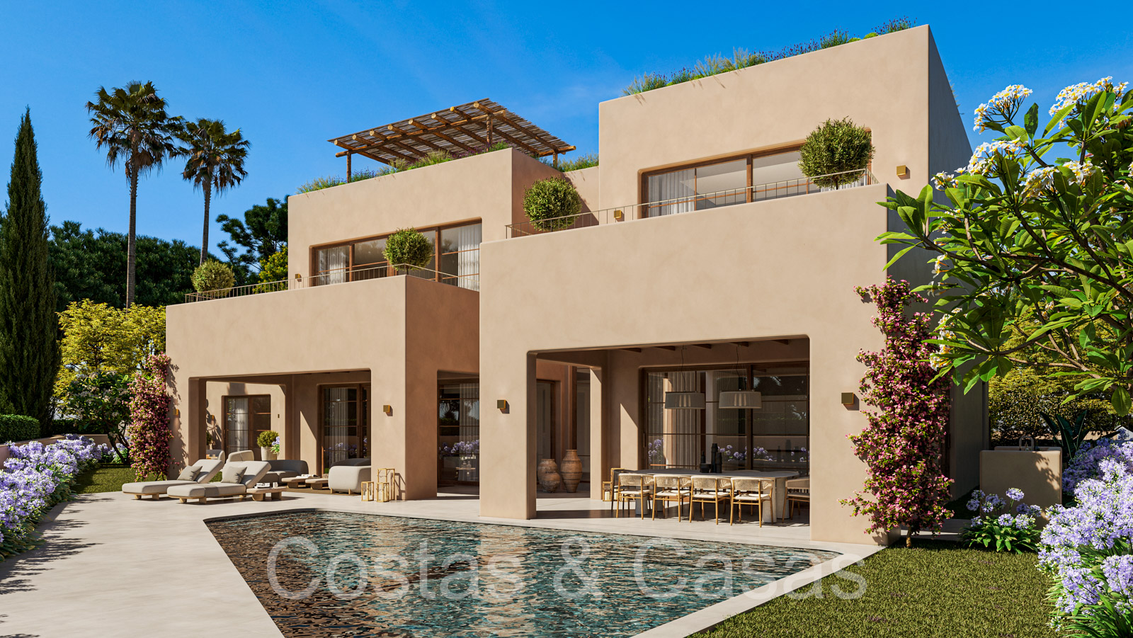 Le terrain est accompagné d'un projet sur mesure par un architecte de renom. La villa présente une architecture unique avec un design bohème chic. La façade en béton de couleur sable, complétée par des accents en bois sur les fenêtres et les portails, crée une apparence harmonieuse et luxueuse. Attention raffinée aux détails et commodités privées. Hall d'entrée avec vestiaire et toilette invités. Grand séjour ouvert avec un coin salon et salle à manger. La cuisine sera entièrement équipée avec des appareils électroménagers haut de gamme, un îlot de cuisson et un coin repas intégré. Attenant une buanderie. Les espaces de vie sont parfaitement reliés aux terrasses couvertes et au jardin. Un total de 5 chambres et 5 salles de bains. La suite parentale à l'étage dispose d'un dressing et d'une terrasse privée. Une salle d'animation avec un bar et un billard et une télévision et un salon. Salle de sport entièrement équipée. Espace supplémentaire pour les activités de yoga/pilates. Installations spa avec sauna, jacuzzi et salle de massage. Débarras. Buanderie, locaux techniques. Abri privé pour 3 voitures.