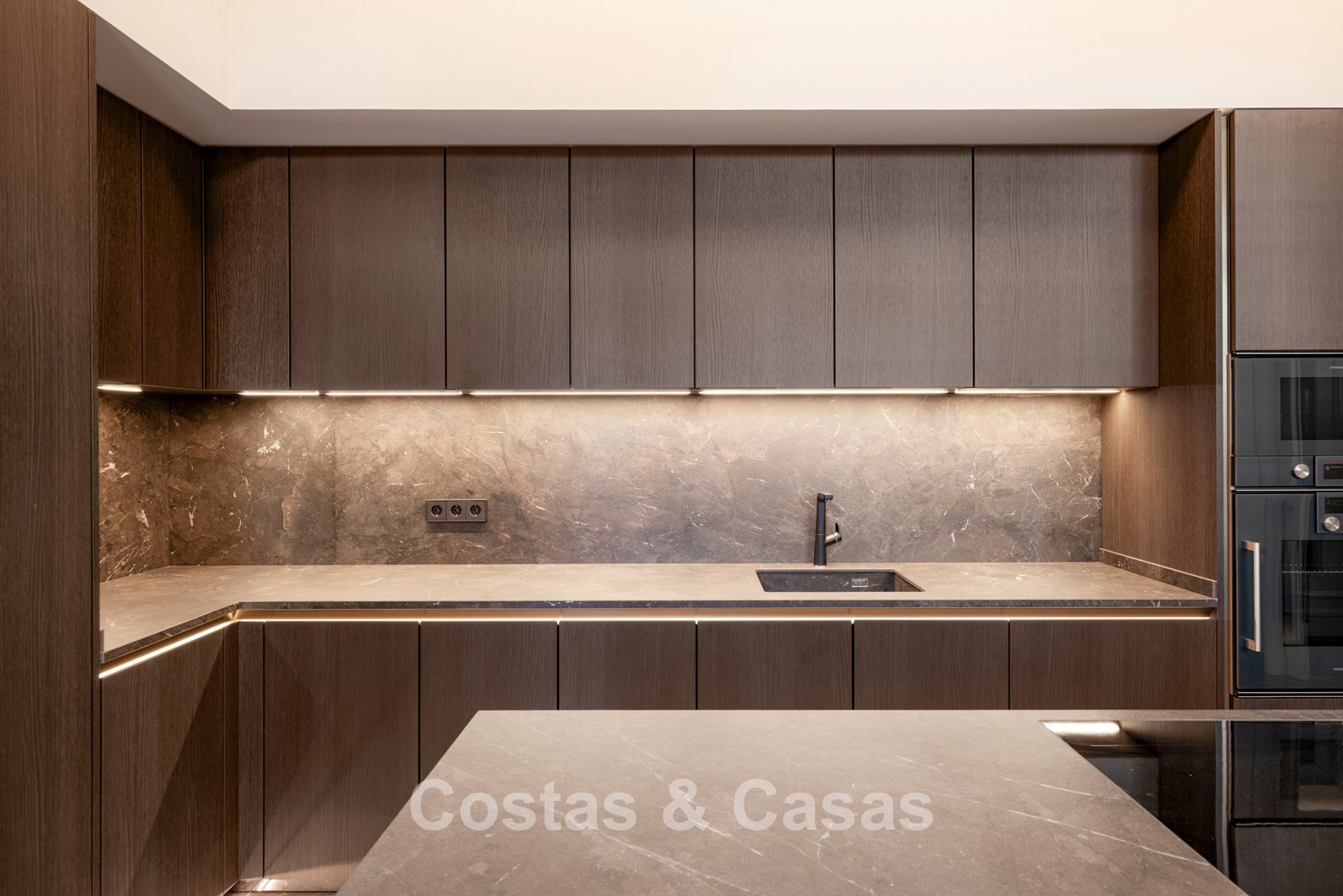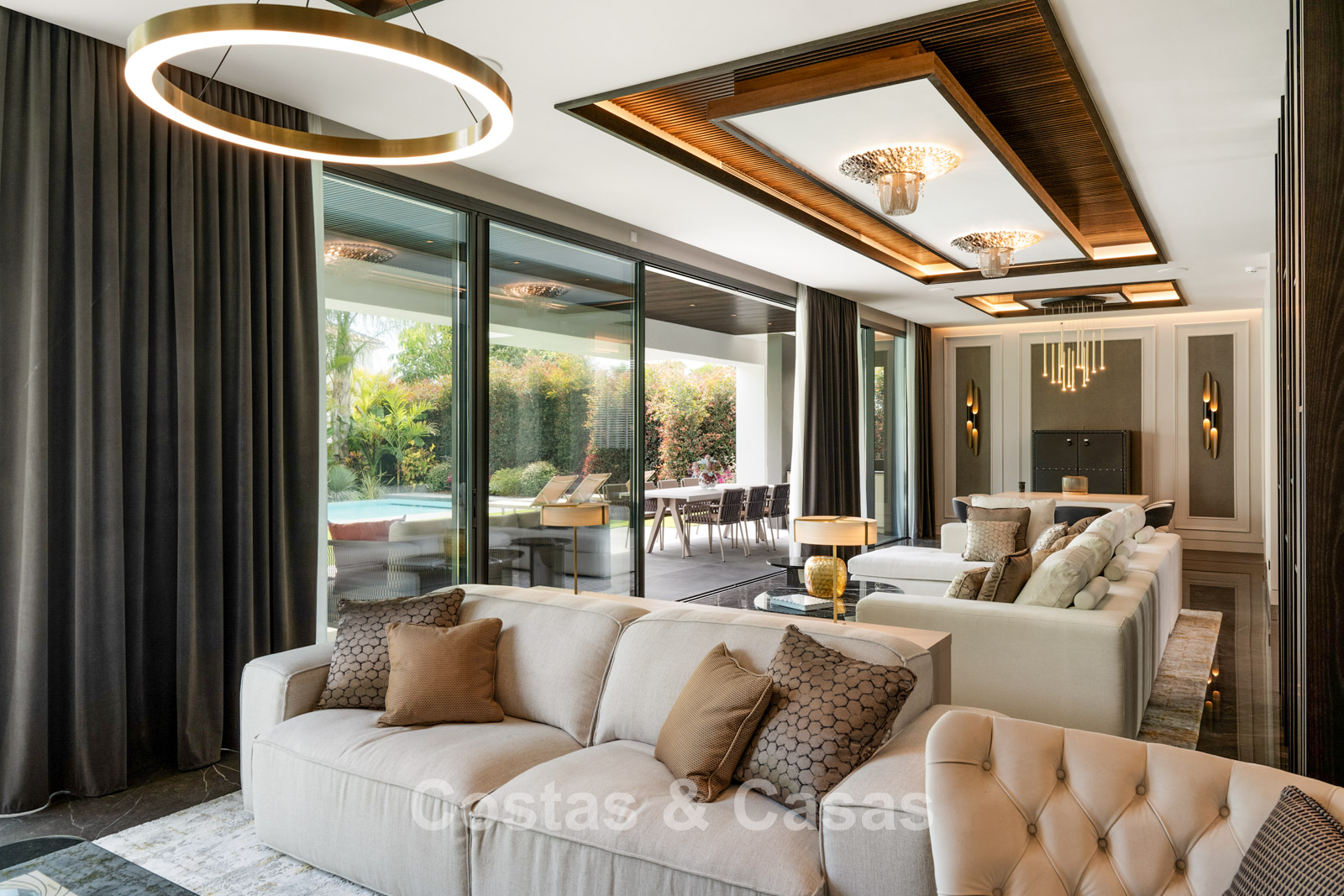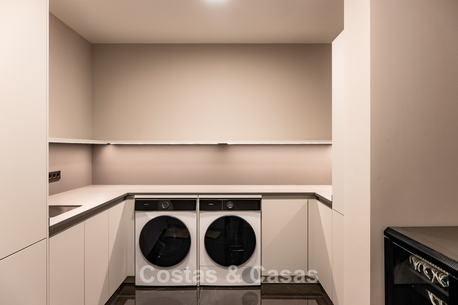 Villa individuelle au style luxueux. Entièrement automatisée avec raffinement et qualité exceptionnelle. Les fenêtres coulissantes du sol au plafond avec profils encastrés maximisent la lumière naturelle et créent une transition harmonieuse entre l'intérieur et l'extérieur. Séjour ouvert avec un salon TV, un 2ème coin salon et une salle à manger intégrée. Cuisine Siematic minimaliste avec appareils électroménagers Gaggenau haut de gamme et îlot de cuisson central. 5 chambres, 5 salles de bains et 2 toilettes séparées. Une aire de jeux récréative au sous-sol est accessible via un patio anglais. Un 2ème espace multifonctionnel au sous-sol peut être aménagé librement. Cave à vin climatisée avec kitchenette. Salle de fitness entièrement équipée avec appareils Technogym. Les installations de bien-être comprennent un hammam et un sauna finlandais, une salle de massage et d'hydromassage. Buanderie entièrement équipée. Sols en carrelage noir brillant grand format Trastero. Local technique. Un garage intérieur avec une plate-forme rotative qui peut être utilisée avec une application.