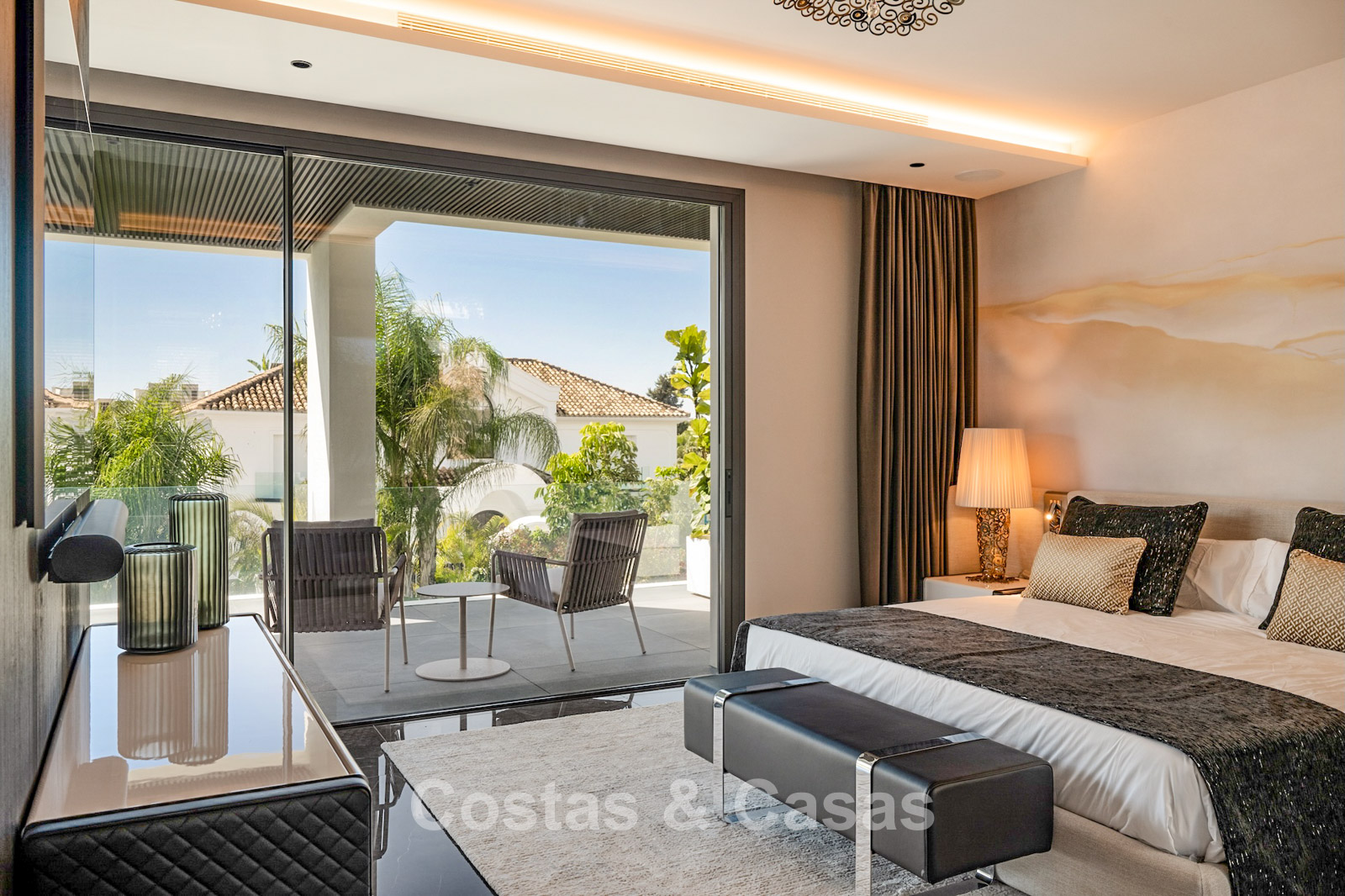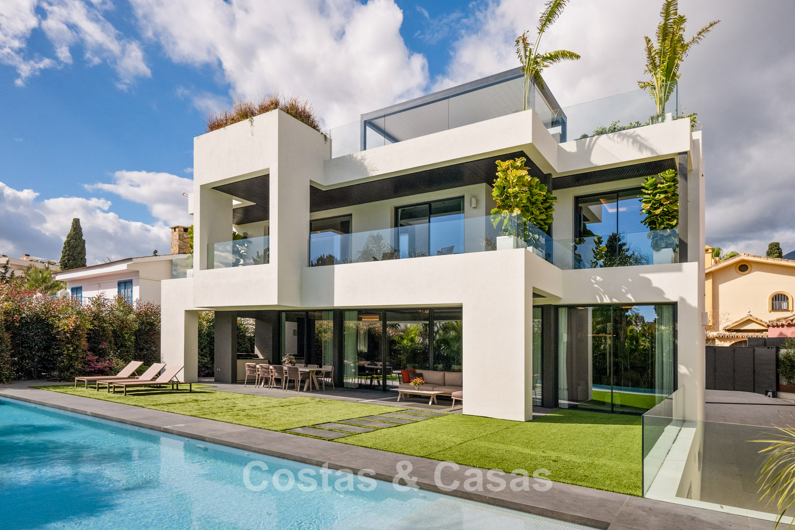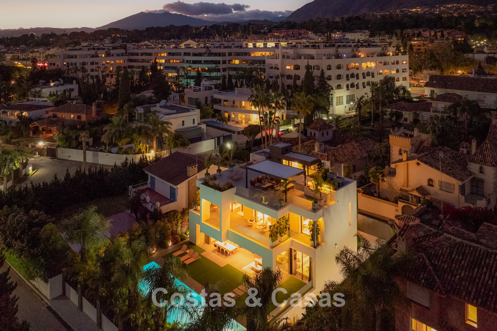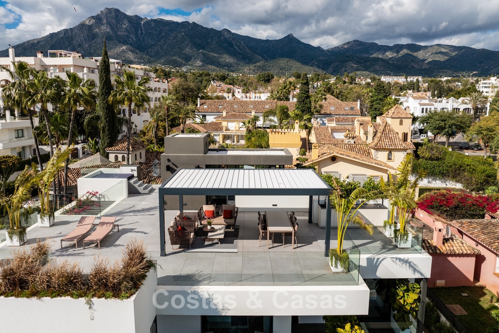 Terrain plat, entièrement clôturé. Un jardin magnifiquement aménagé avec divers parterres de fleurs offre une oasis de tranquillité. Plusieurs terrasses, agrémentées de plantes luxuriantes et de meubles confortables, sont l'endroit idéal pour se détendre et profiter de la vue. Grand solarium comprenant une cuisine extérieure avec barbecue, un coin repas ombragé et un jacuzzi intégré. Piscine chauffée de 17 mètres. Vue partielle sur la mer et le sommet de la montagne La Concha depuis la terrasse sur le toit.