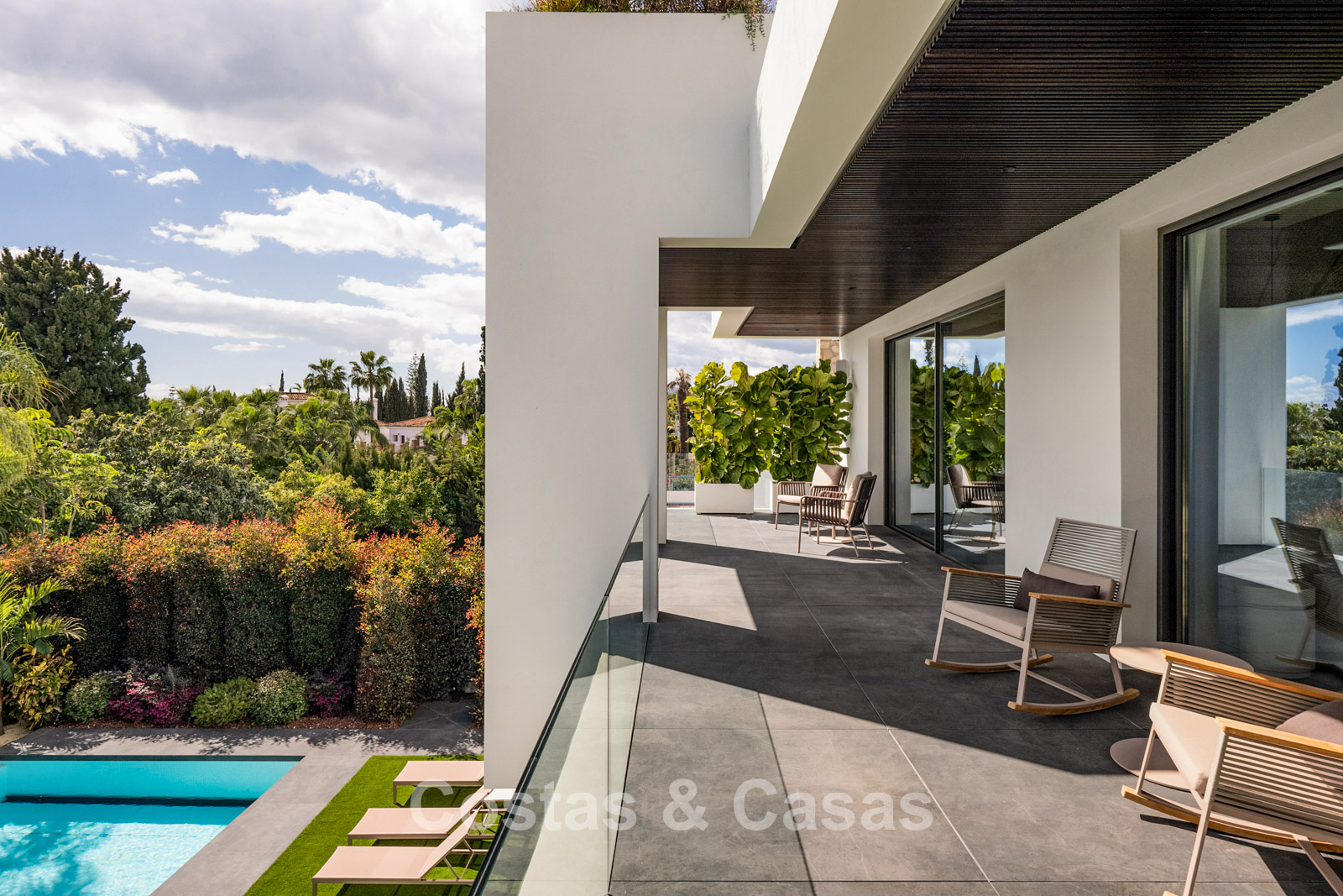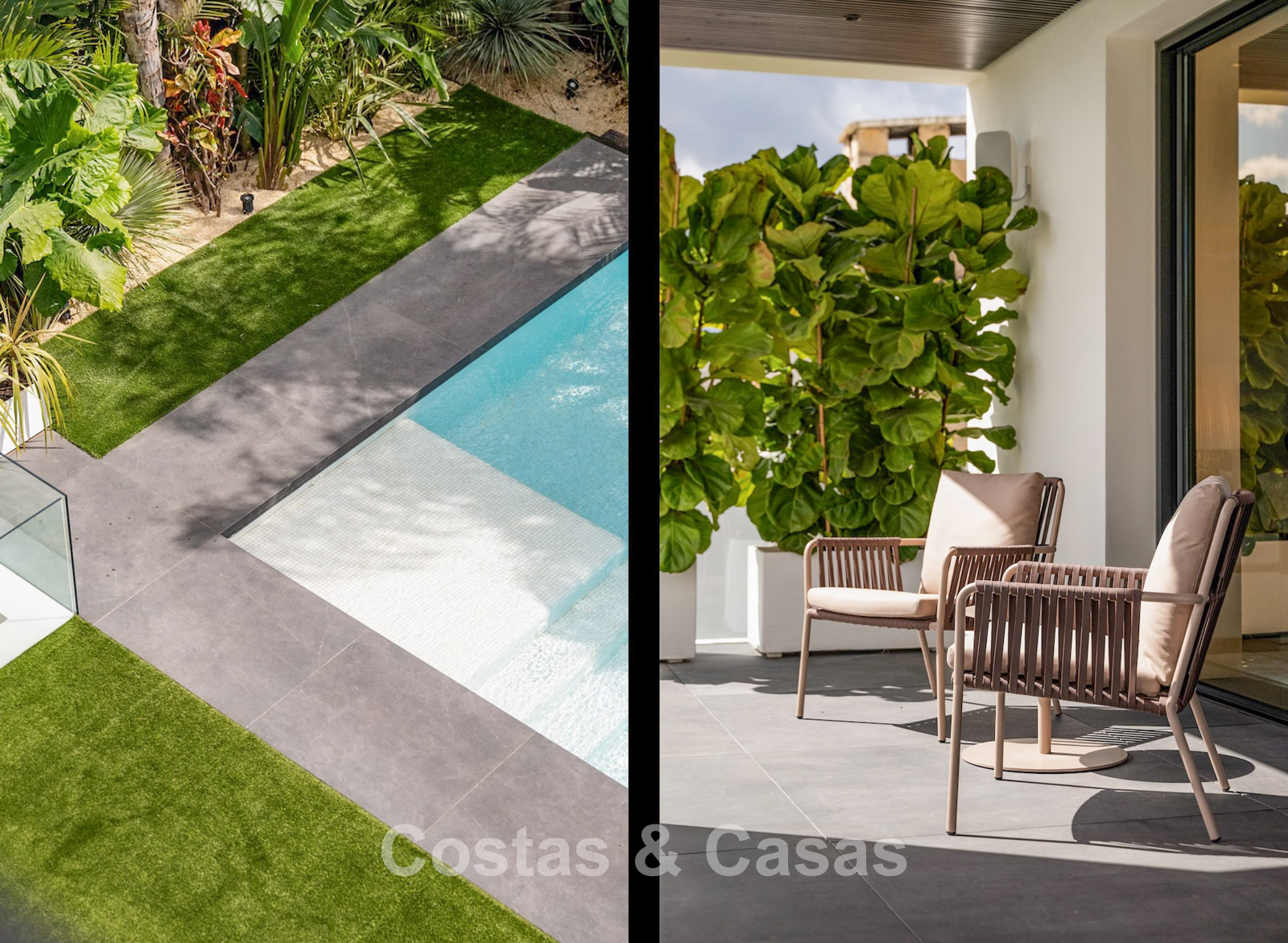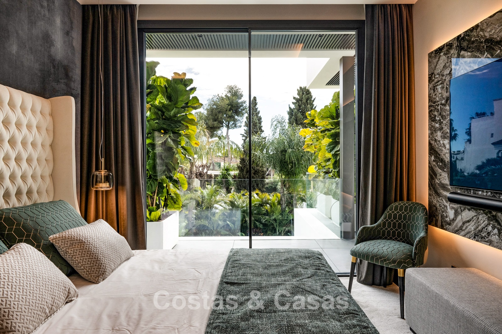 Terrain plat, entièrement clôturé. Un jardin magnifiquement aménagé avec divers parterres de fleurs offre une oasis de tranquillité. Plusieurs terrasses, agrémentées de plantes luxuriantes et de meubles confortables, sont l'endroit idéal pour se détendre et profiter de la vue. Grand solarium comprenant une cuisine extérieure avec barbecue, un coin repas ombragé et un jacuzzi intégré. Piscine chauffée de 17 mètres. Vue partielle sur la mer et le sommet de la montagne La Concha depuis la terrasse sur le toit.