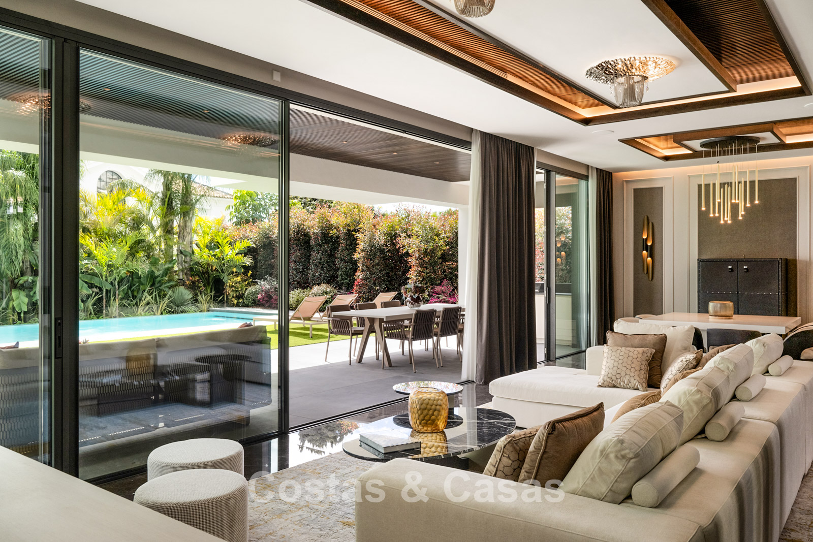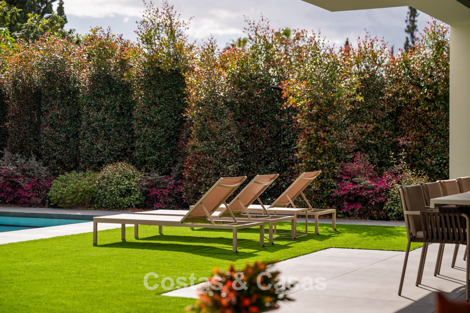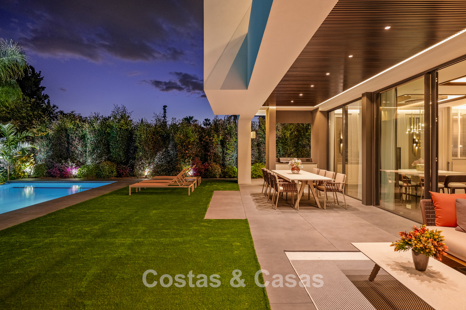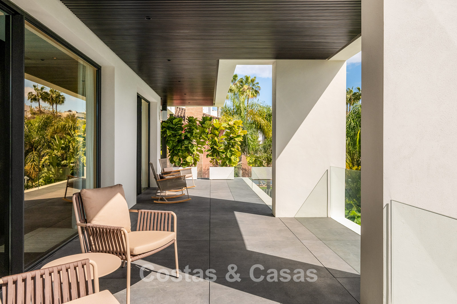 Terrain plat, entièrement clôturé. Un jardin magnifiquement aménagé avec divers parterres de fleurs offre une oasis de tranquillité. Plusieurs terrasses, agrémentées de plantes luxuriantes et de meubles confortables, sont l'endroit idéal pour se détendre et profiter de la vue. Grand solarium comprenant une cuisine extérieure avec barbecue, un coin repas ombragé et un jacuzzi intégré. Piscine chauffée de 17 mètres. Vue partielle sur la mer et le sommet de la montagne La Concha depuis la terrasse sur le toit.
