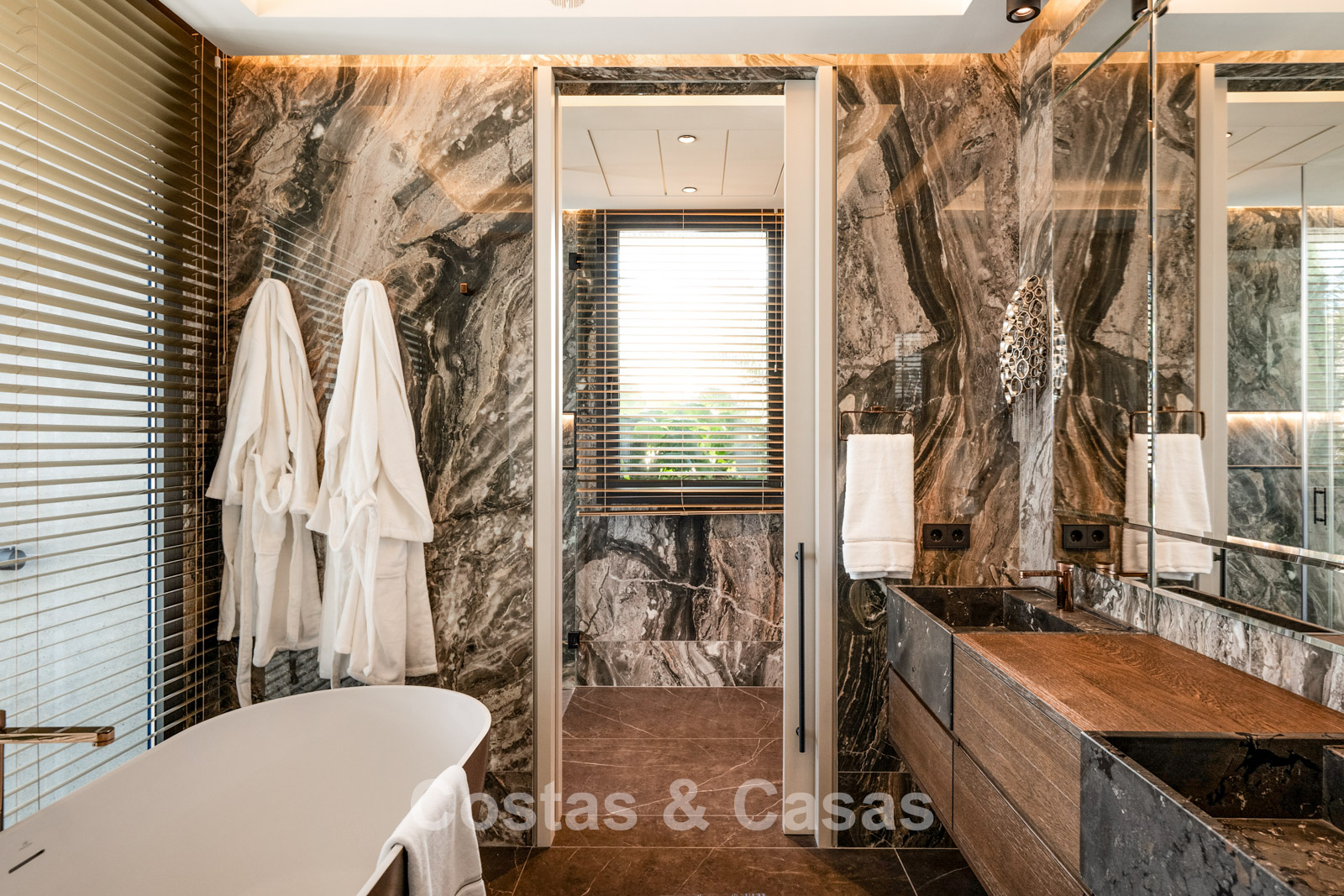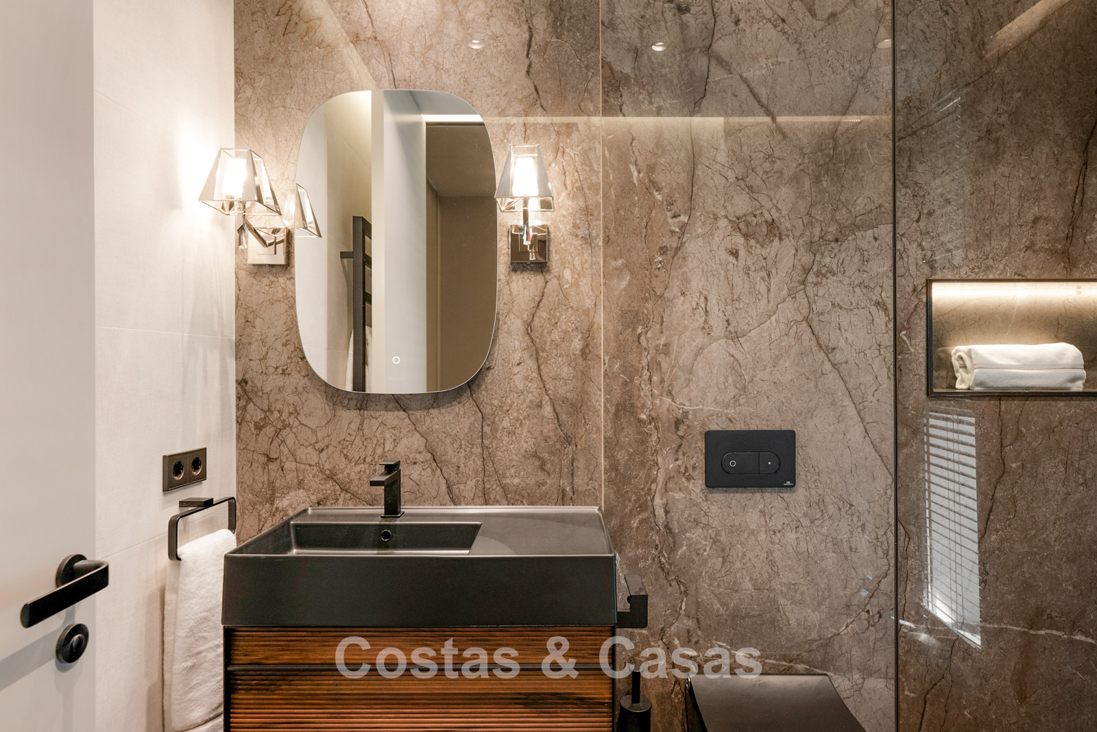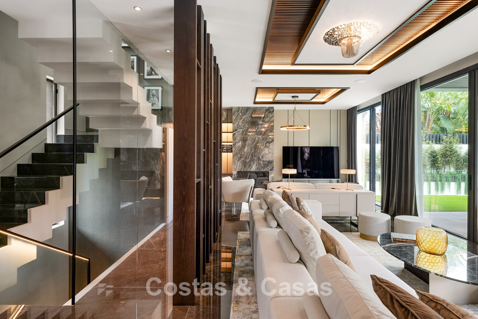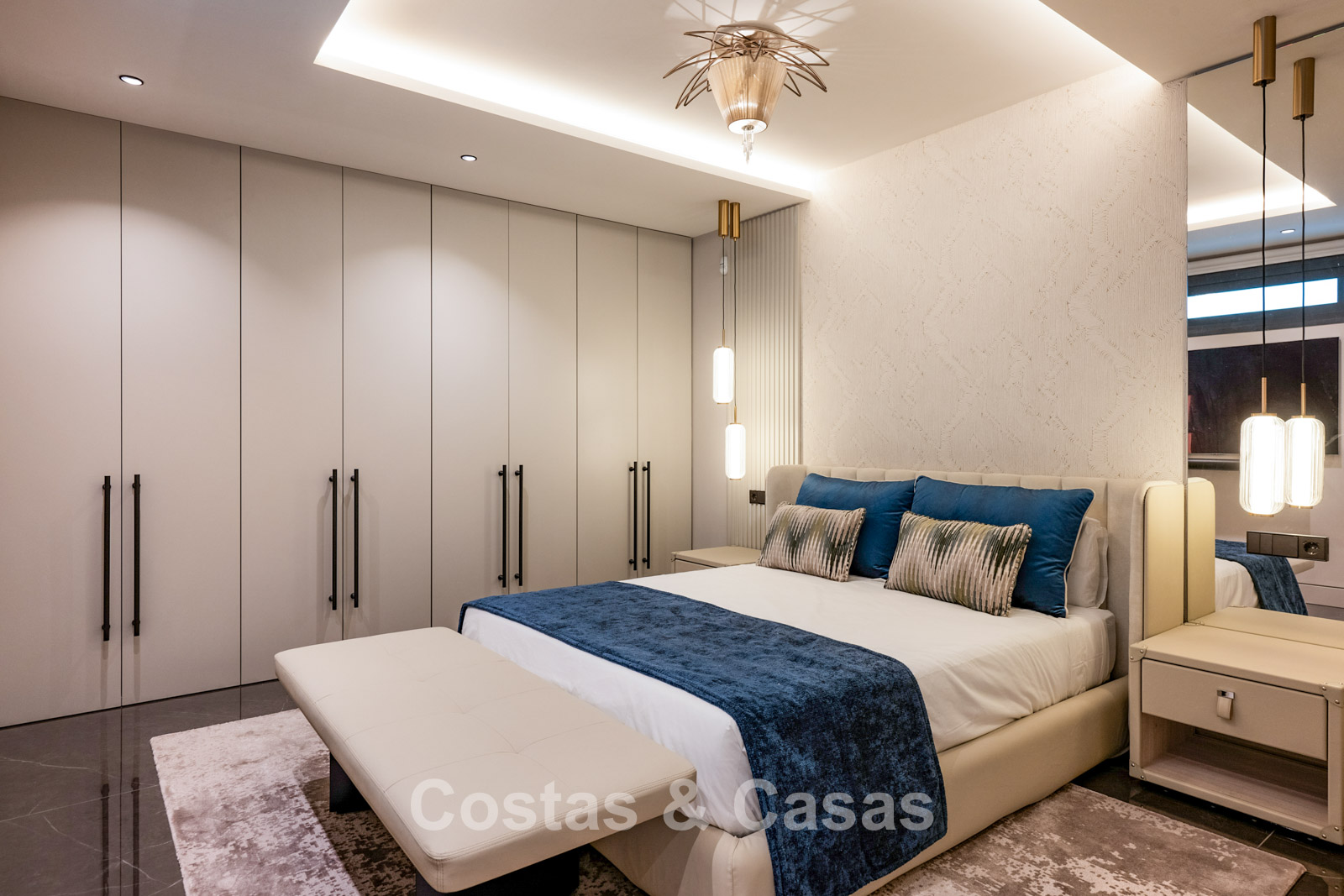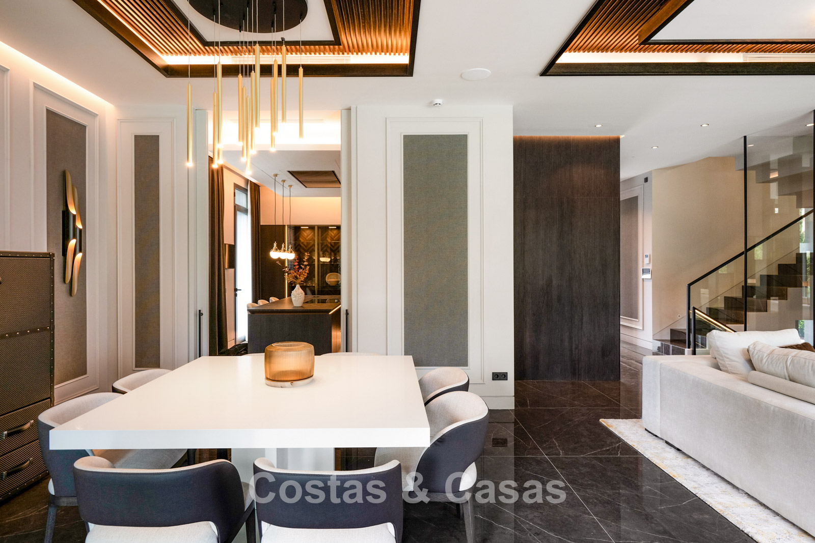 Autres caractéristiques : Un ascenseur privé couleur champagne doré dessert tous les étages. Double vitrage. Balustrades en verre autour des terrasses. Armoires encastrées sur mesure. Système domotique sophistiqué. Système de son intégré. Espace barbecue. (2) Éclairage LED intérieur et extérieur. Douche extérieure. Borne de recharge pour véhicules électriques.