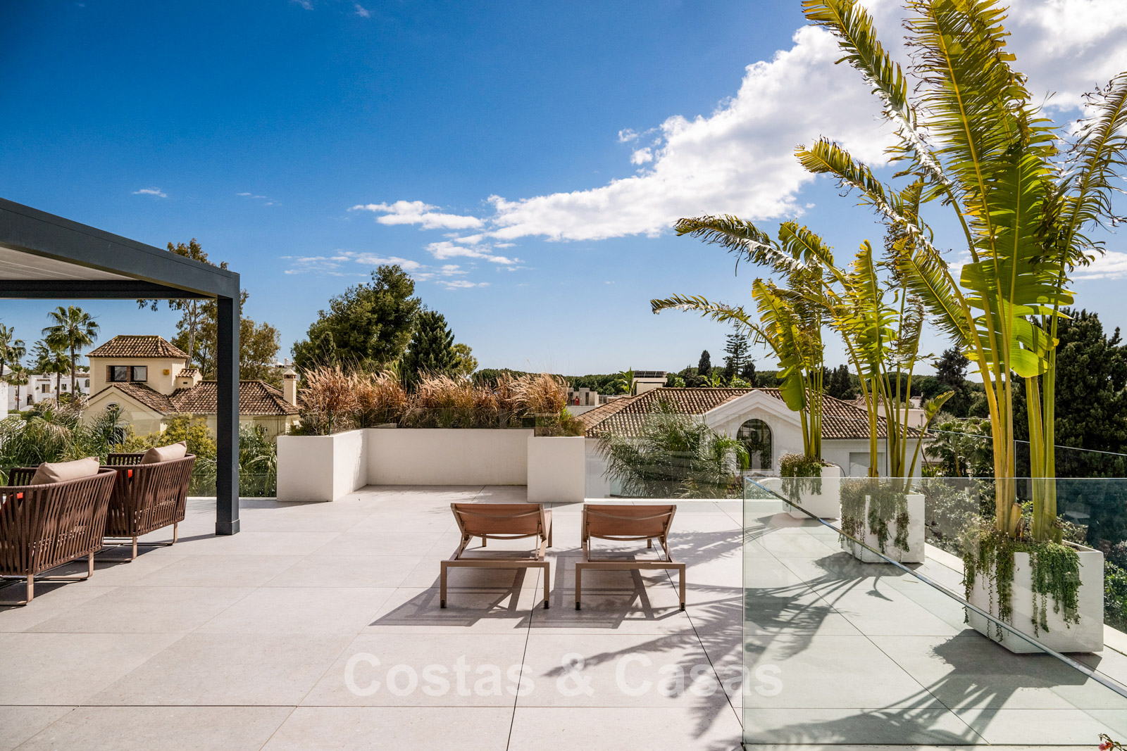 Solarium avec pergola, cuisine extérieure, chill-out et jacuzzi.