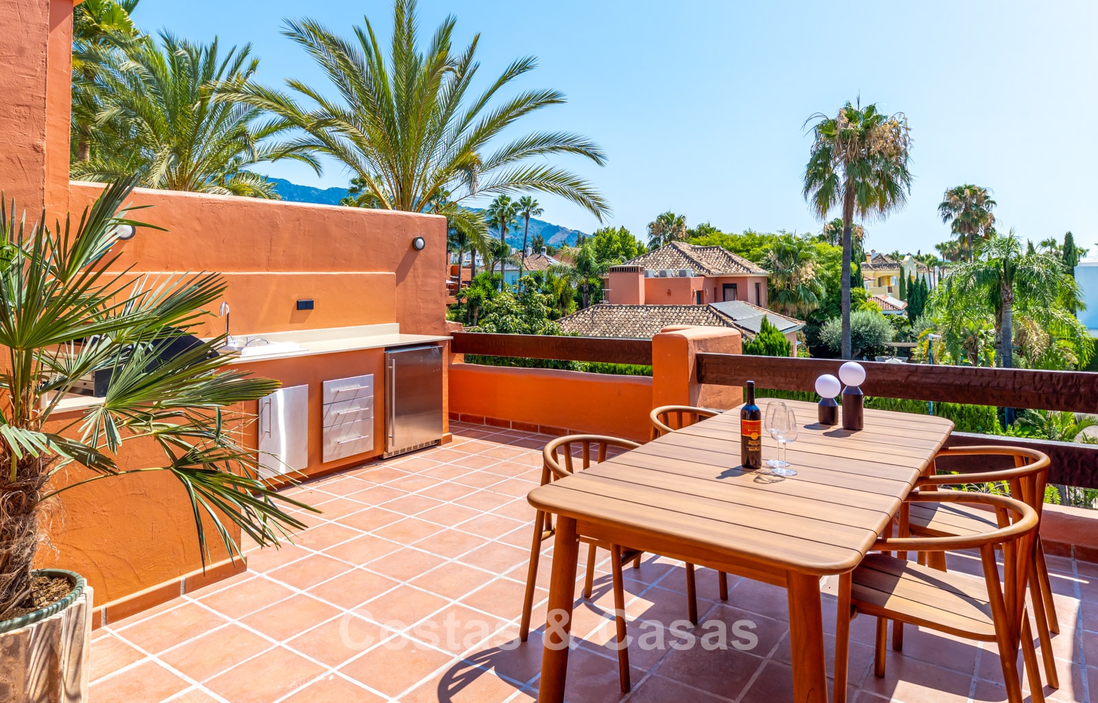 Terrasse ensoleillée avec un espace détente cosy. La jolie terrasse sur le toit dispose d'une cuisine extérieure et offre une vue sur la mer et la montagne La Concha. Située au sud-ouest.
