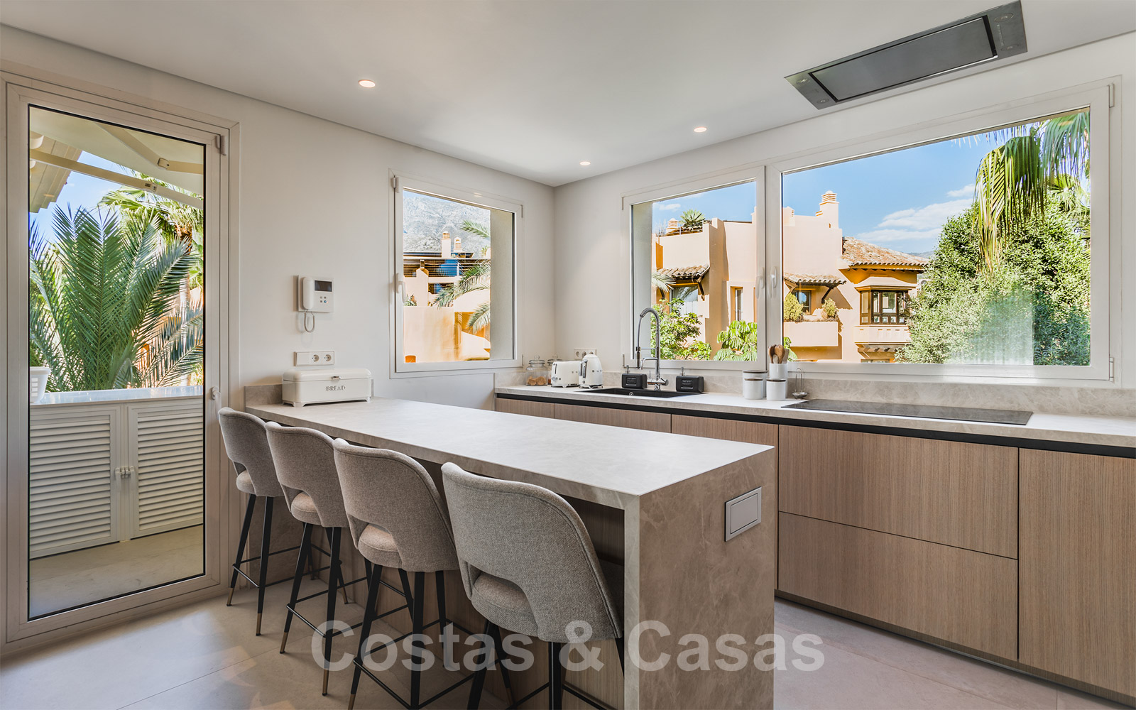 Cuisine moderne entièrement équipée avec bar pour le petit-déjeuner.