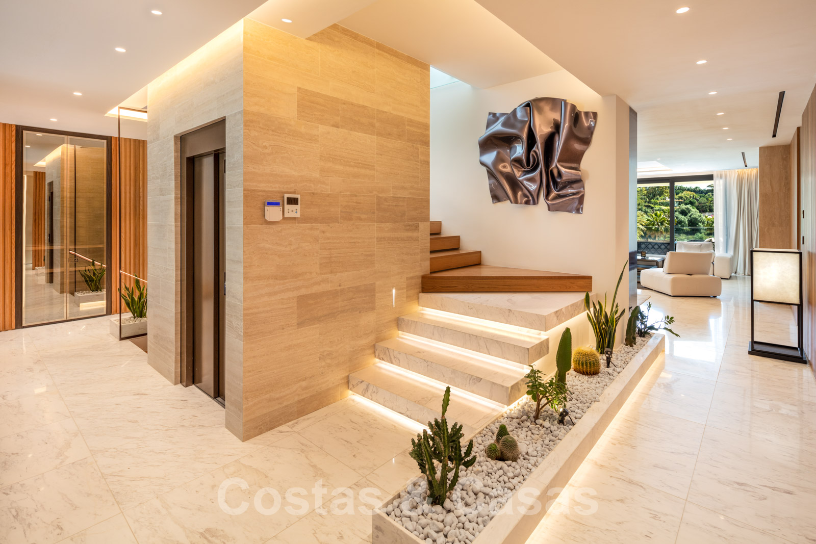 Entrée avec escaliers et ascenseur.