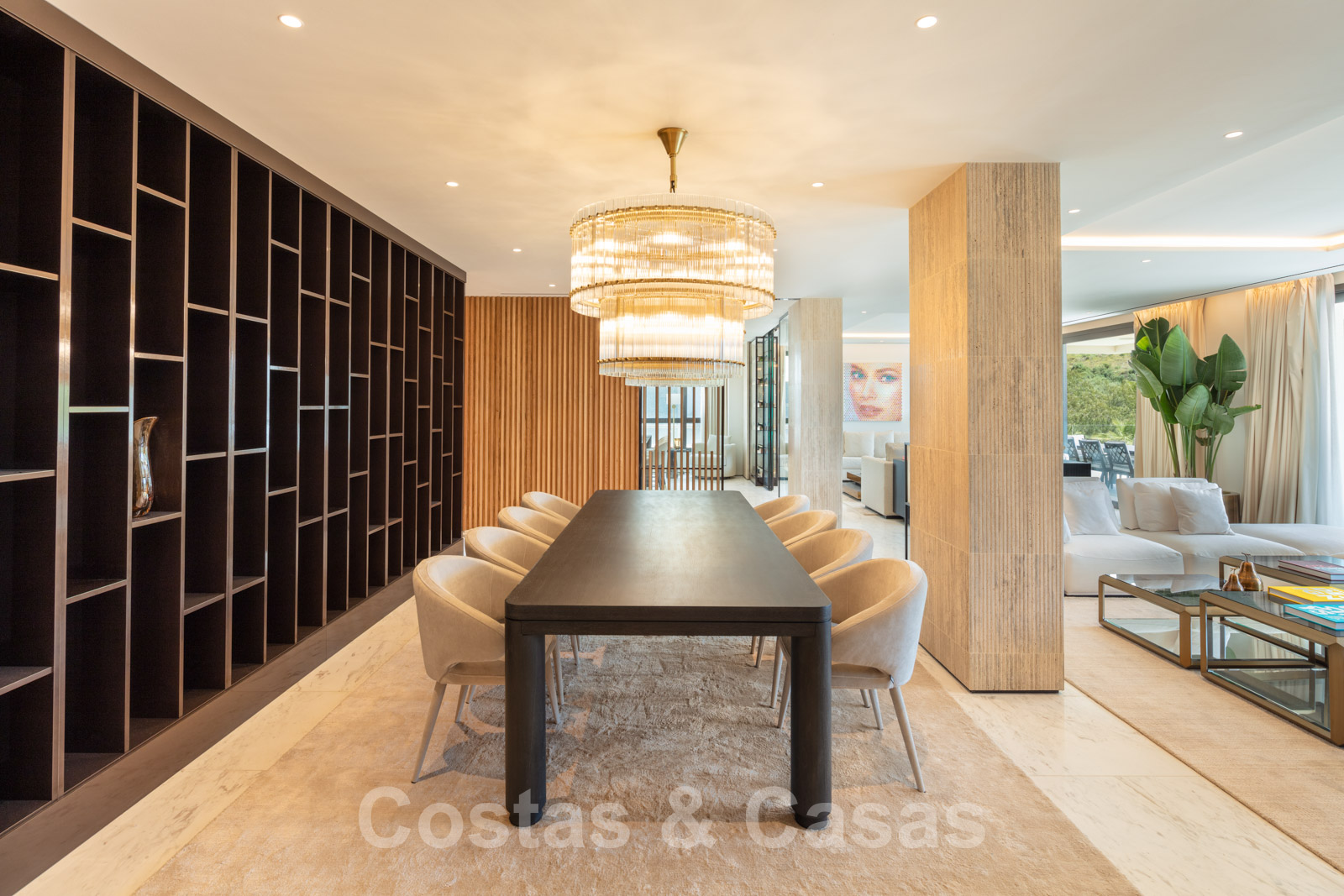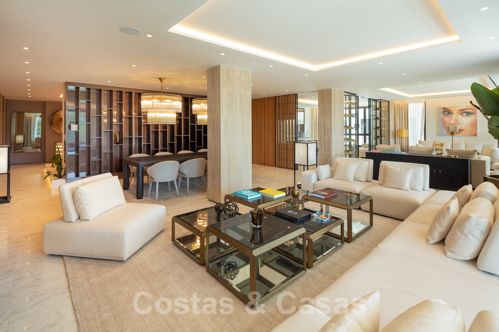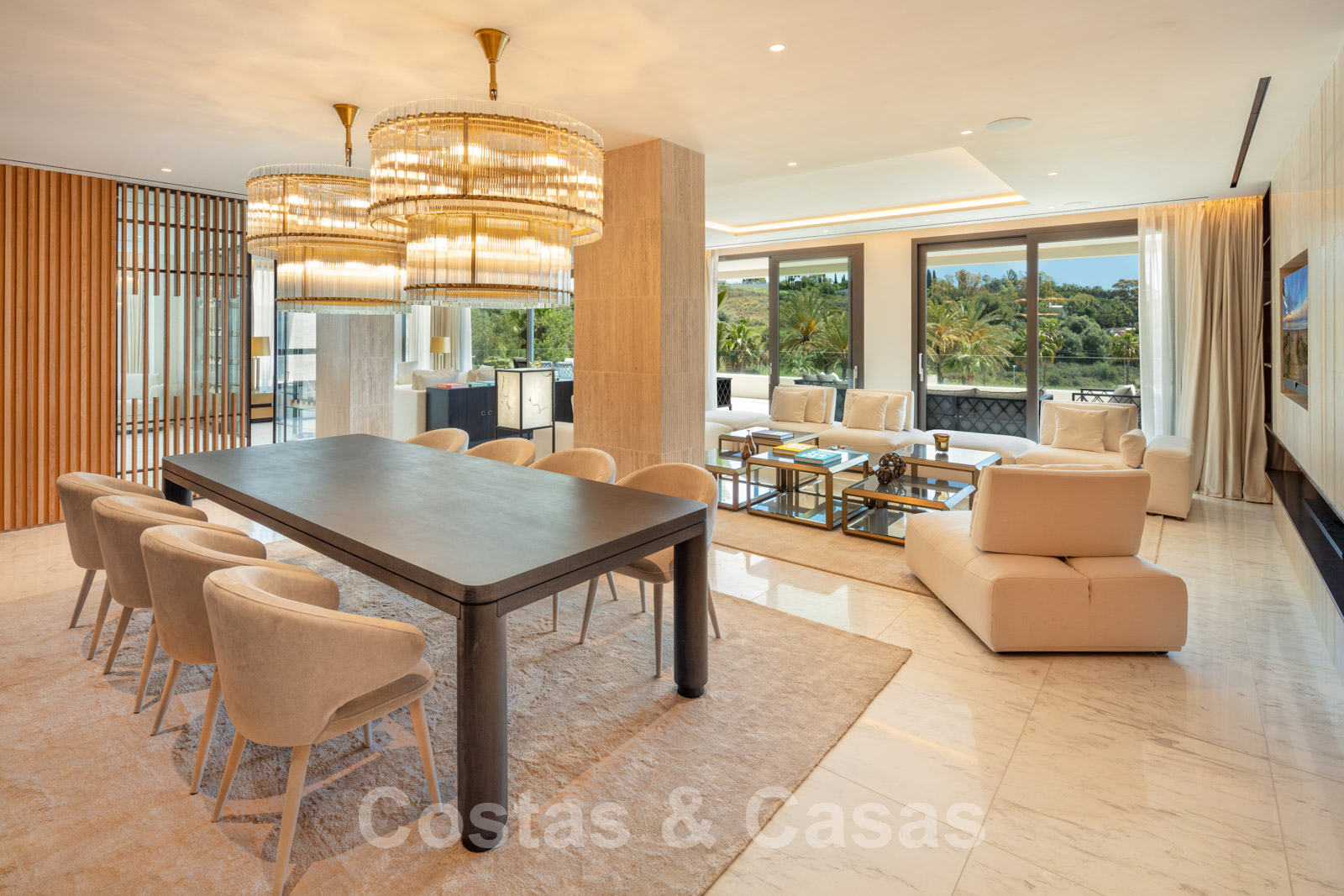 Salle de séjour avec salon double et table à manger.