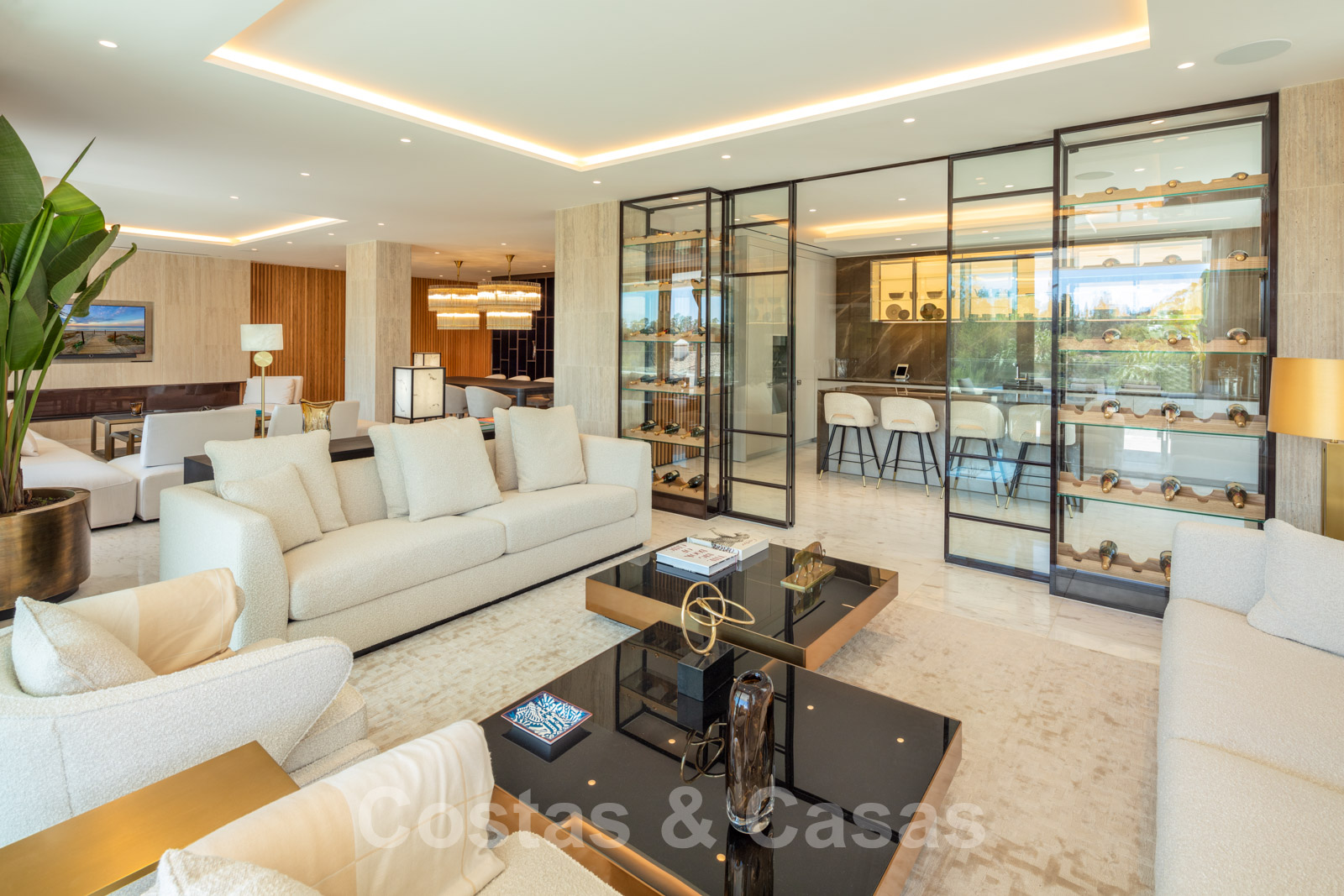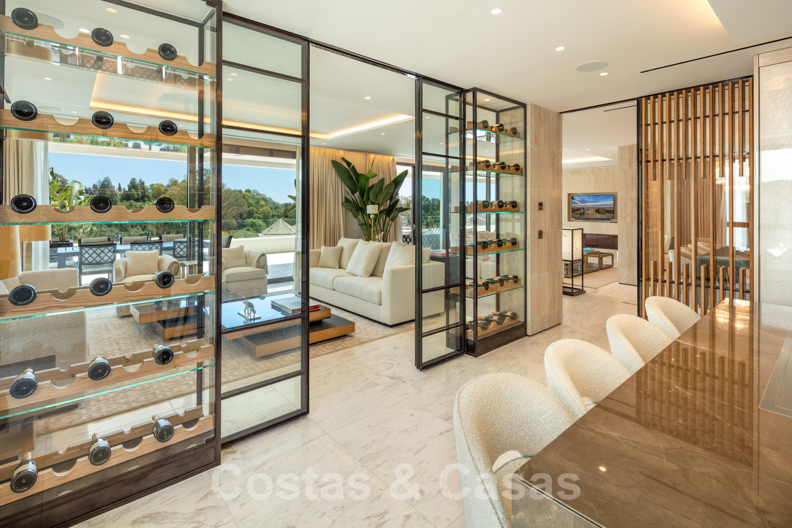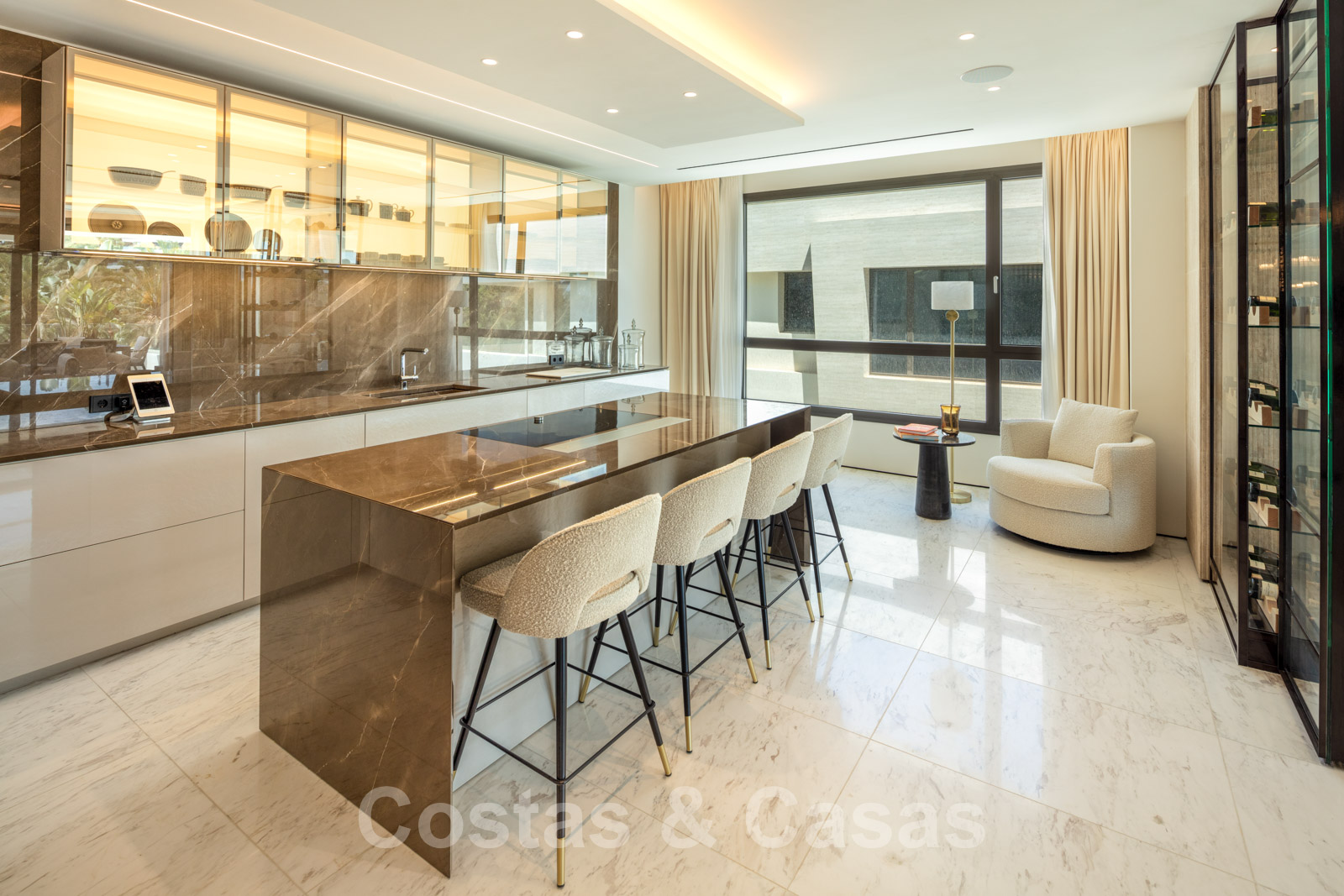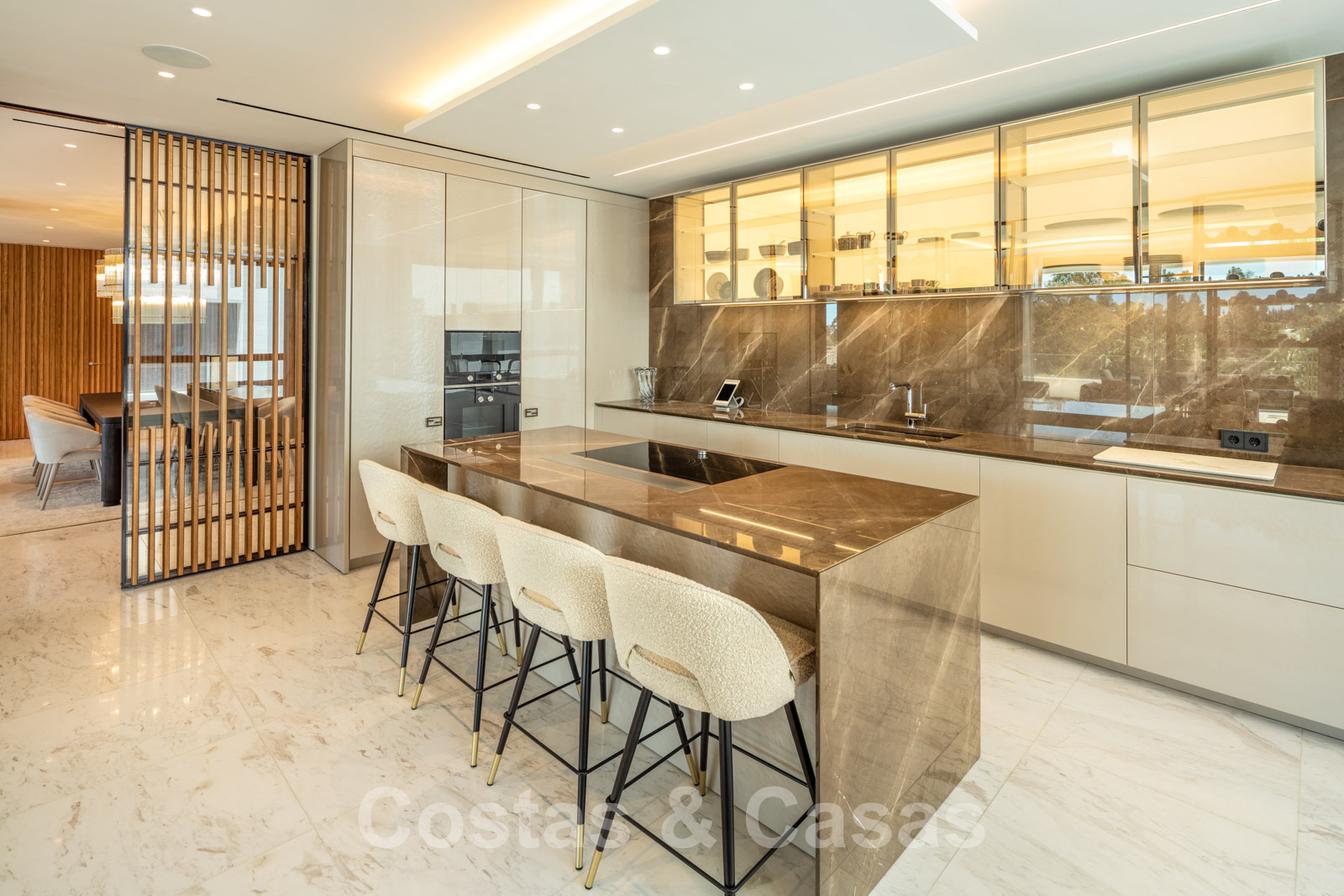 Cuisine semi-ouverte avec îlot de cuisson, équipée d'appareils Gaggenau et d'une armoire à vin à double vitrage.