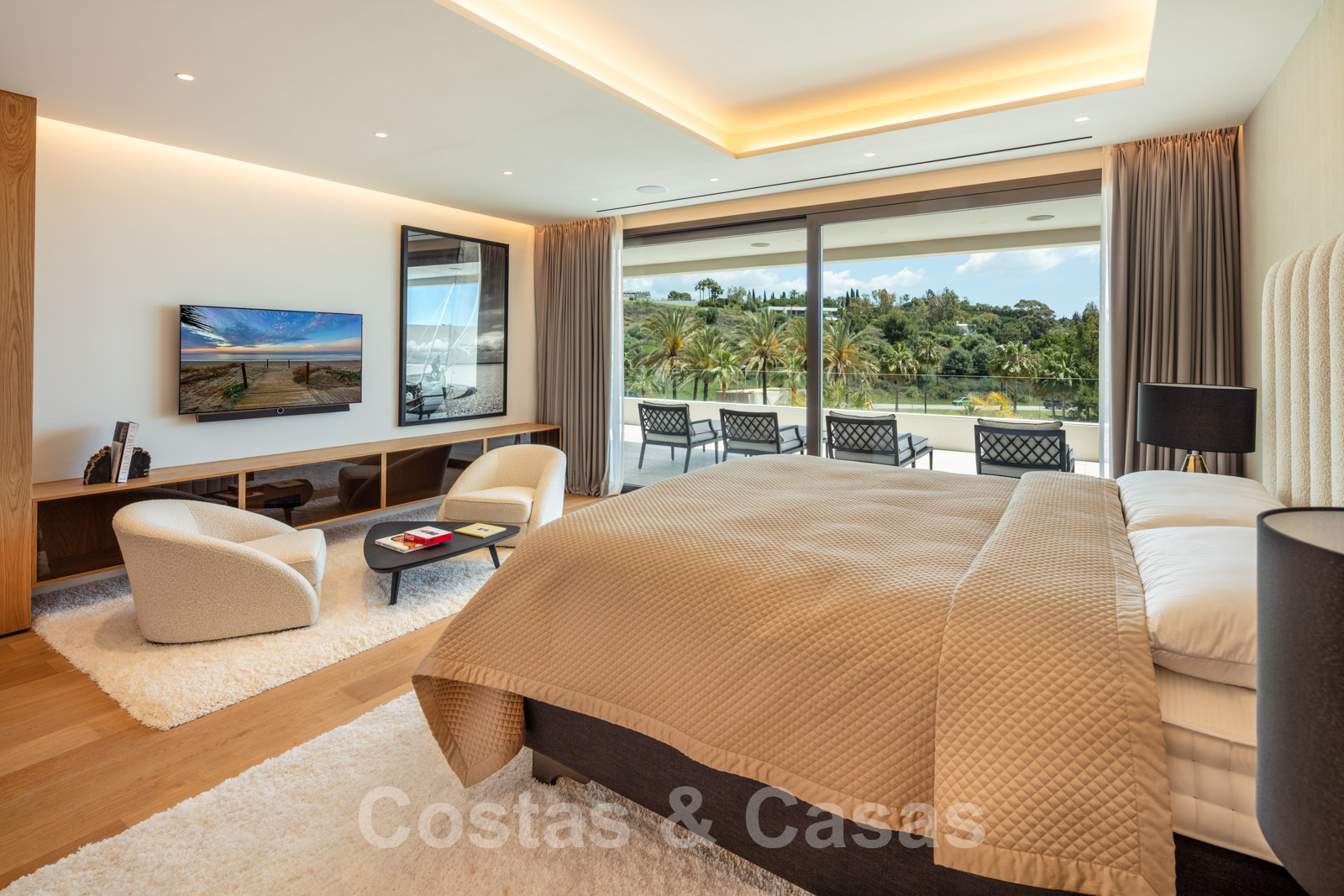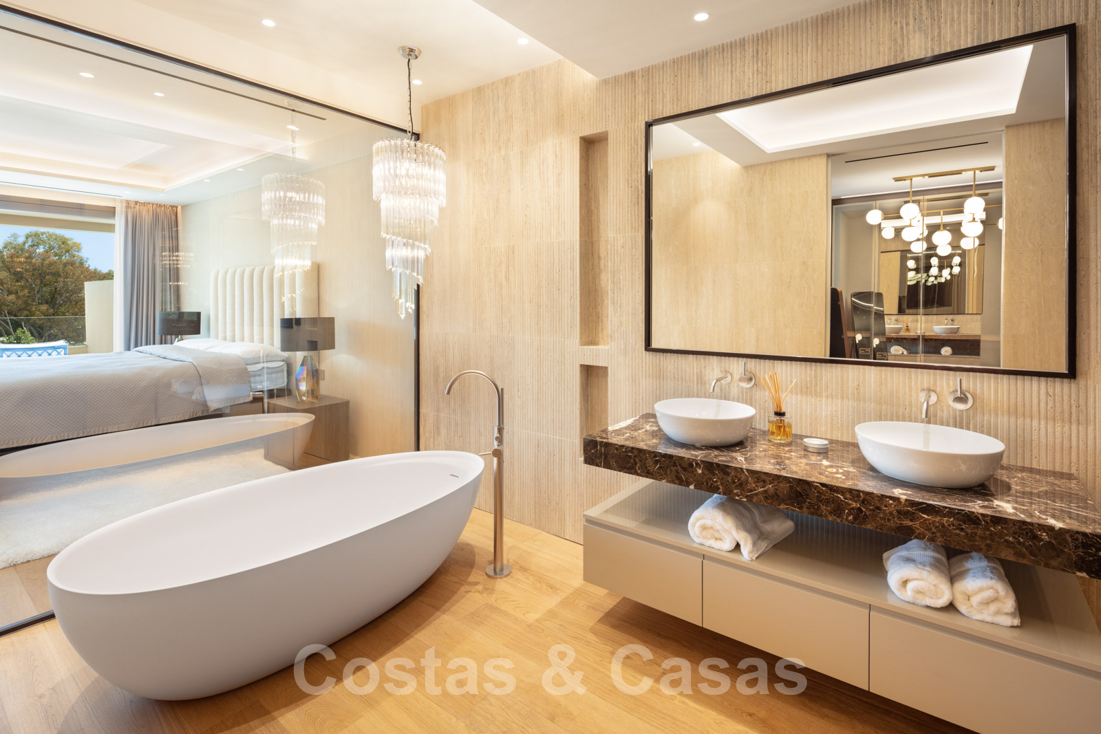 Chambre principale spacieuse, salle de bain avec magnifique baignoire, douche, grand dressing et accès à la terrasse.