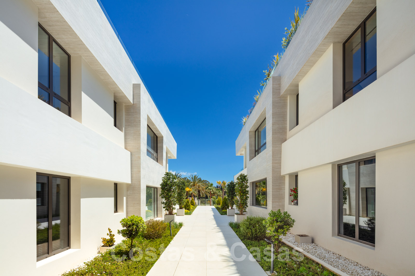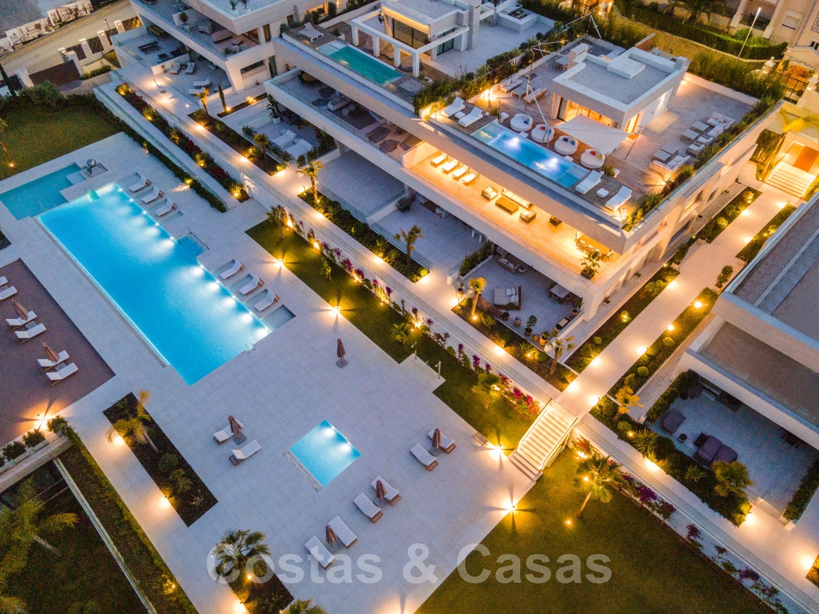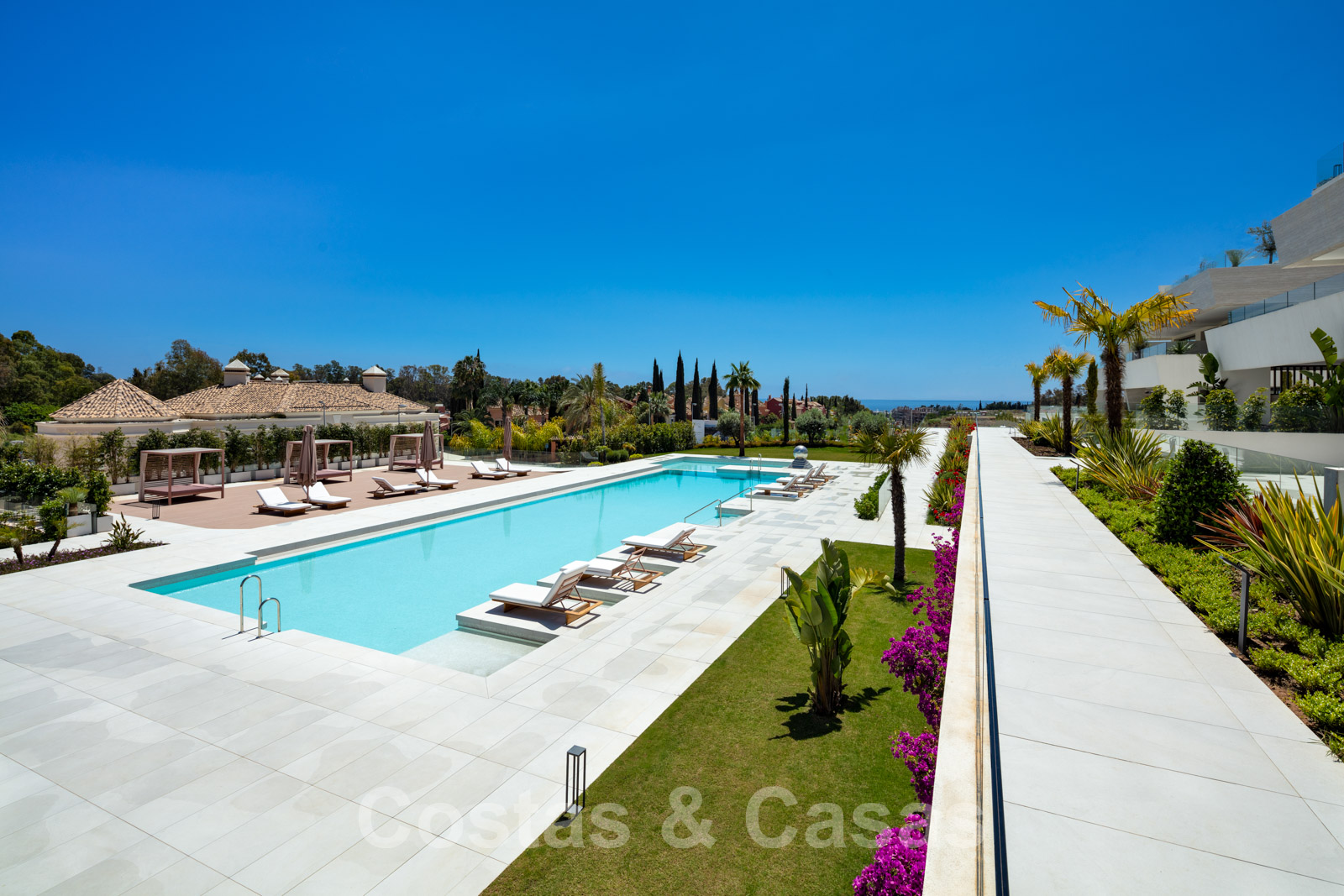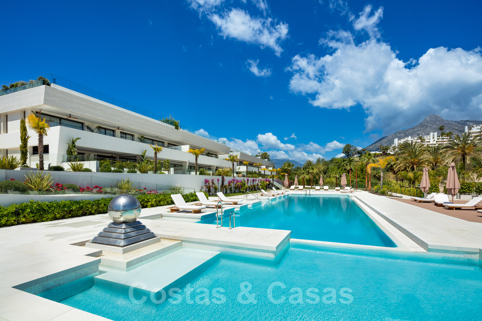 Le complexe résidentiel dispose d'un jardin commun entretenu avec plusieurs piscines, une fontaine et des chaises longues.