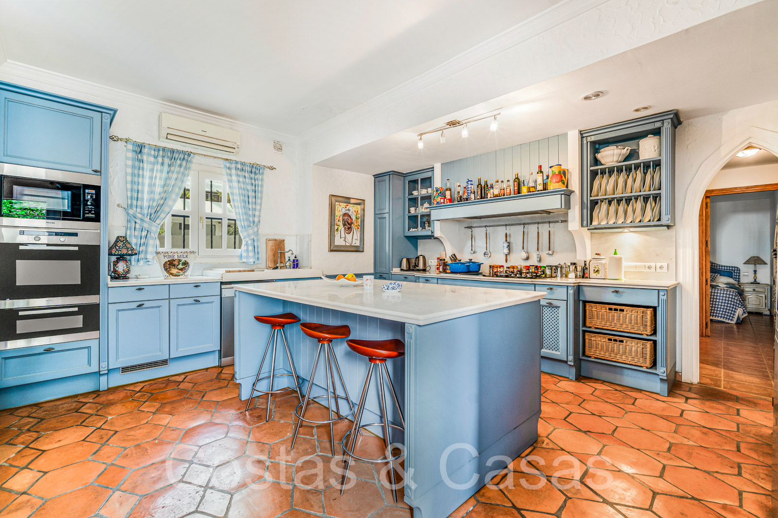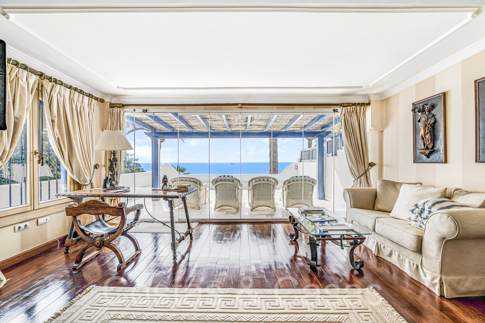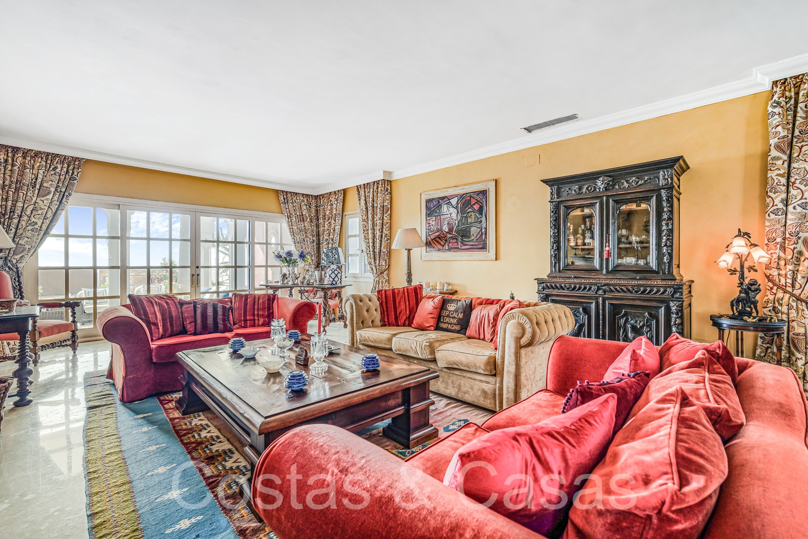 Villa mitoyenne de style andalou traditionnel. Décoration de caractère. Séjour spacieux avec salon TV et coin repas intégré. Cuisine séparée, entièrement équipée d'appareils Miele et avec un îlot central. 2ème chill-out avec cheminée. 6 chambres et 6 salles de bains. Chambre principale avec dressing et salle de bain en suite avec vue mer imprenable. Logement du personnel intérieur. Garage double. Il y a la possibilité de transformer la villa en maison contemporaine.