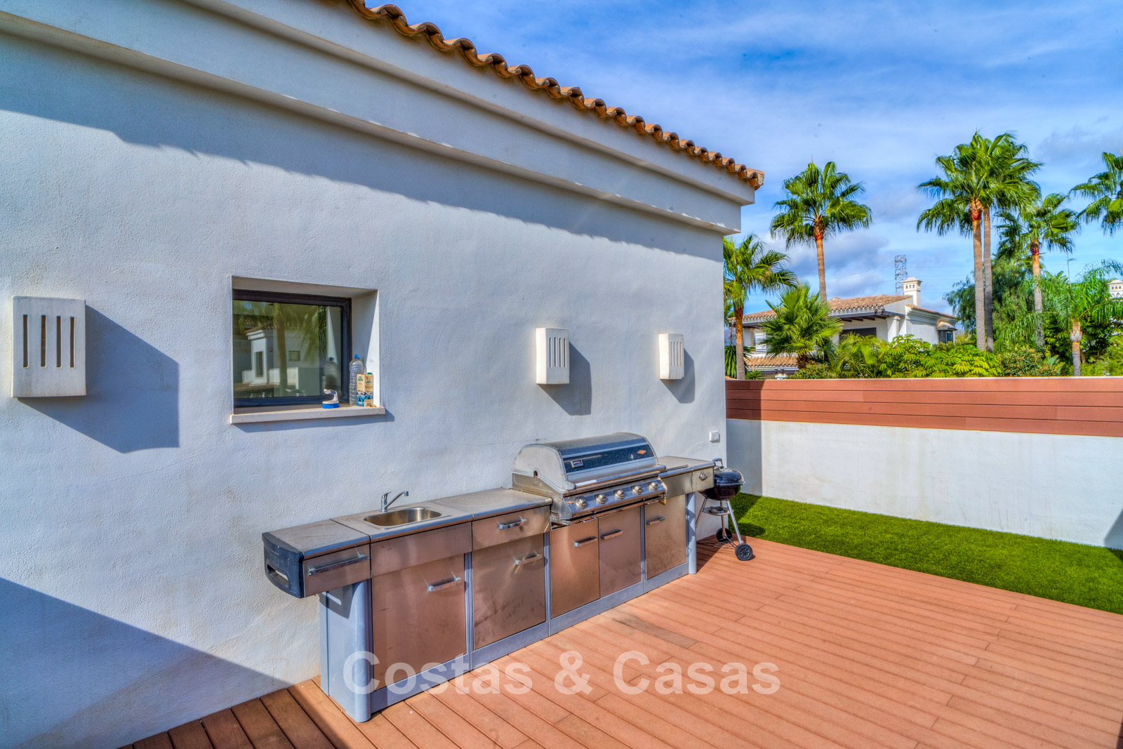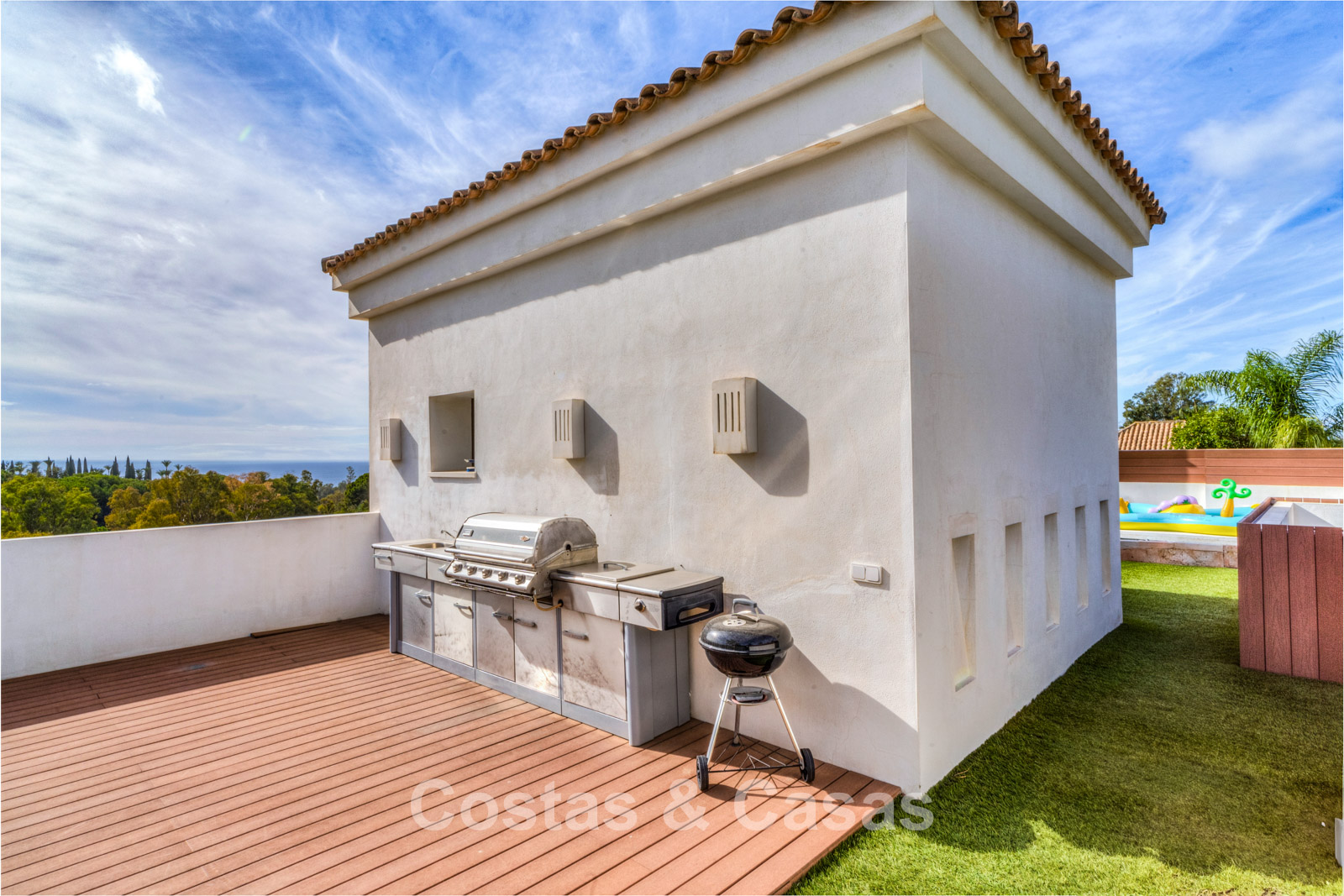 Le terrain est entouré d’une végétation luxuriante, garantissant une grande intimité. L’extérieur bien entretenu comprend de spacieuses terrasses et un espace barbecue paysager avec coin repas, idéal pour dîner en plein air et profiter du climat méditerranéen. Orientation sud. Vue sur les environs et vue partielle sur la mer Méditerranée.
