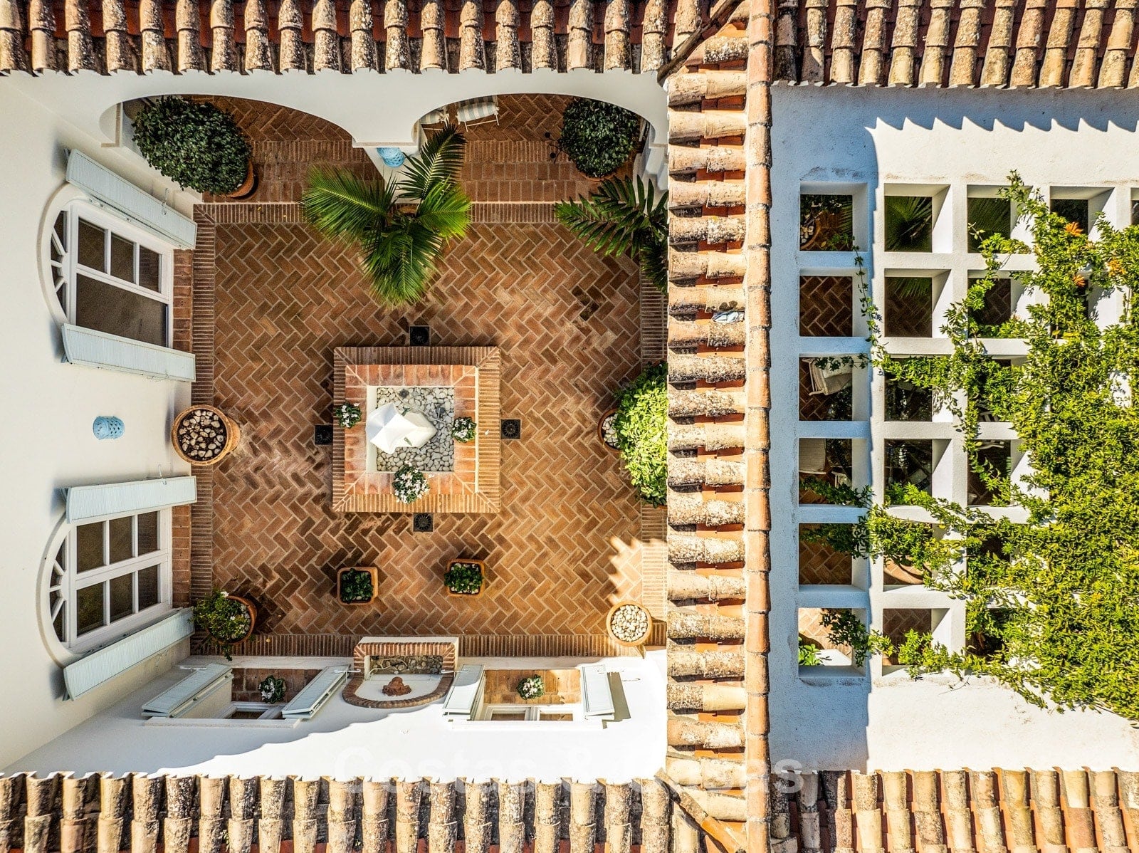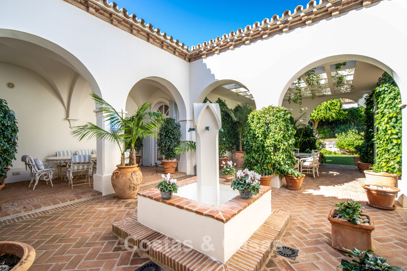 Située sur un terrain spacieux et plat de près de 4 000 m². La villa est entourée d’une végétation luxuriante, offrant l’intimité nécessaire. Une piscine privée entourée d’une terrasse ensoleillée en terre cuite. Au cœur de la villa se trouve un charmant patio andalou, agrémenté d’élégantes décorations et d’une fontaine apaisante, qui créent une atmosphère intemporelle et authentique. Orientation sud-ouest. Vue sur le jardin avec la mer Méditerranée en arrière-plan.