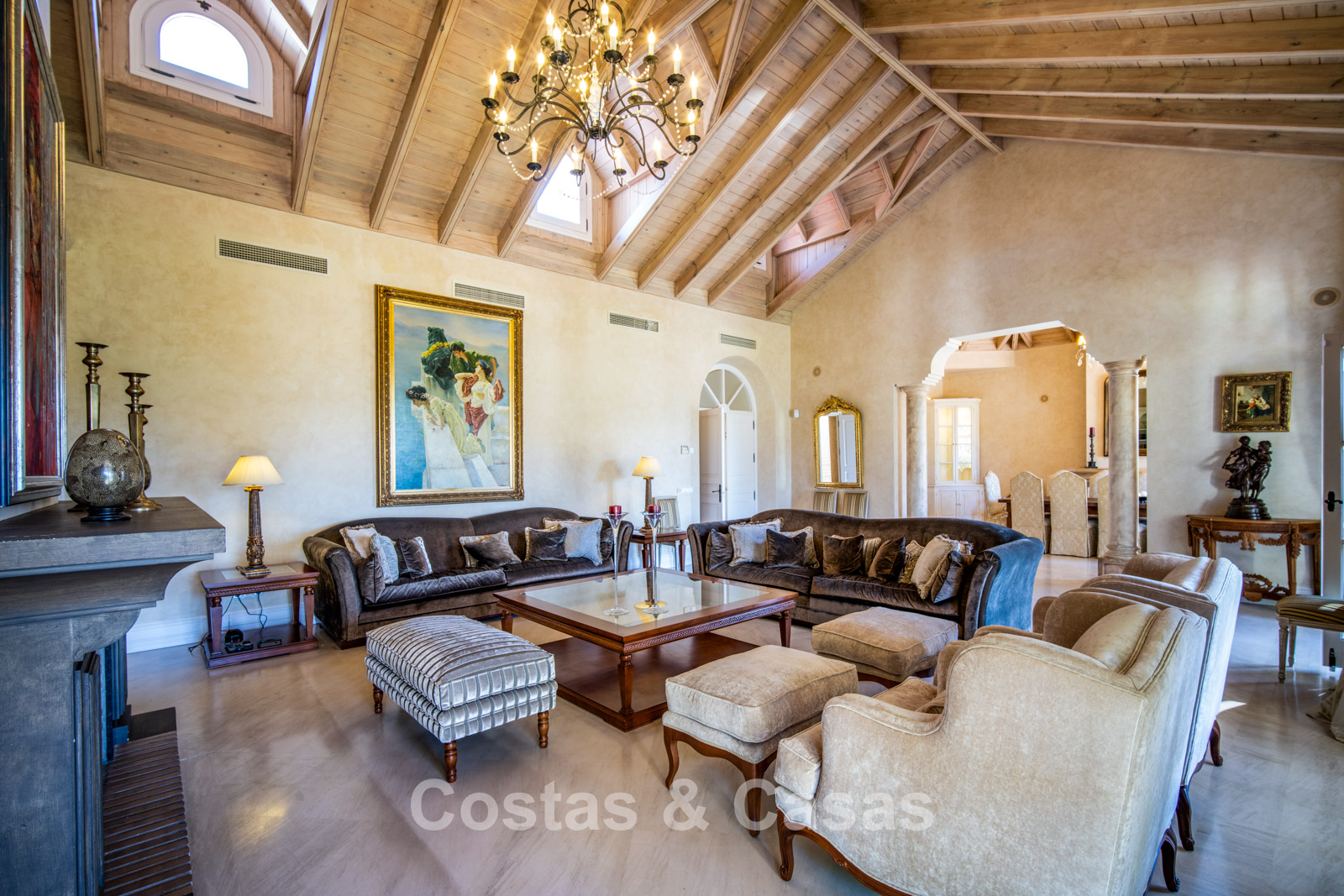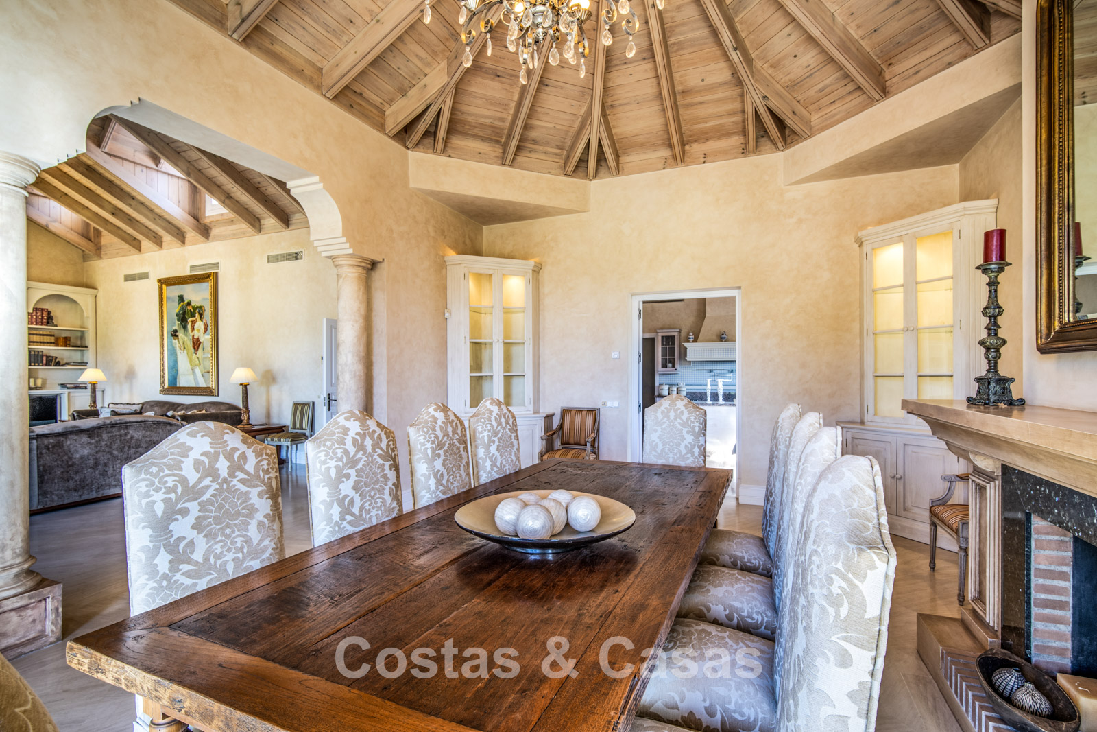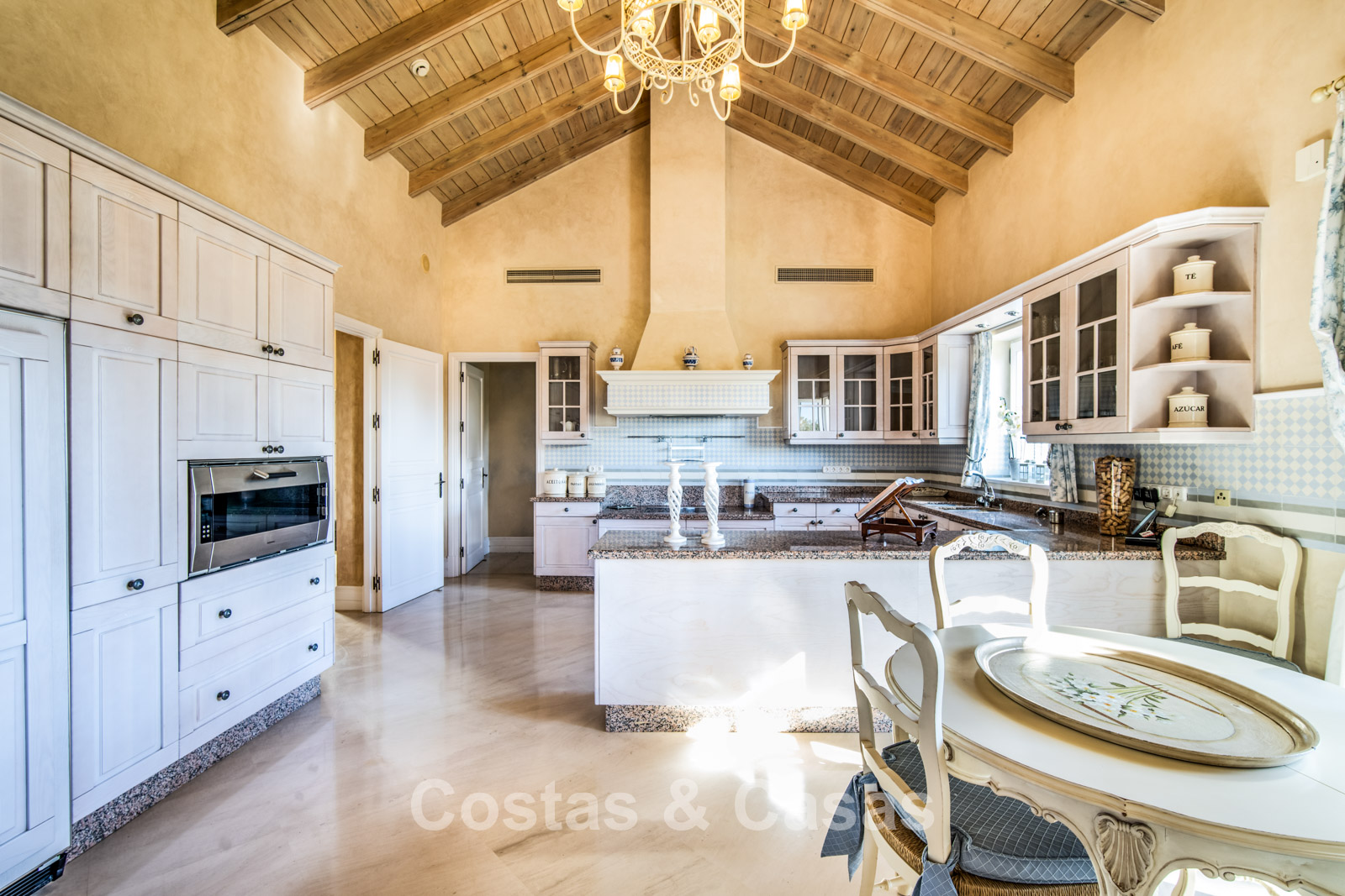 Villa indépendante de style architectural espagnol et méditerranéen. De plain-pied. Finitions avec des matériaux de haute qualité. Avec ses intérieurs classiques, ses hauts plafonds et ses magnifiques poutres apparentes, la villa dégage un charme méditerranéen intemporel. Les fenêtres cintrées à la française et les portes-fenêtres laissent entrer une abondante lumière naturelle. Grand séjour ouvert avec une authentique cheminée à bois. À côté se trouve une salle à manger chaleureuse. Cuisine séparée avec de nombreux rangements, des appareils électroménagers haut de gamme et une double hauteur sous plafond. 5 chambres, 5 salles de bains et 2 toilettes séparées. Espace bureau. Un grand espace multifonctionnel de 130 m² peut être aménagé librement. Sols en marbre de haute qualité. Bodega traditionnelle. Cave à vin. Buanderie. Garage privé pour 2 voitures. Stationnement supplémentaire sur la propriété.