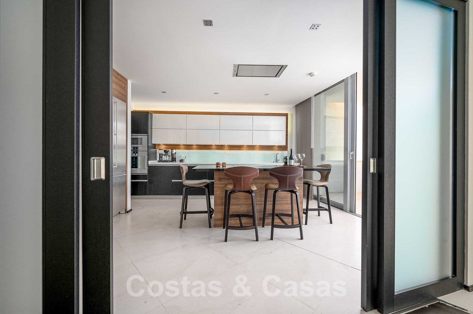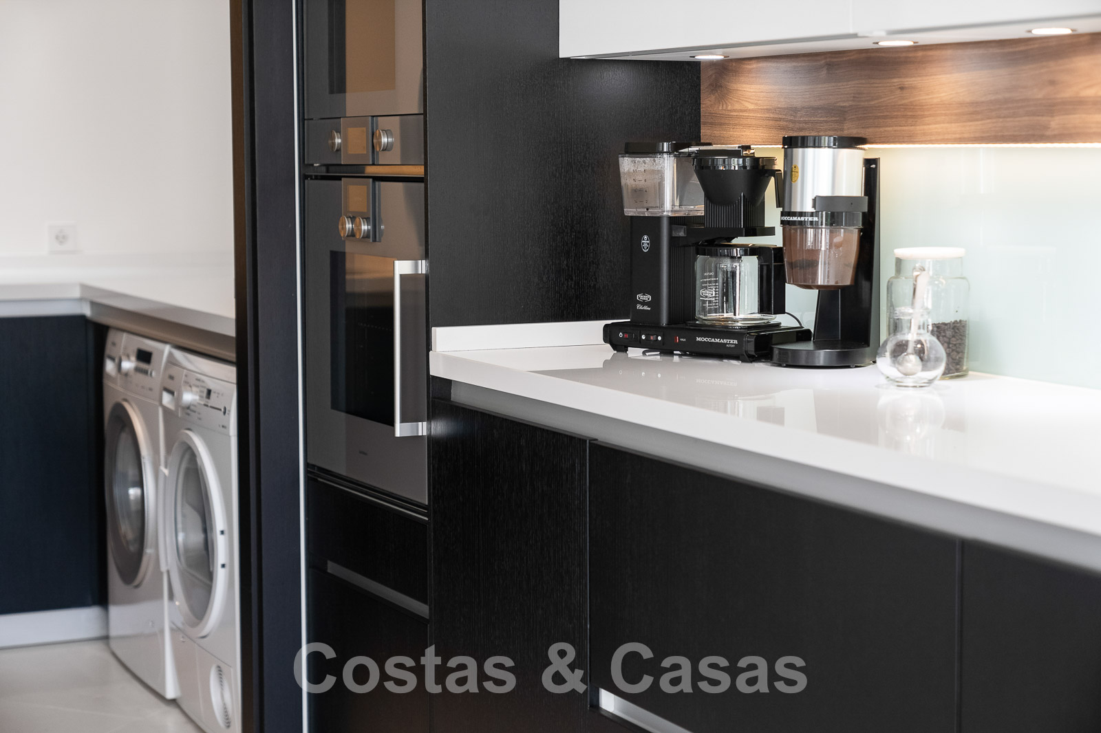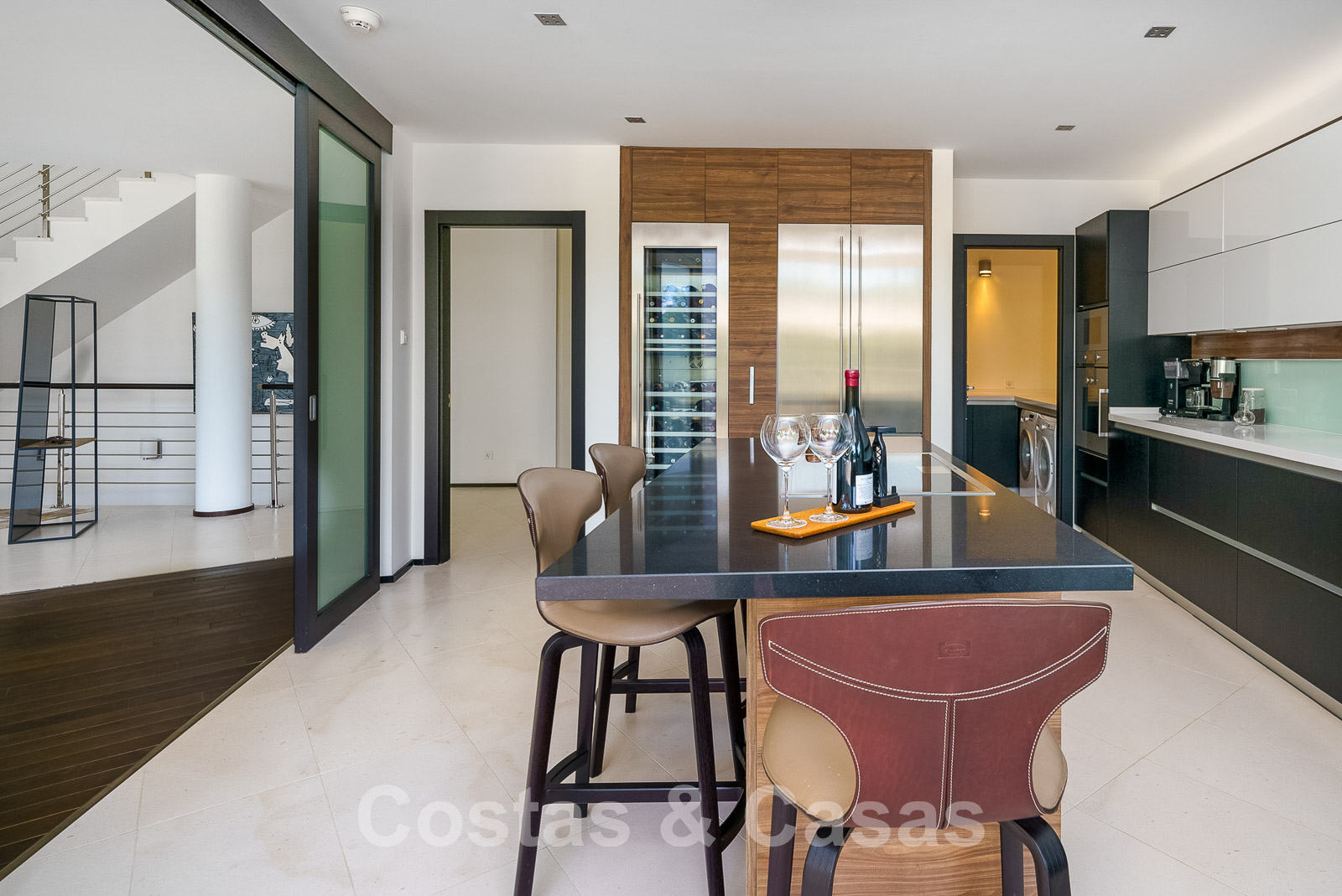 Cuisine design équipée d'un refroidisseur de vin et d'un îlot avec buanderie adjacente.