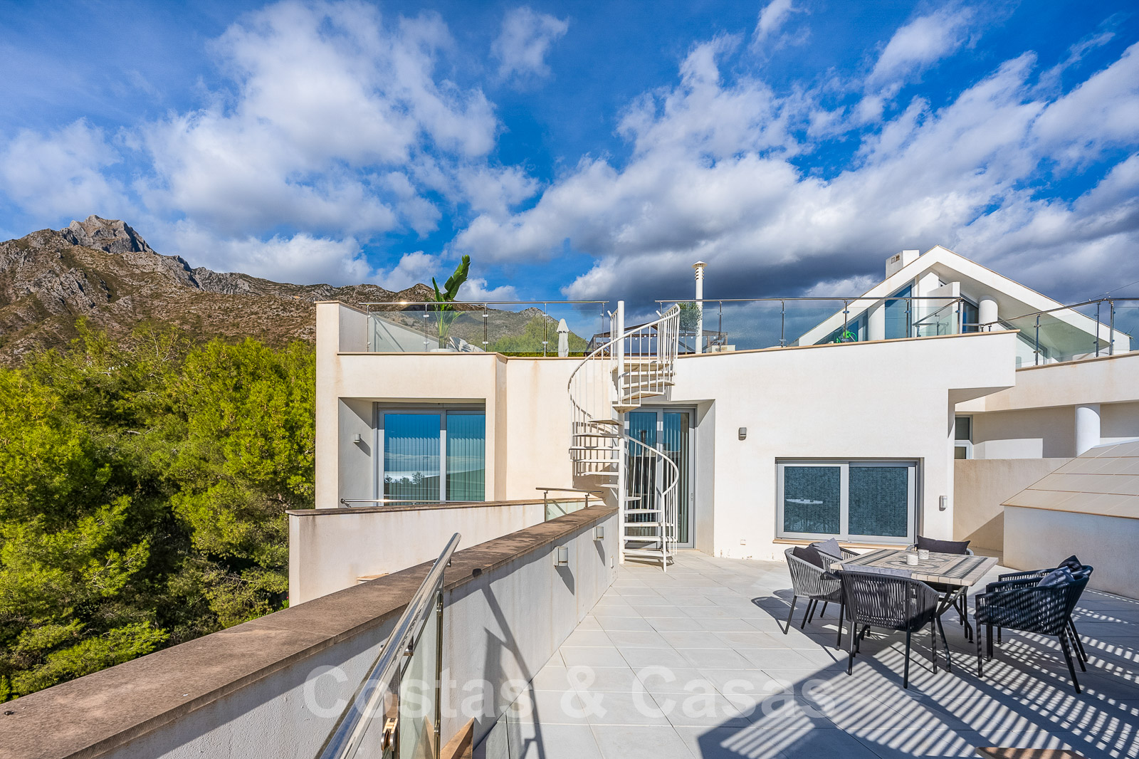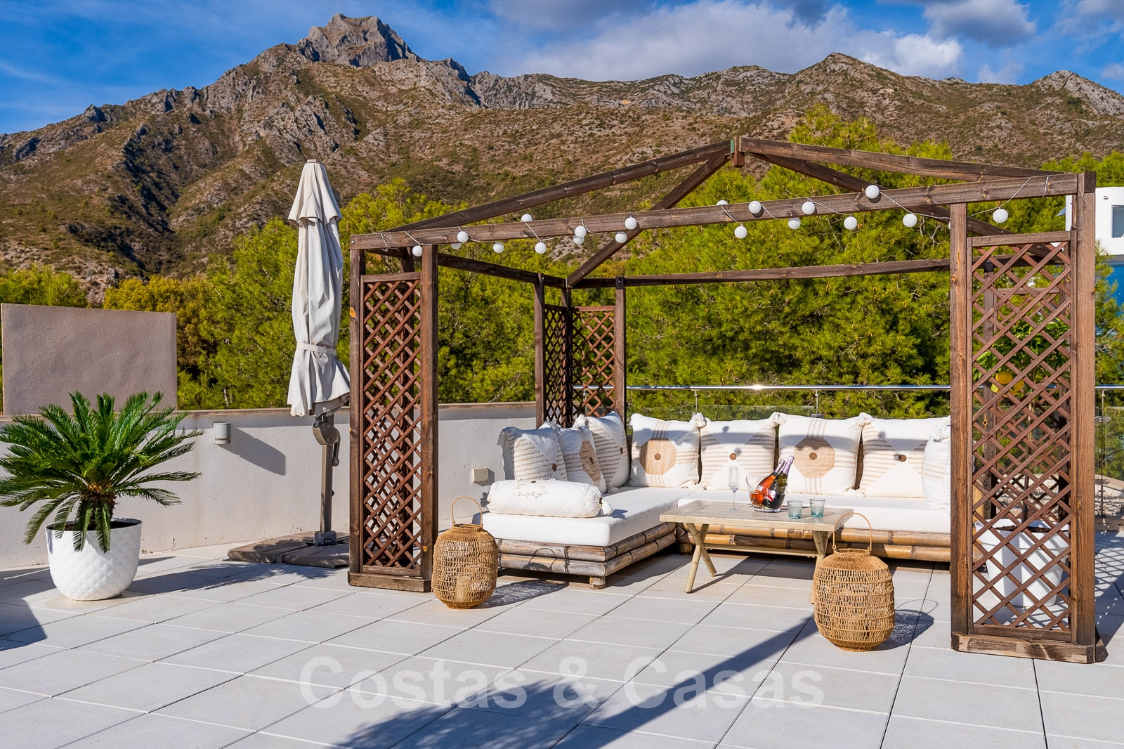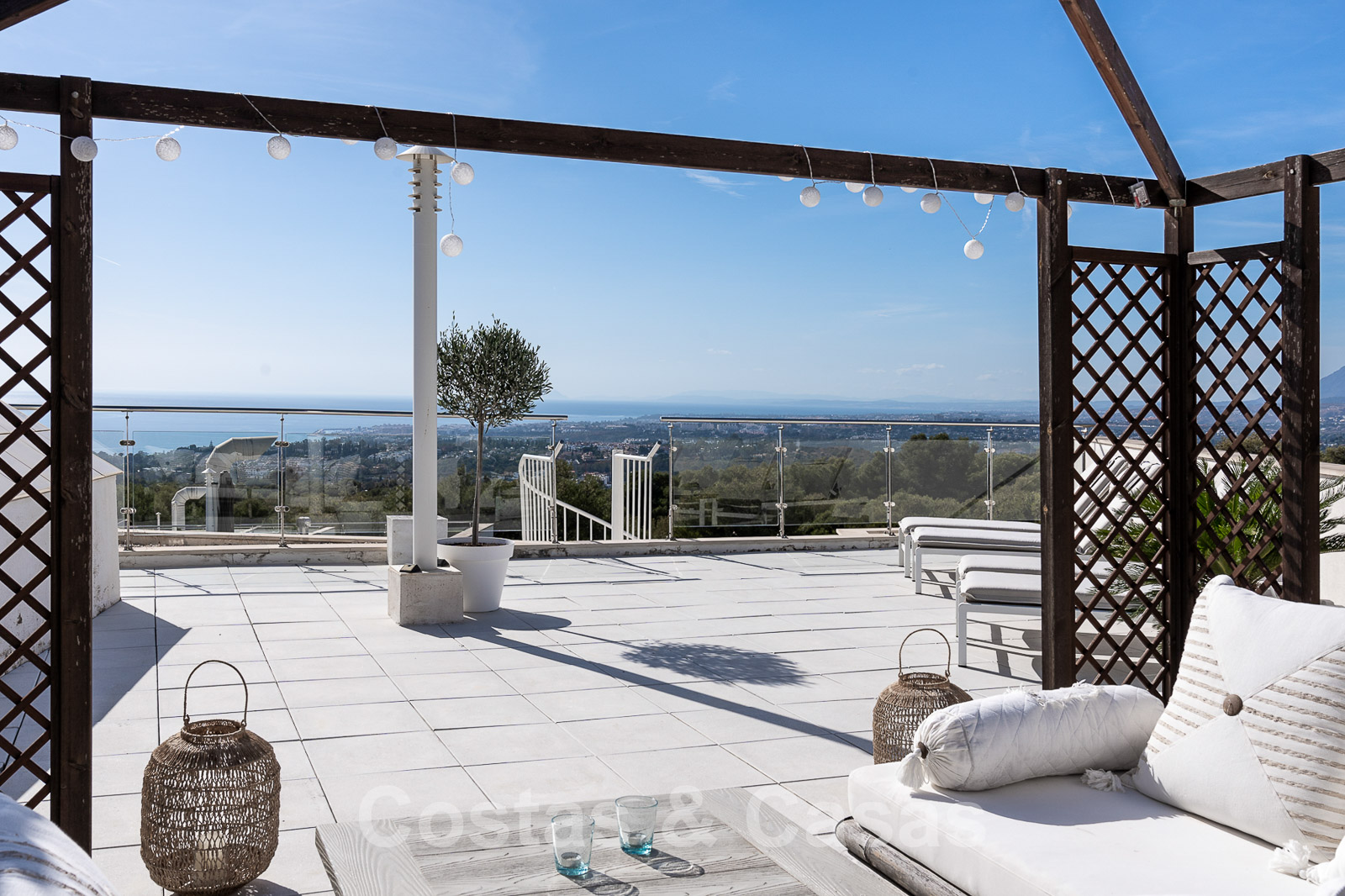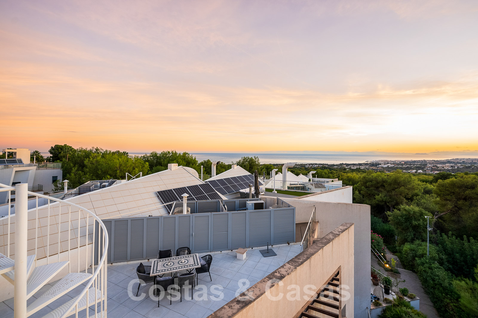 Un escalier extérieur permet d'accéder à un grand solarium doté d'une pergola et d'un espace suffisant pour installer un salon et des chaises longues. De plus, le solarium offre une belle vue sur la mer.