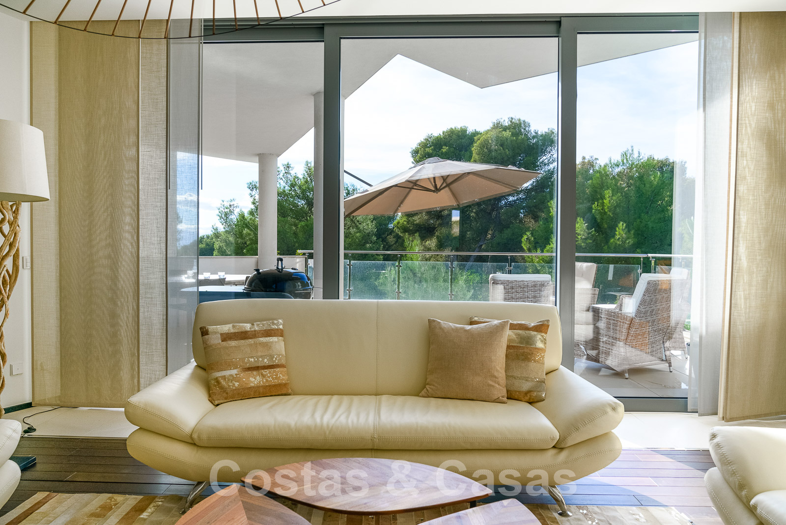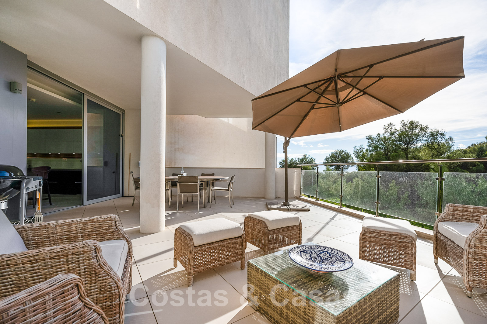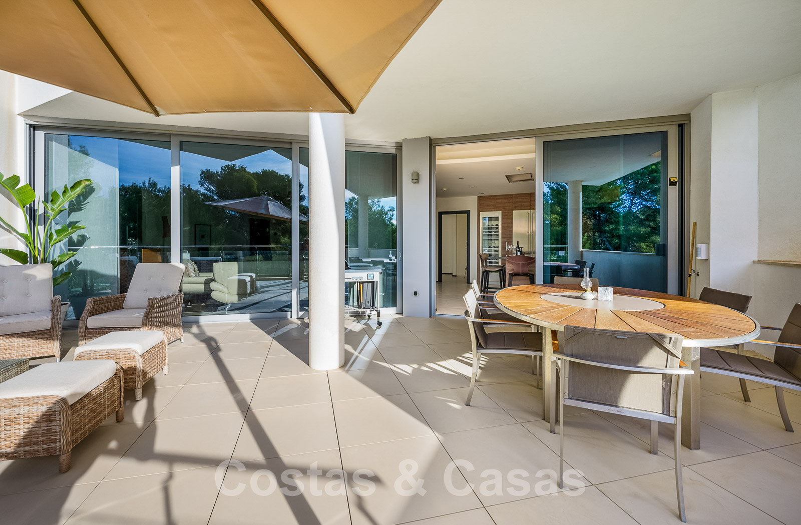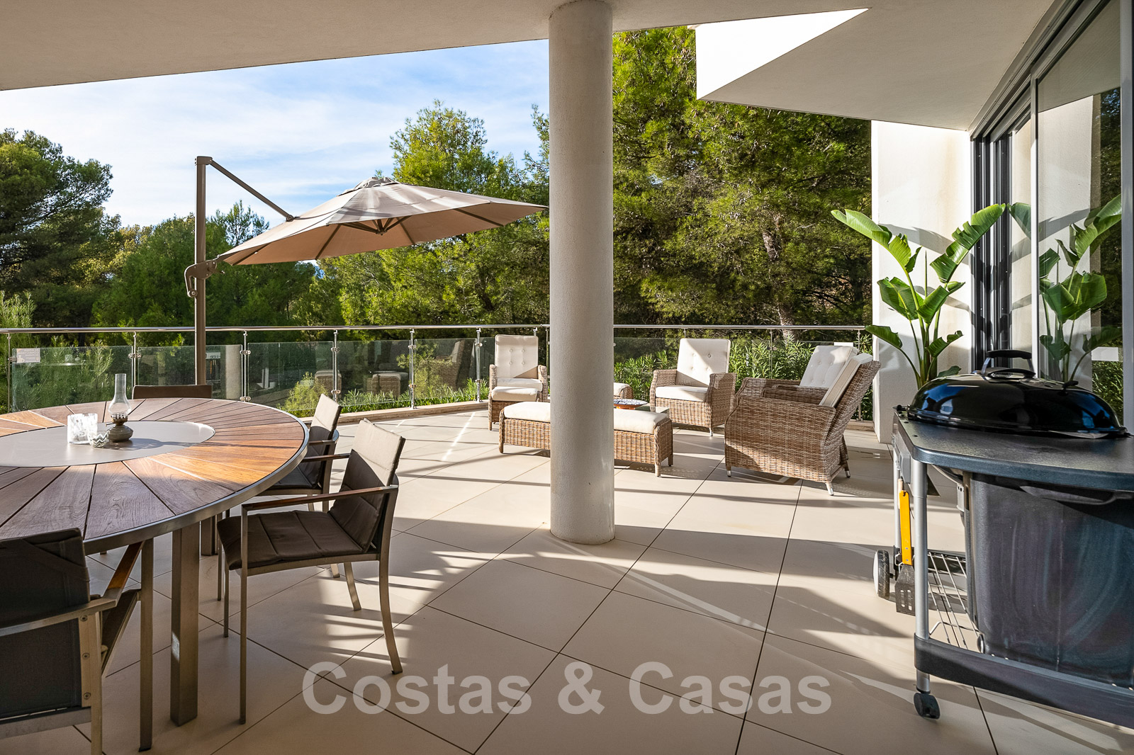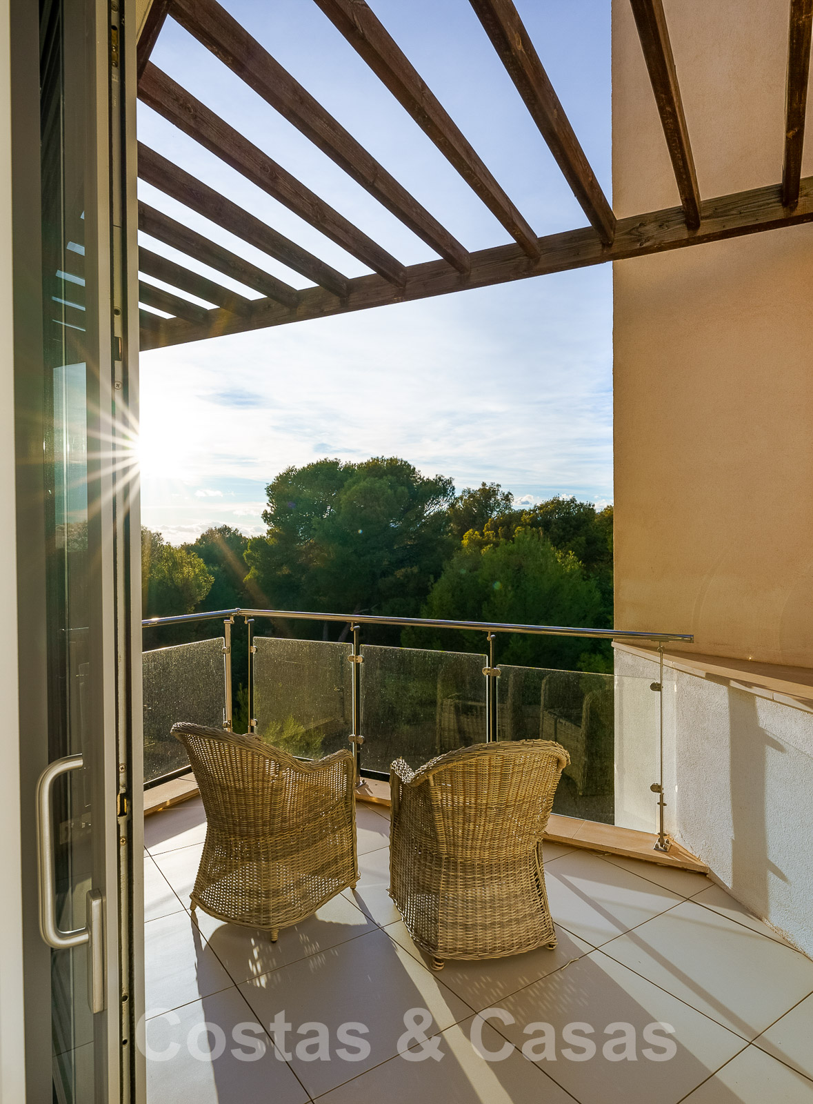 Un escalier extérieur permet d'accéder à un grand solarium doté d'une pergola et d'un espace suffisant pour installer un salon et des chaises longues. De plus, le solarium offre une belle vue sur la mer.