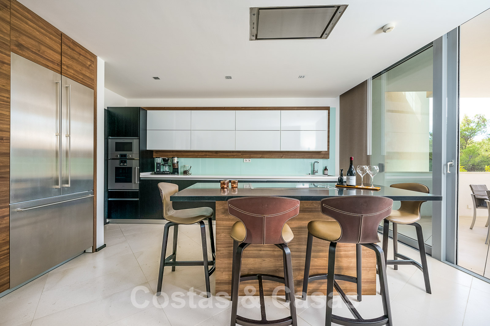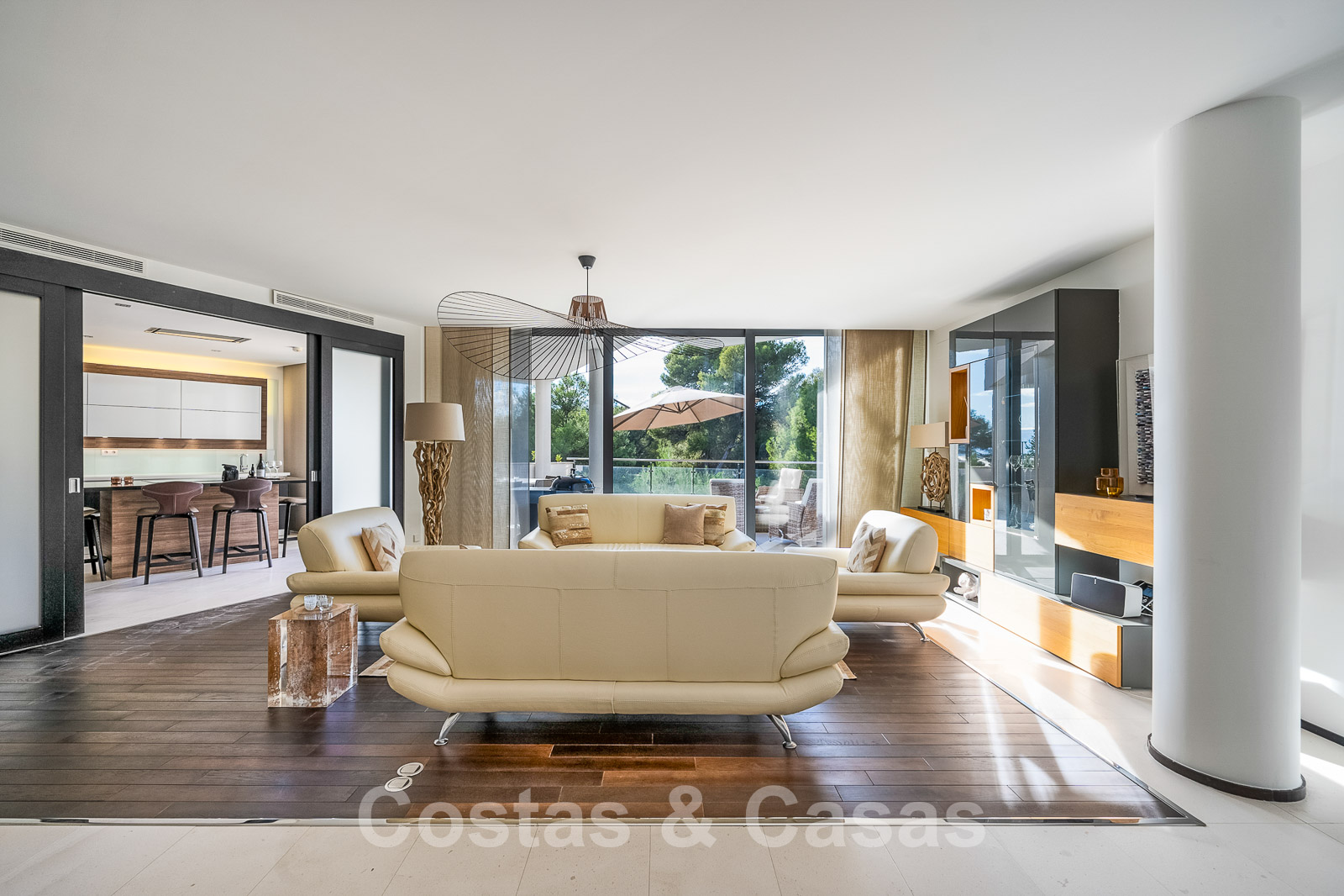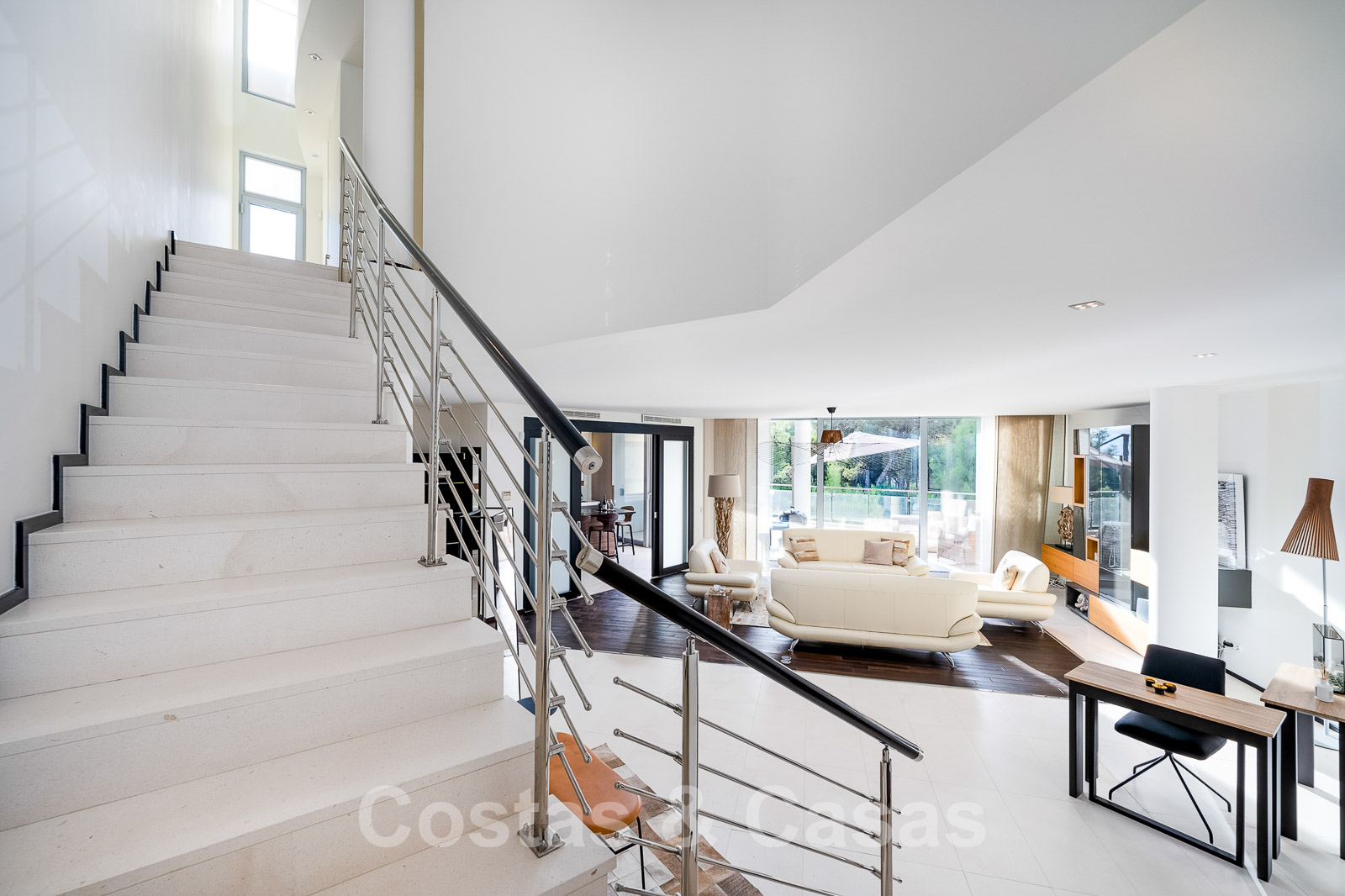 Intérieur lumineux et aéré, composé avec style par une combinaison de matériaux de qualité tels que le bois, la pierre et le marbre.