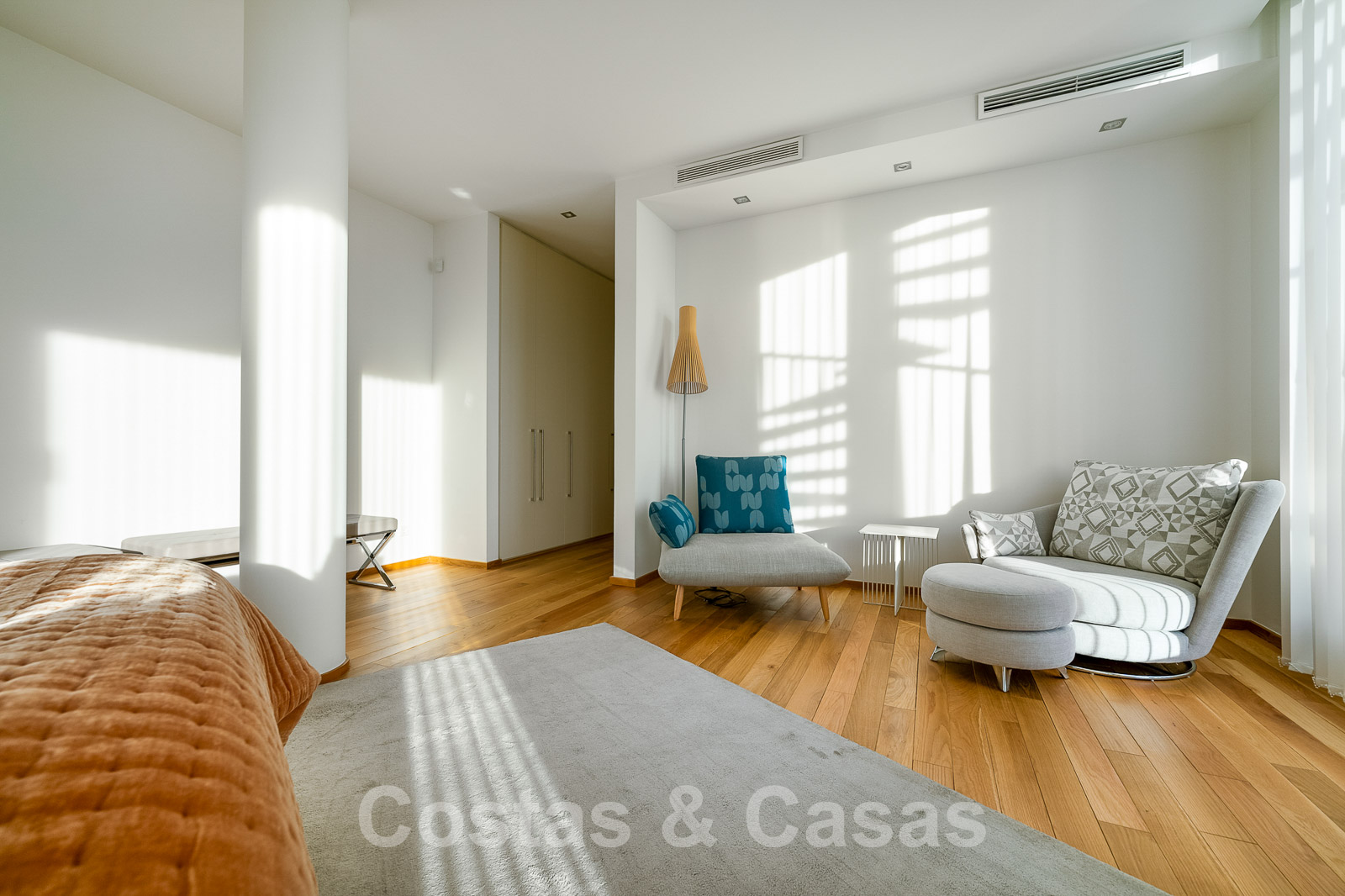 L’étage inférieur a été aménagé avec une chambre en suite et un salon privé adjacent qui peut être séparé de la chambre par des rideaux de verre.
