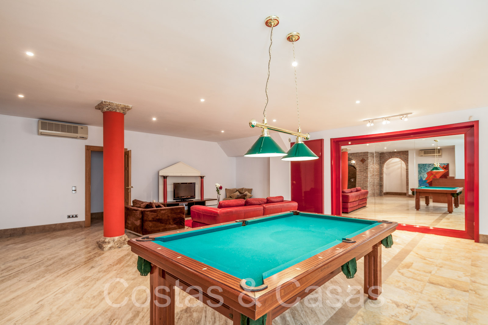 Villa individuelle de style architectural espagnol traditionnel. Peut-être une opportunité d'investissement pour rénover et vendre ou pour une location de vacances. Séjour avec cheminée traditionnelle. Cuisine entièrement équipée avec un espace petit-déjeuner. 5 chambres, 5 salles de bains et 2 toilettes séparées. Bodega à vin. Appartement du personnel intérieur avec kitchenette privée. Salle de jeux spacieuse avec billard et salon TV. Piscine intérieure chauffée avec déshumidificateurs, bain turc, sauna et douche hydromassante. Local technique avec réservoir d'eau. Débarras. Buanderie. Parking privé pour 1 voiture.