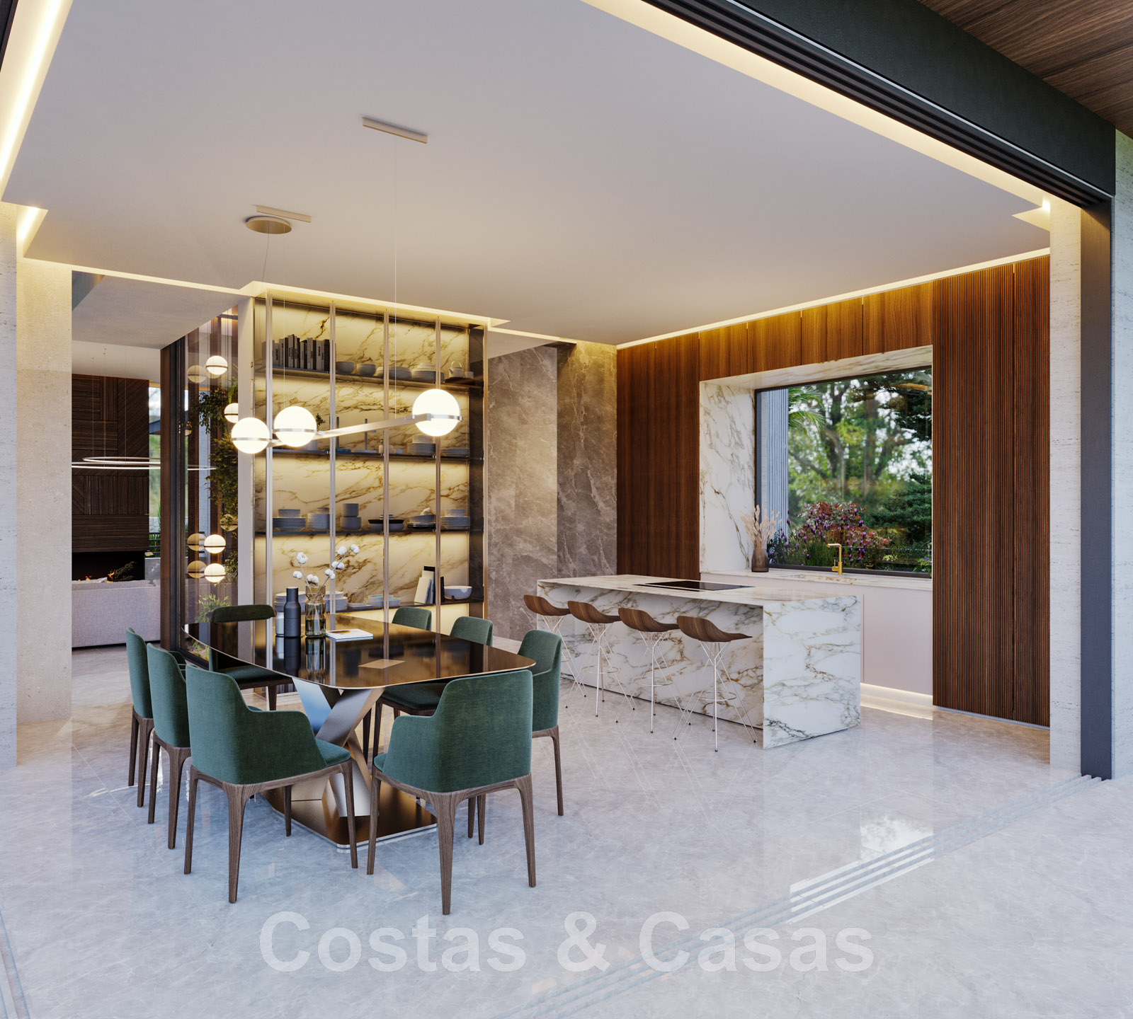 Une terrasse pergola attenante équipée d'une cuisine extérieure et d'un coin repas.