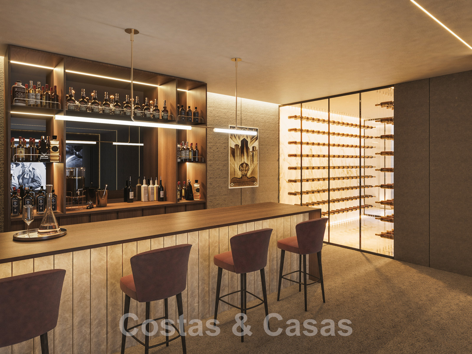 Salle de divertissement moderne avec bar et home cinéma.