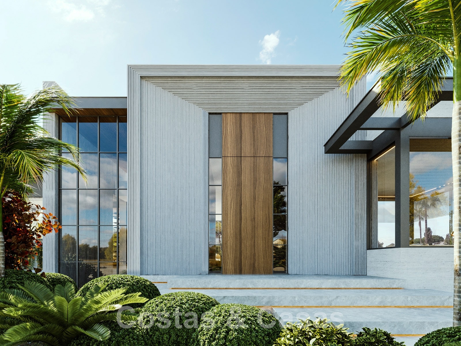 Accès piéton vers l'entrée par des marches en porcelaine.
