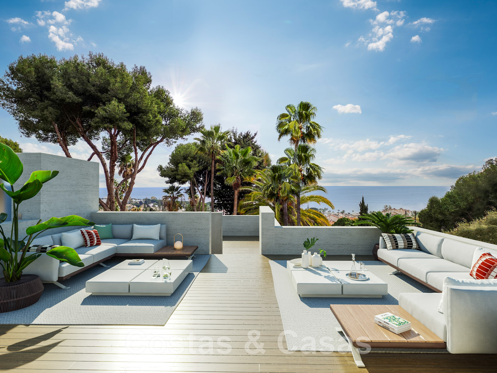 Solarium équipé d'un coin salon et d'une pré-installation pour un jacuzzi.