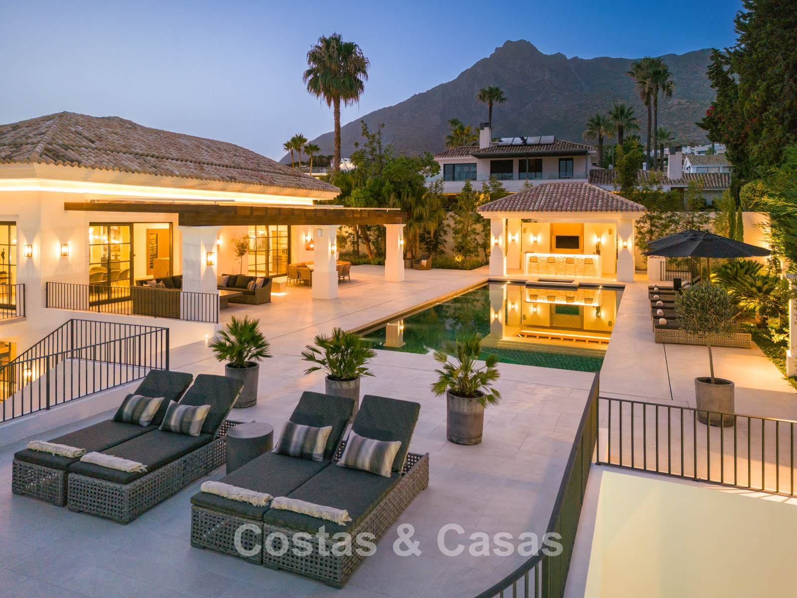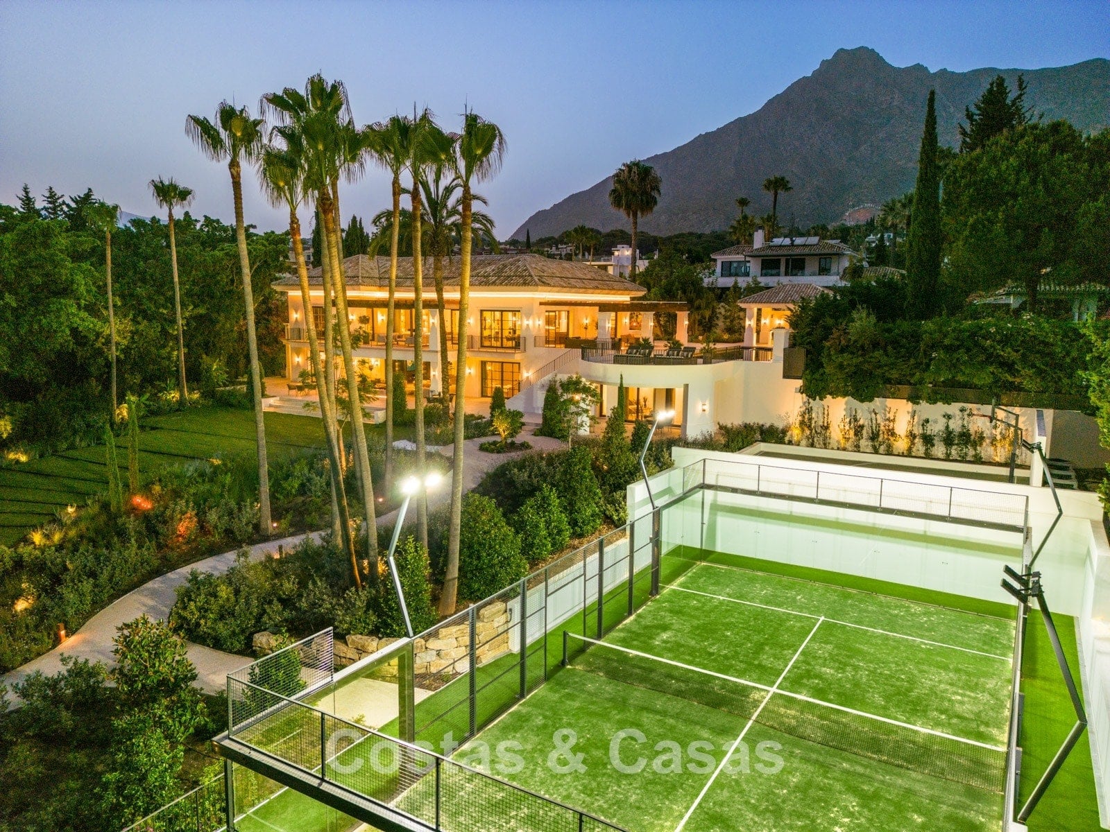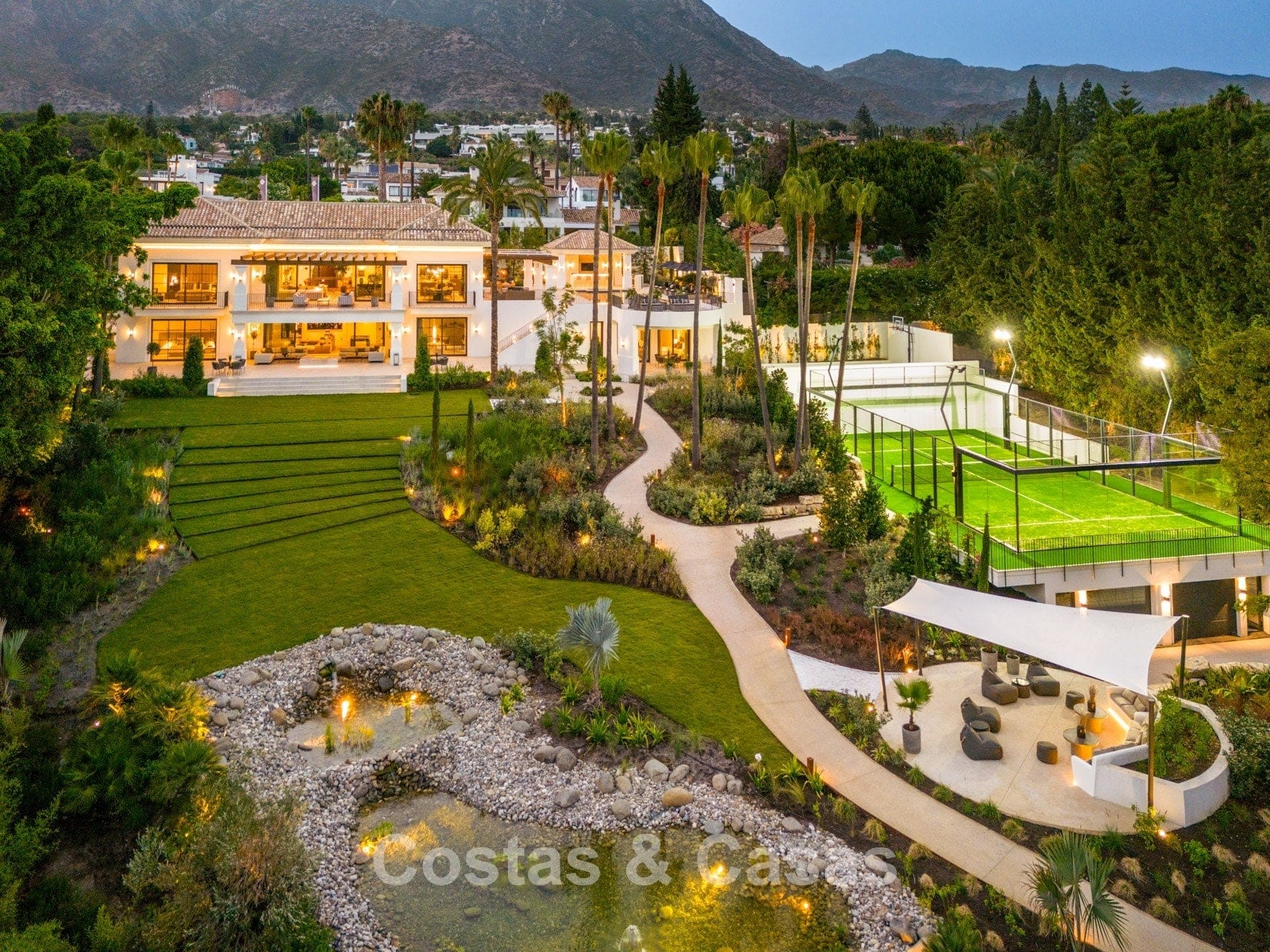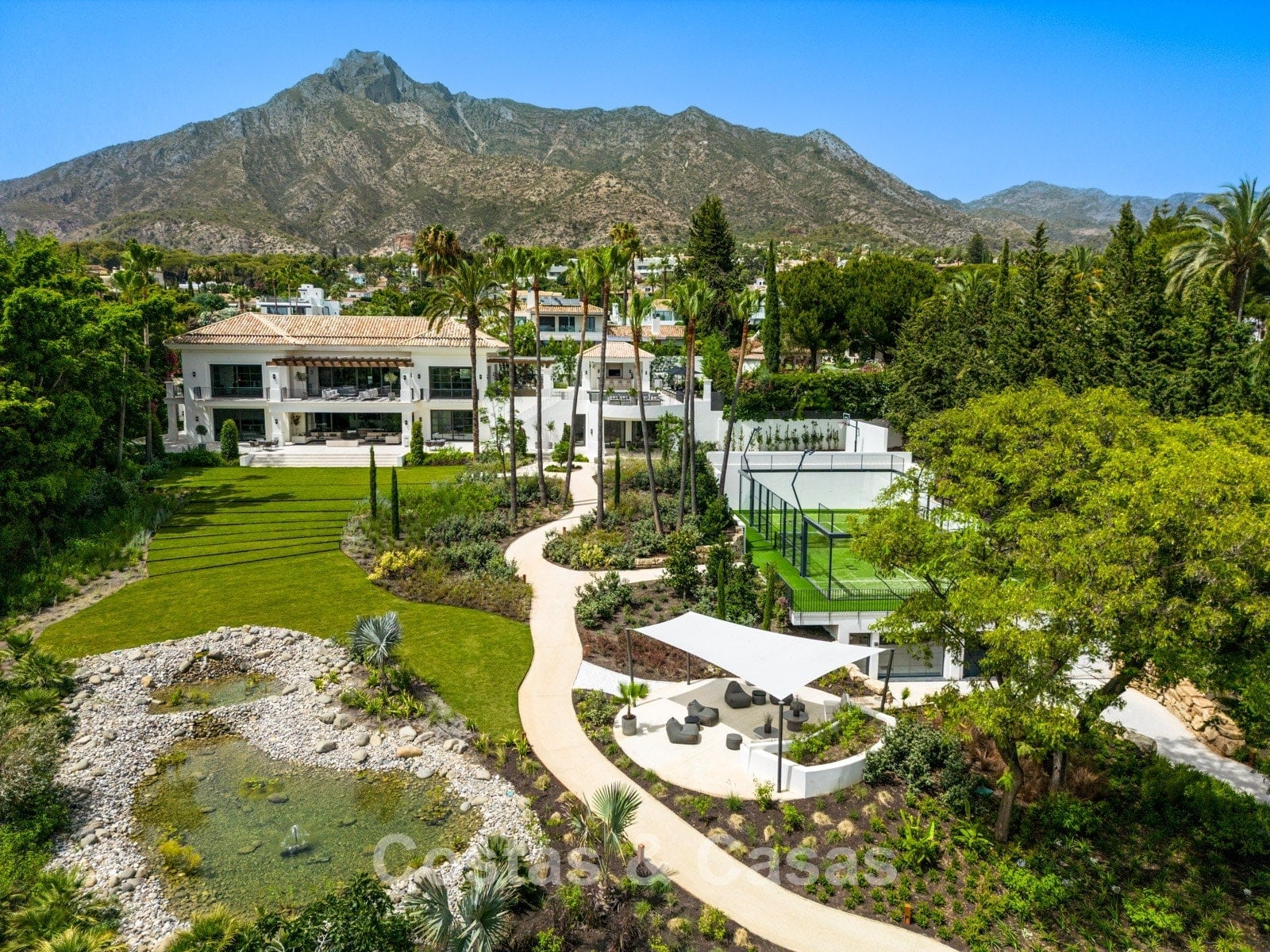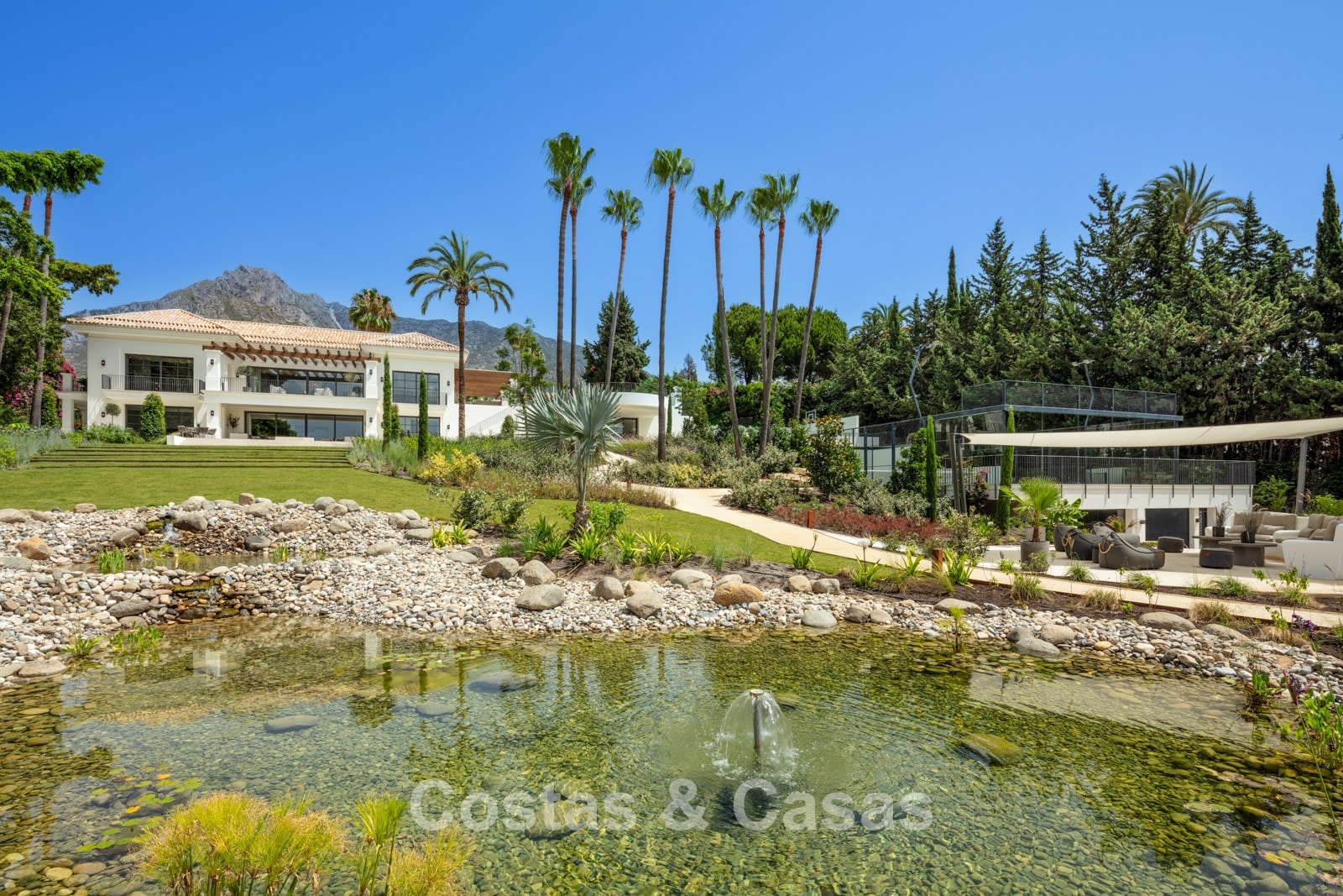 Un terrain spacieux et en pente de 6.043m², entièrement clôturé. Extérieur bien entretenu avec beaucoup de verdure, des massifs fleuris aménagés, des sentiers, des jeux d'eau et un étang. En partie basse, il y a un 2ème accès pour les invités avec une place de parking et un chemin pour buggy jusqu'à la maison. Terrain de pétanque. Piscine d'eau salée géante et chauffée de 17 x 6,50 m avec jacuzzi intégré avec hydromassage et fenêtre sous-marine qui éclaire la zone SPA. Pool house avec bar, cuisine entièrement équipée avec barbecue, douche et toilette. Plusieurs coins salon et salle à manger extérieurs. Propre court de padel et un demi-terrain de basket. Orientée sud avec une belle vue sur les montagnes et la mer. Construit dans une architecture méditerranéenne moderne. Style d'intérieur contemporain élégant et chaleureux.